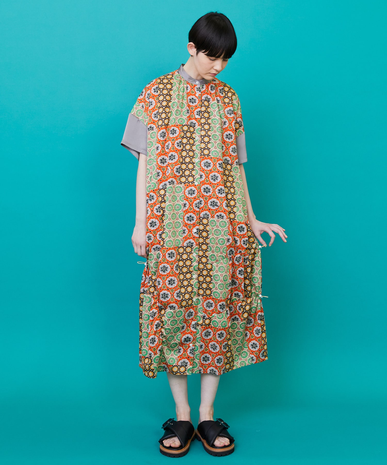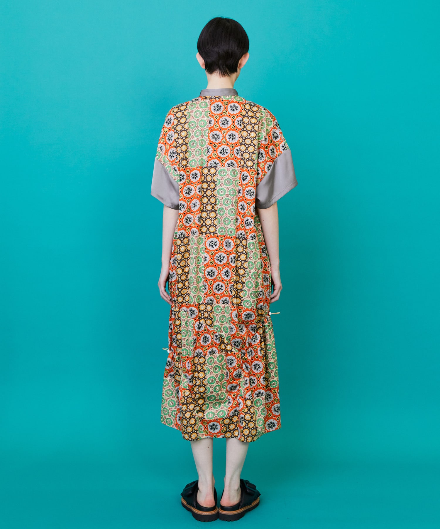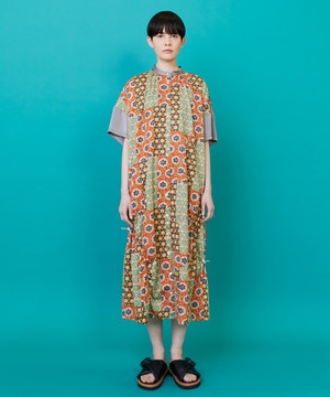 衿元にギャザーを入れて膨らみを持たせたゆったりシルエットのワンピースは裾に入ったコードゴムを絞ることにより独特のシルエットをつくっています。