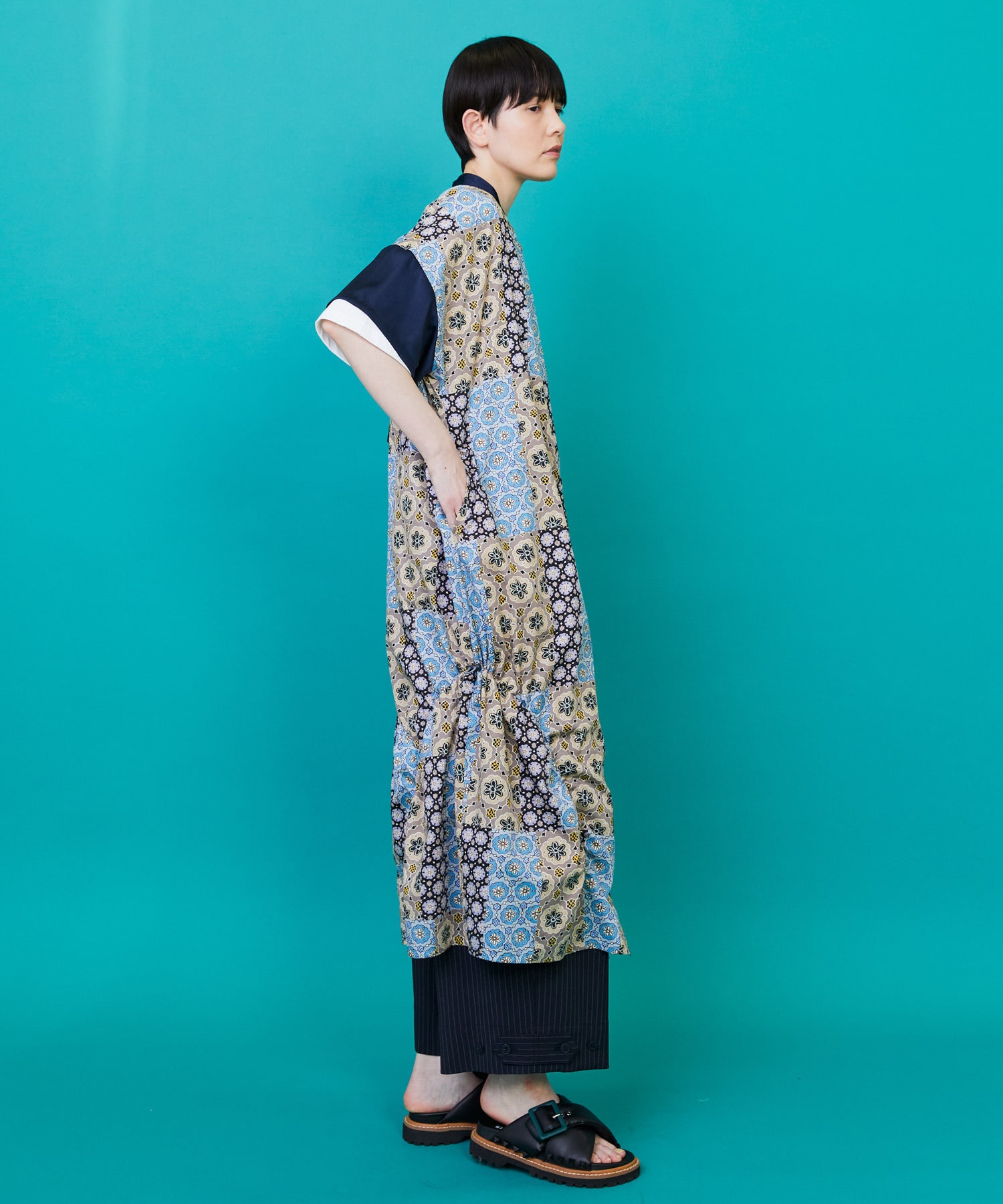 アクセントで無地のしなやかさに落ち感のある素材を組み合わせています。