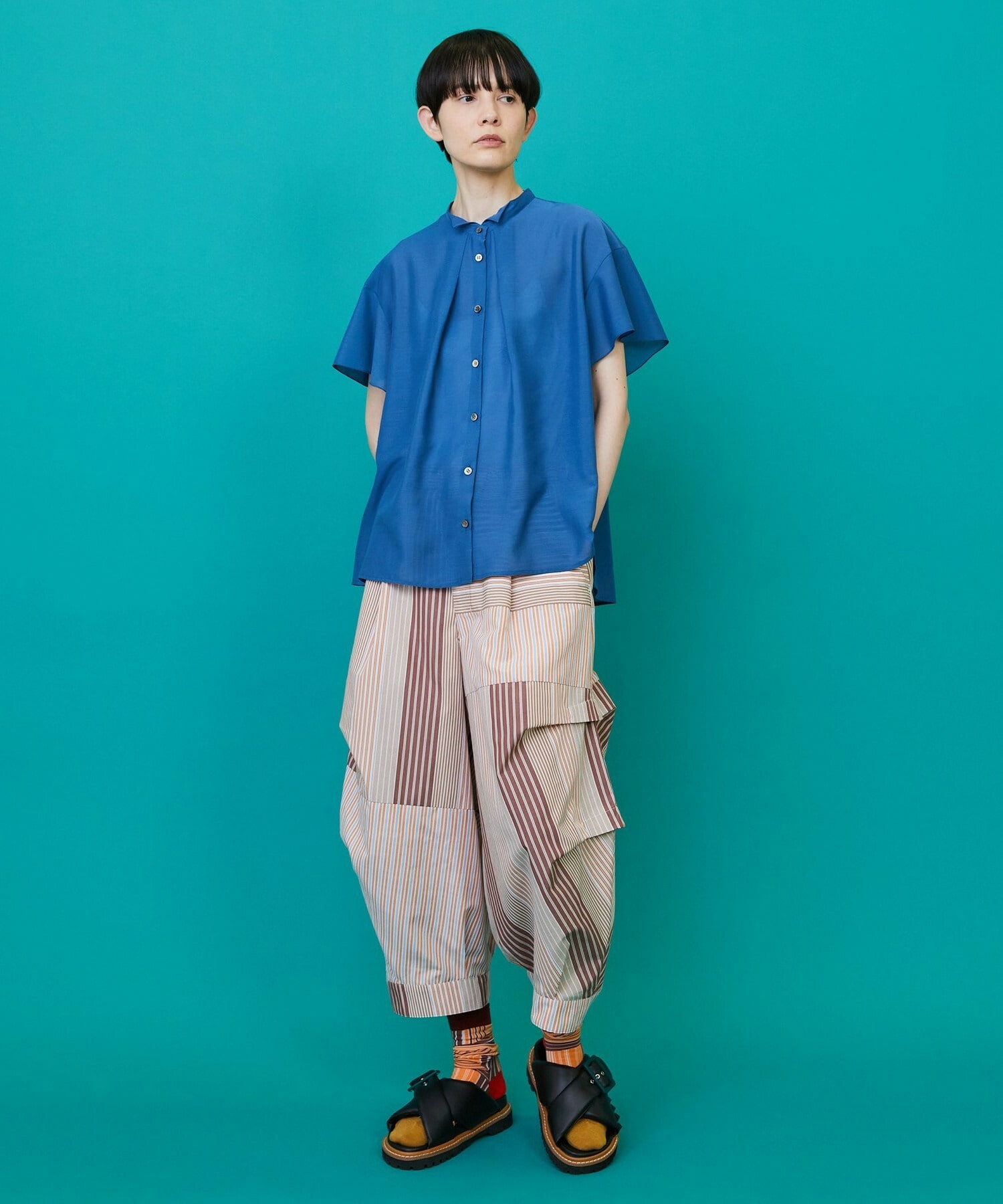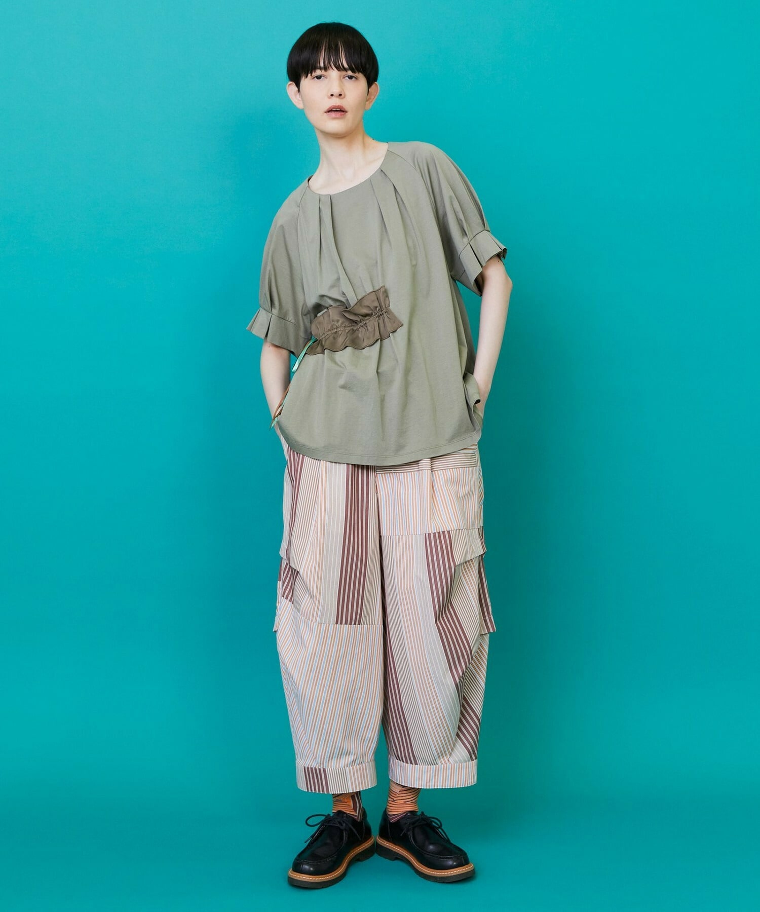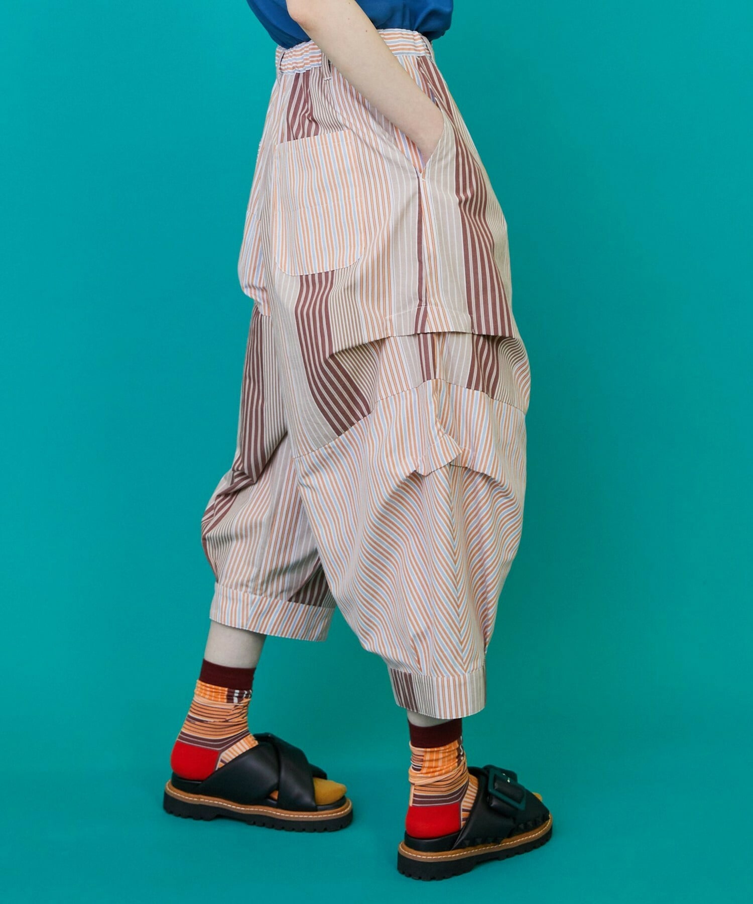 ゆったりとしたバレルシルエットの短丈パンツはサイドのタックや裾のタックで立体的で複雑なシルエットに仕上がっています。