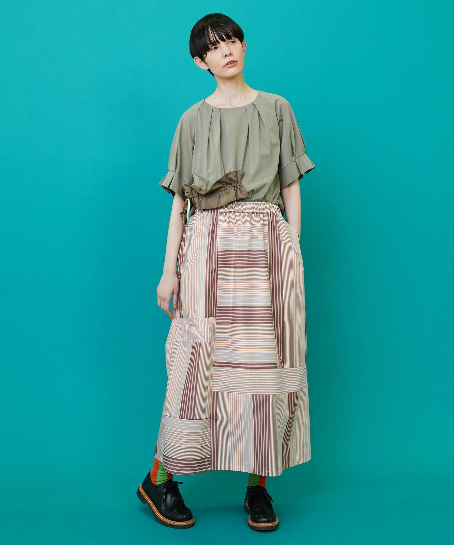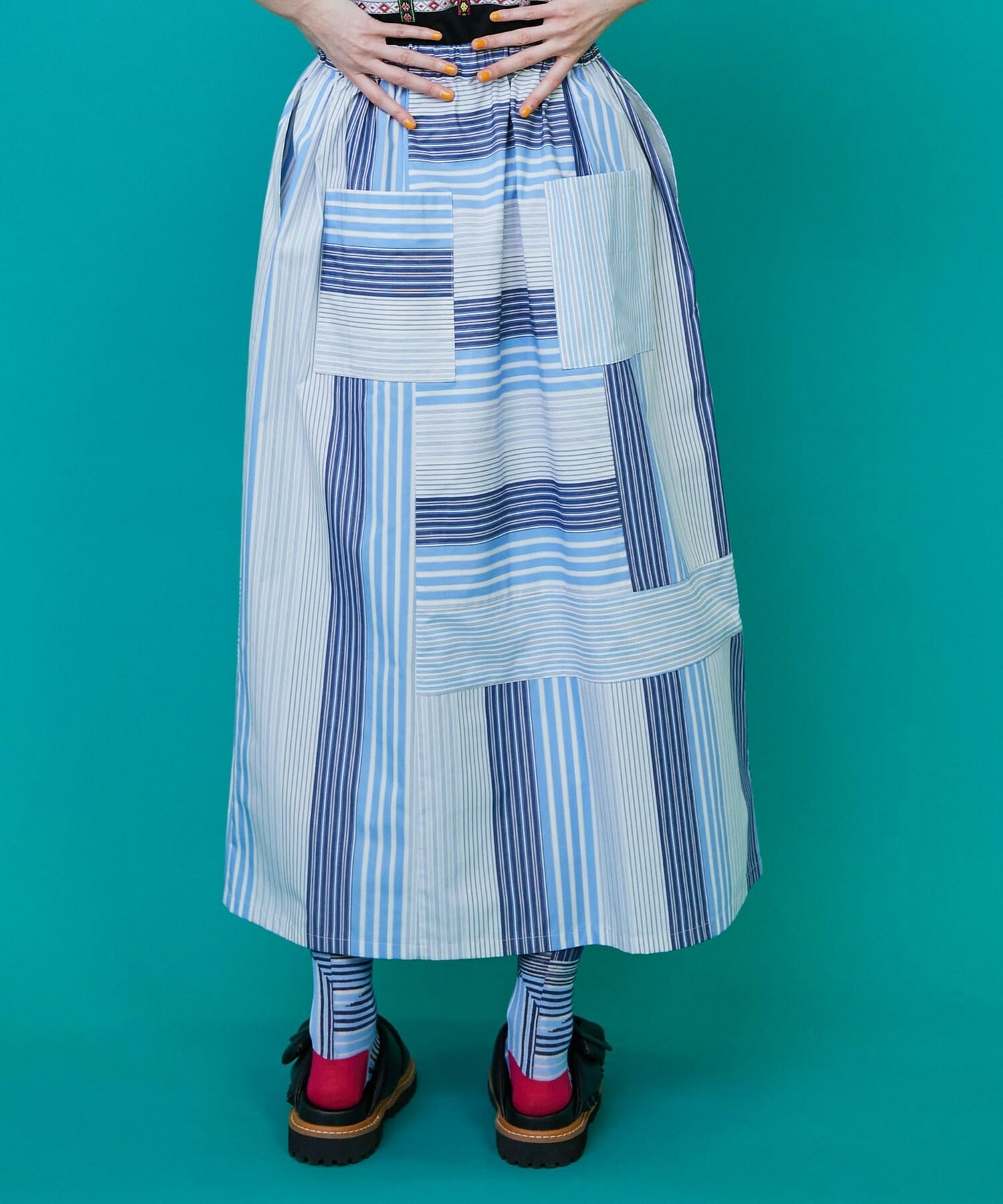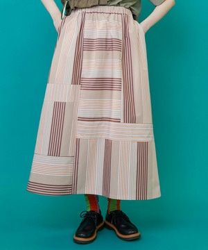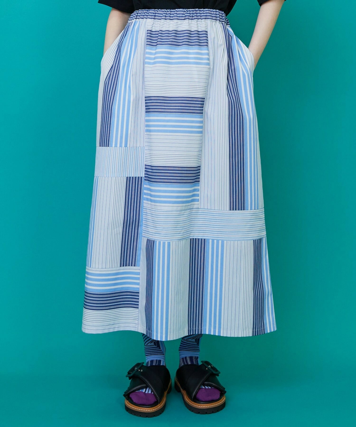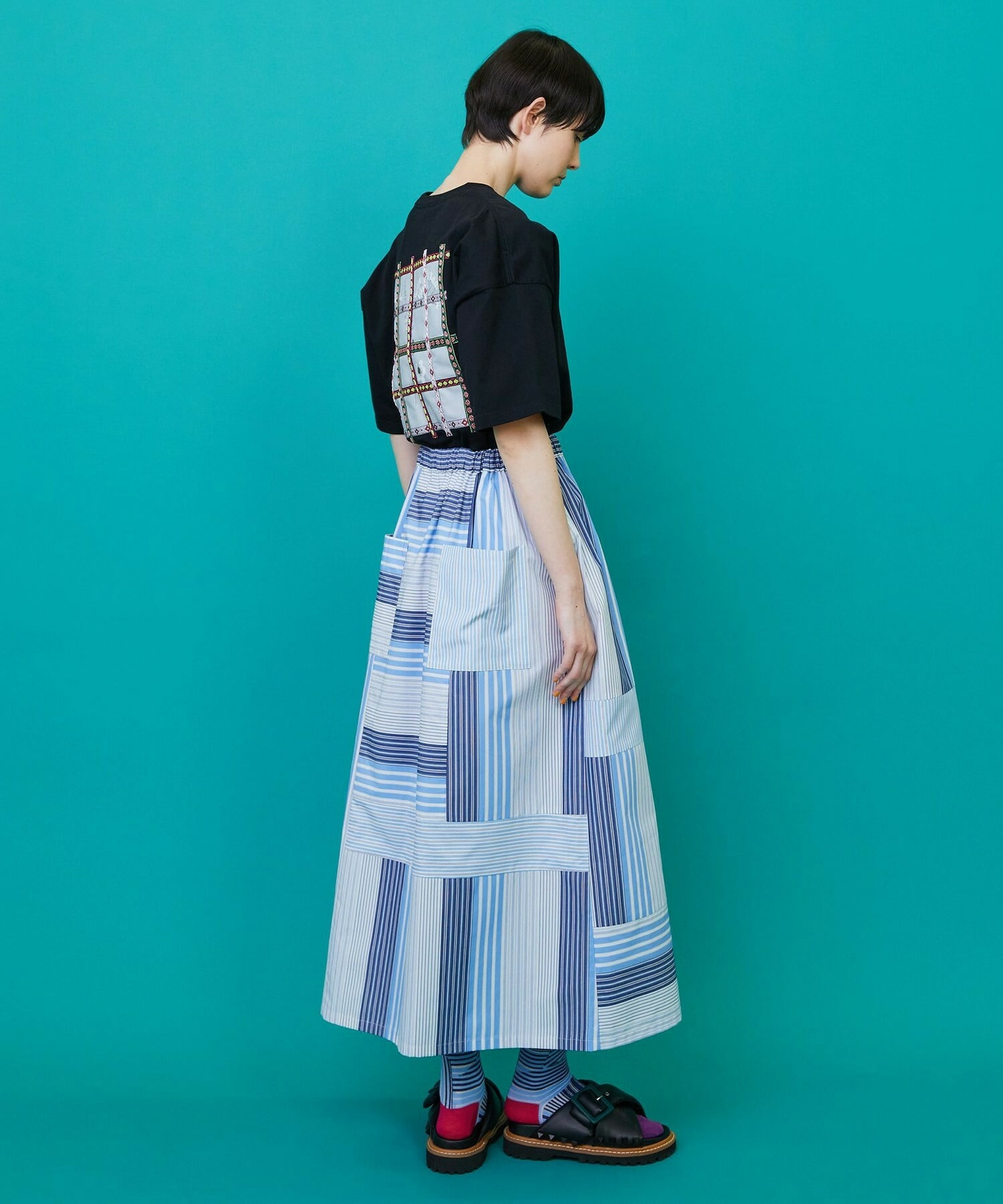 シンプルなフレアースカートを大胆に切り替えて複雑な重なりや組み合わせを表現したデザインスカート。