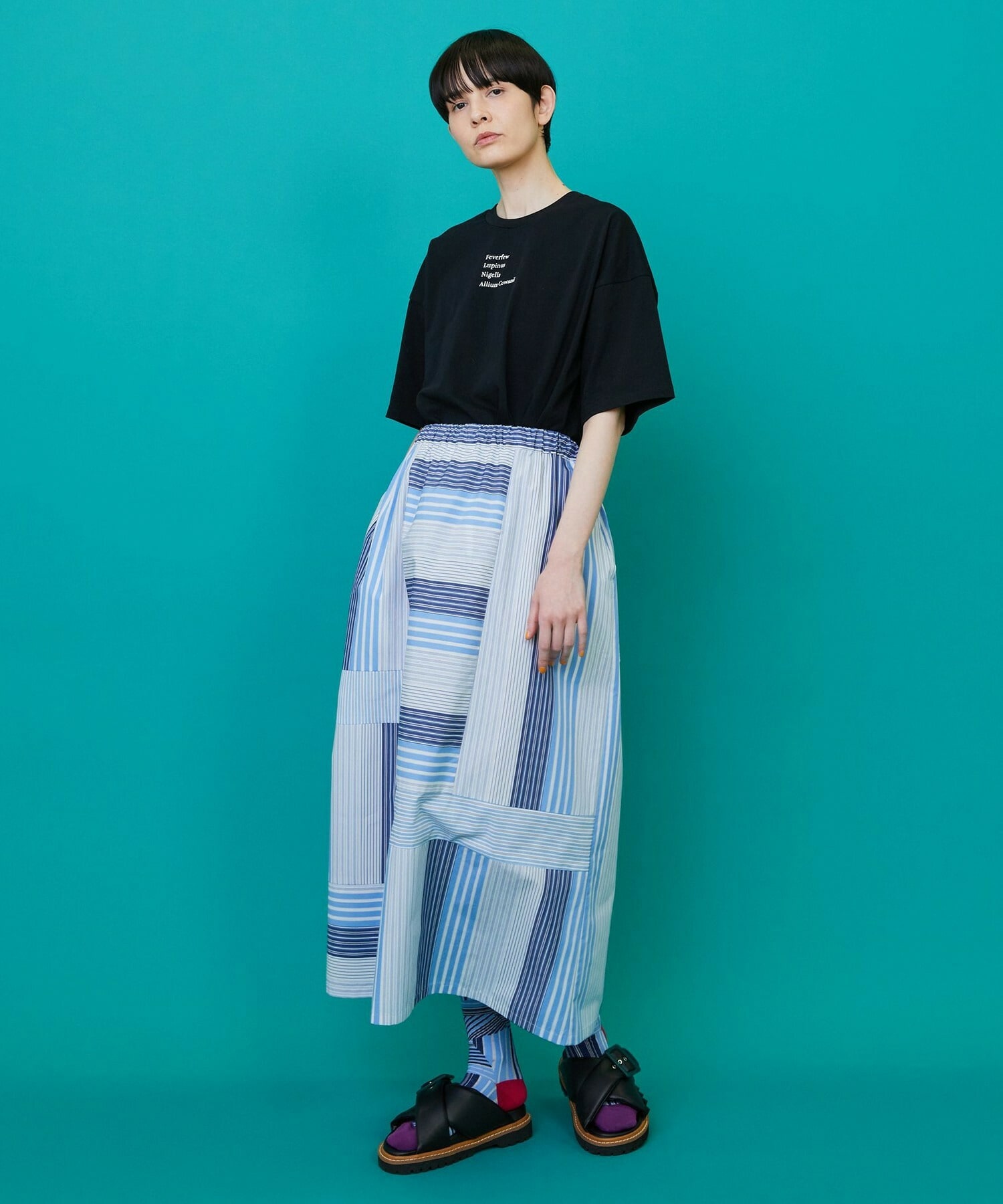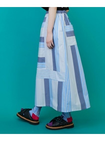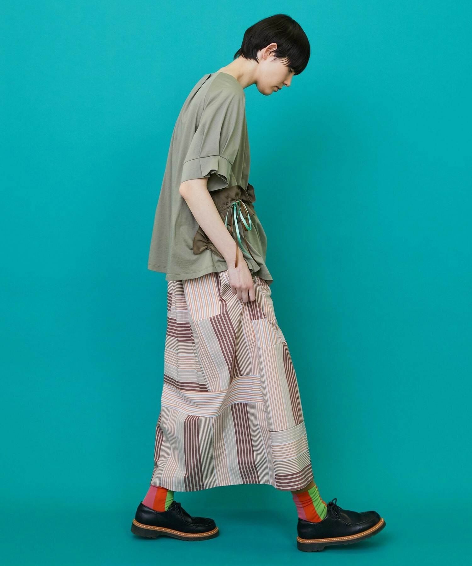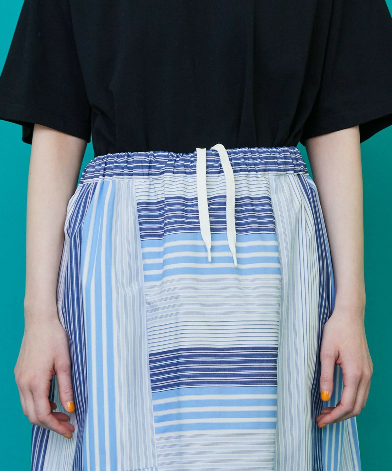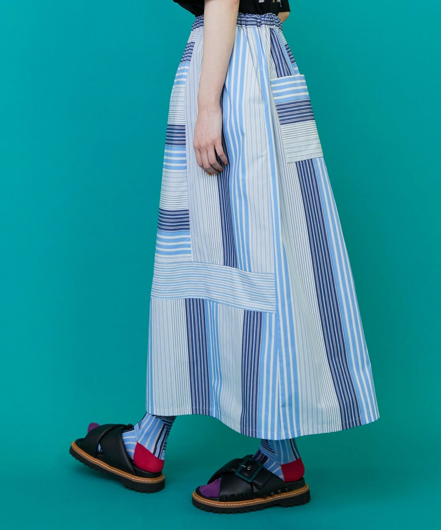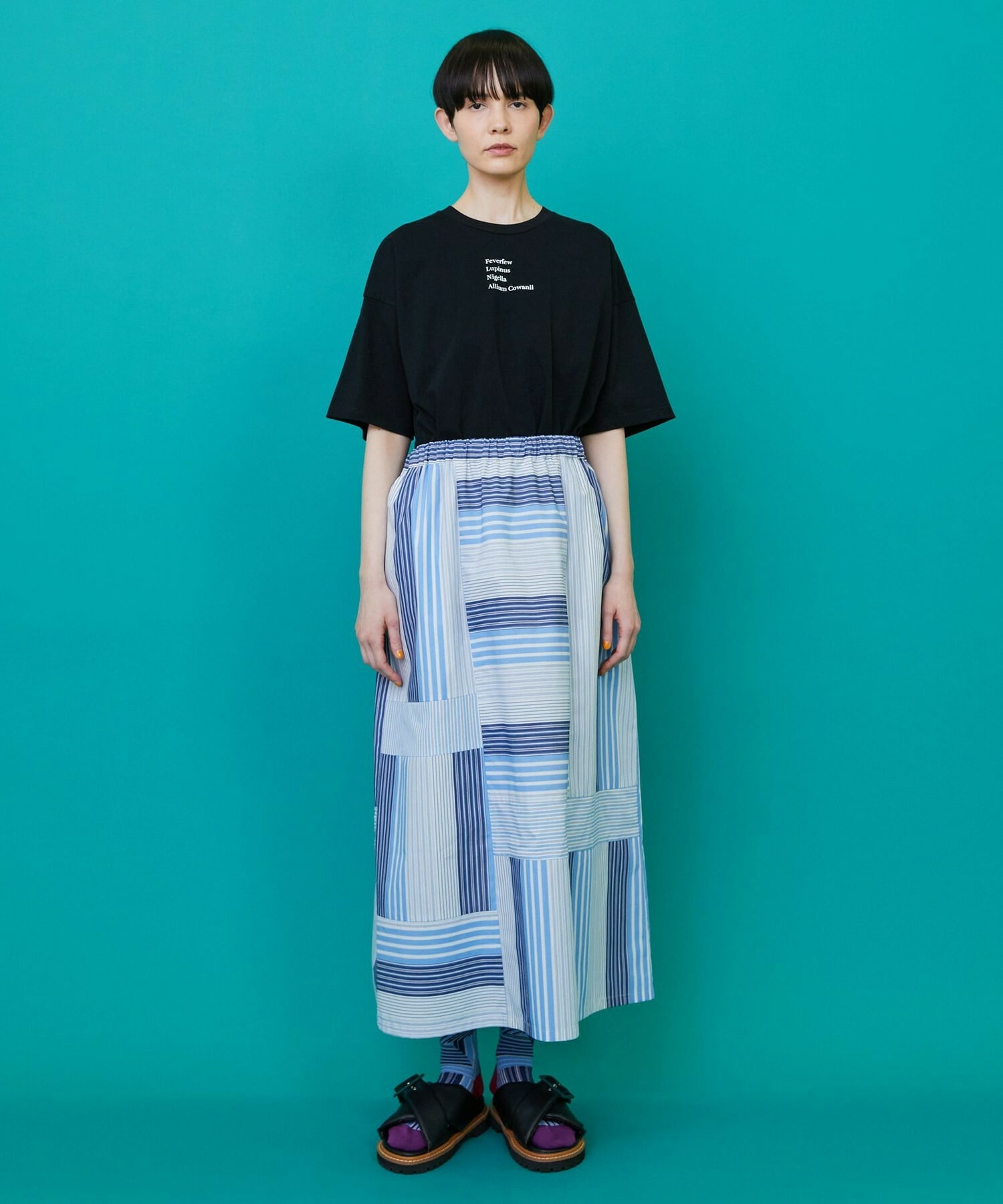 シンプルなフレアースカートを大胆に切り替えて複雑な重なりや組み合わせを表現したデザインスカート。