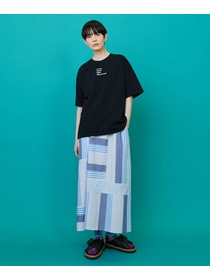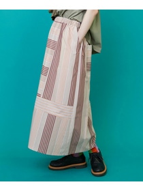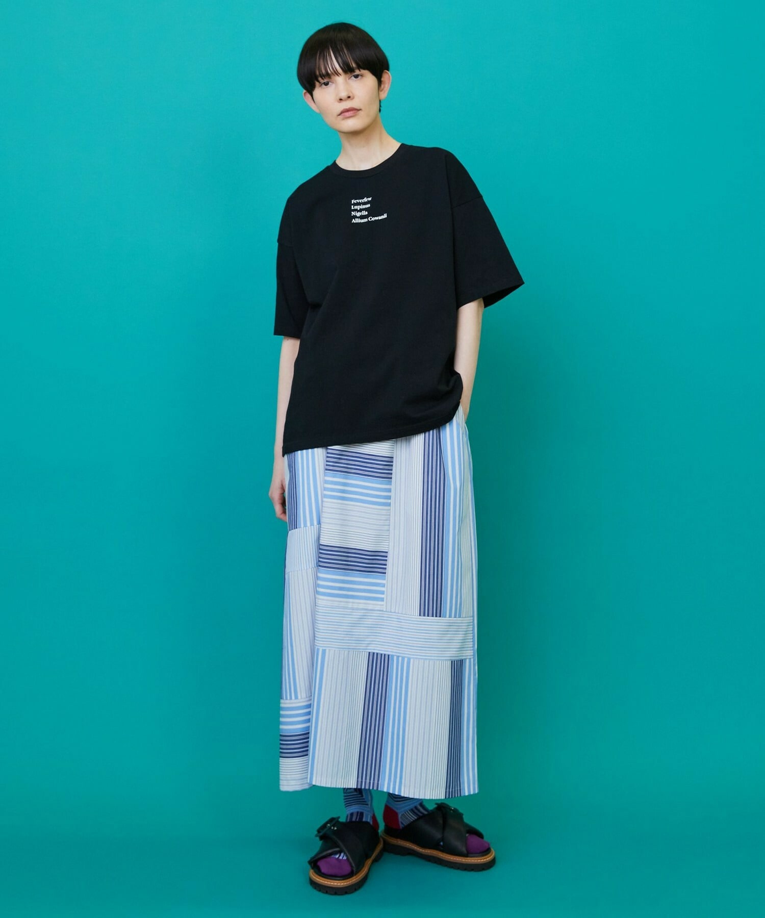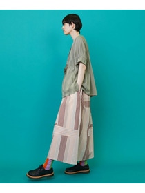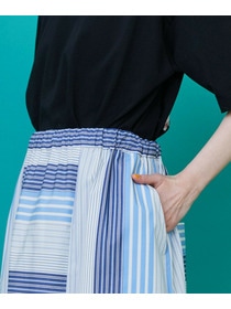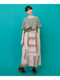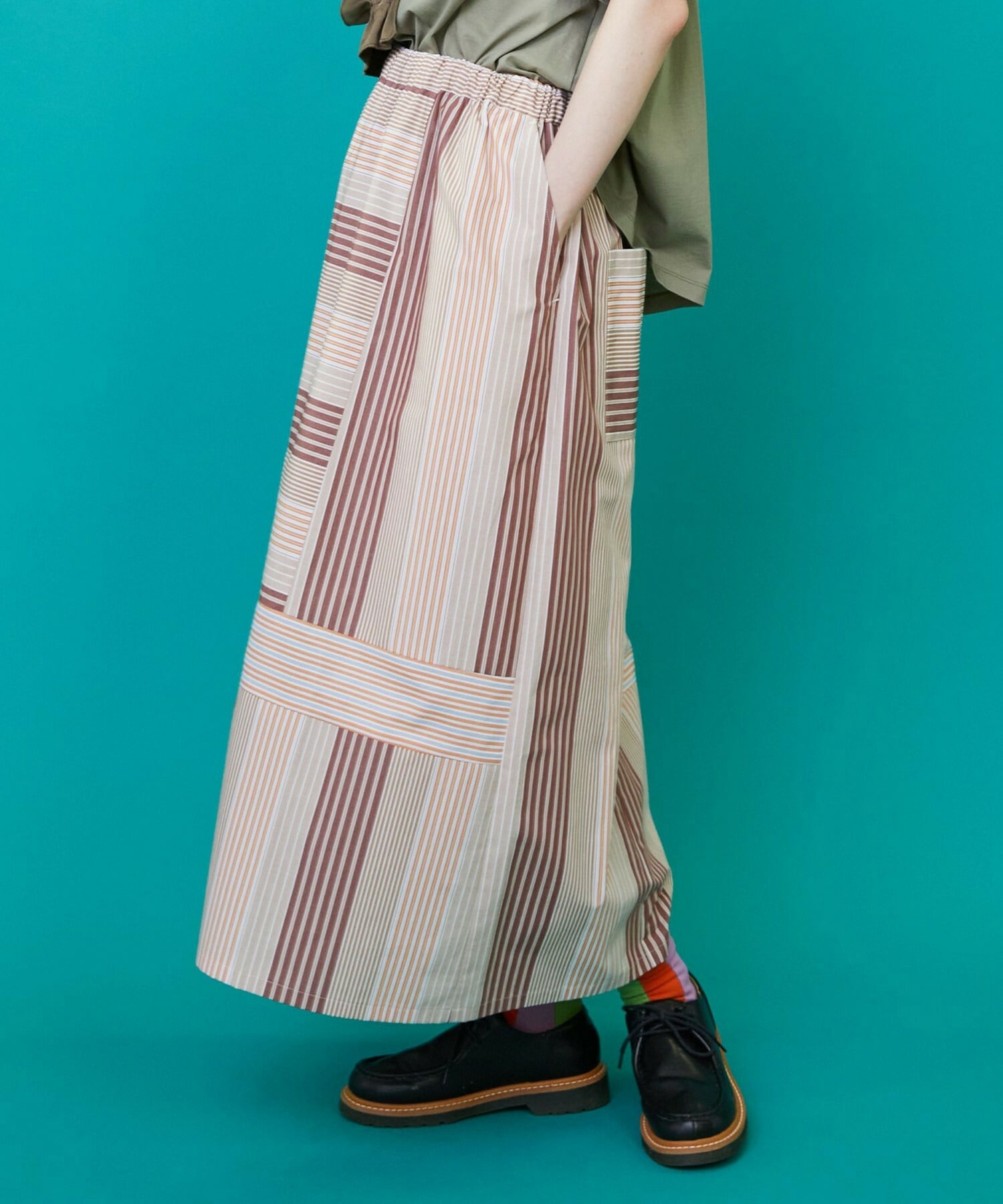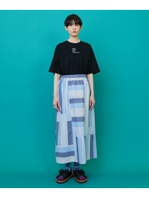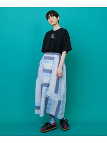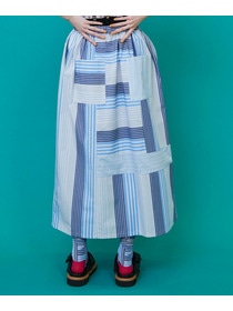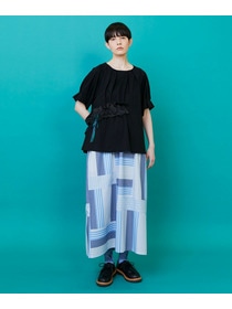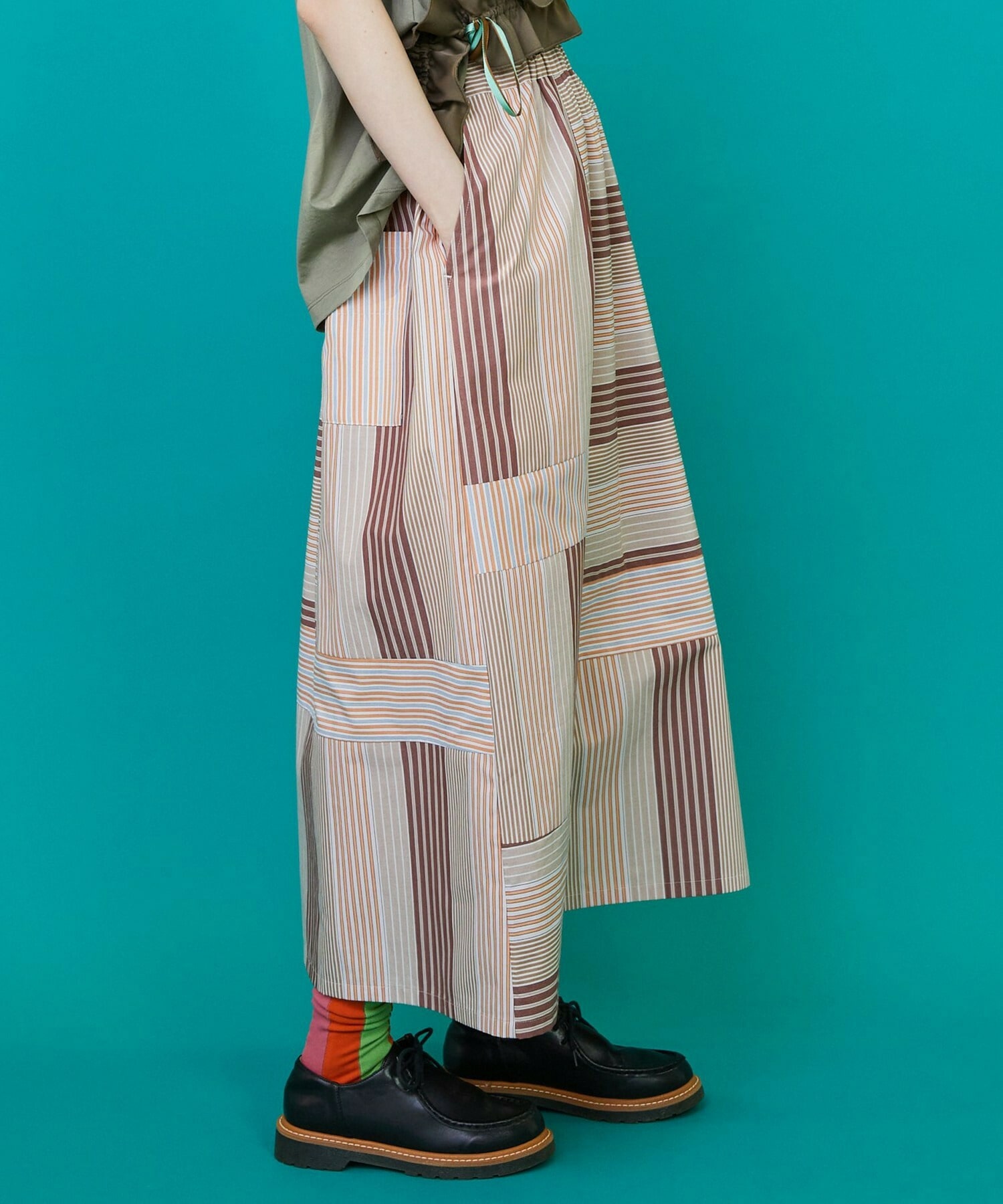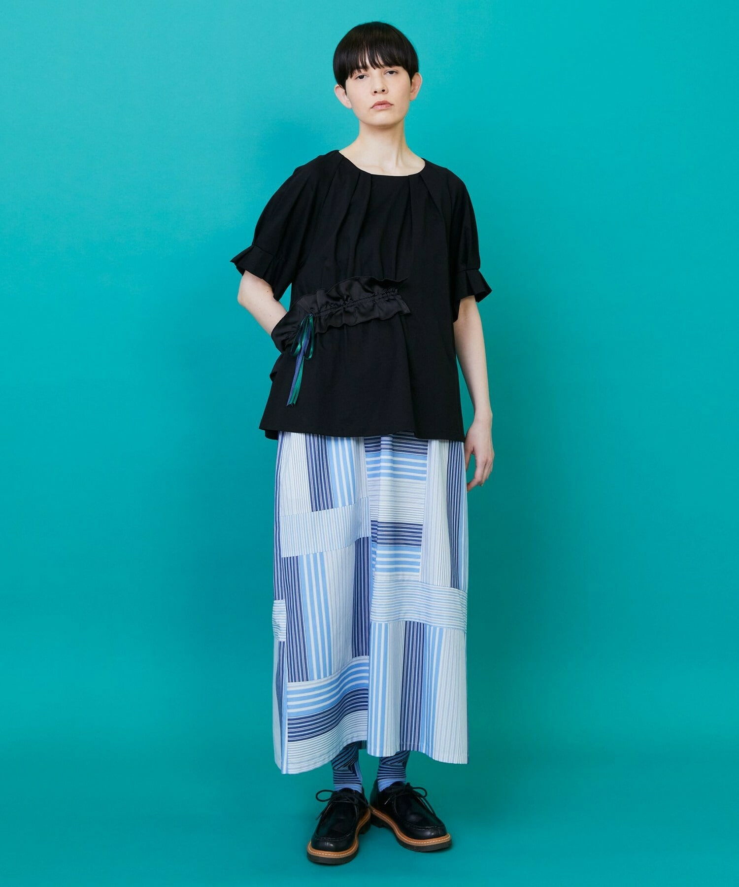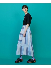 シンプルなフレアースカートを大胆に切り替えて複雑な重なりや組み合わせを表現したデザインスカート。