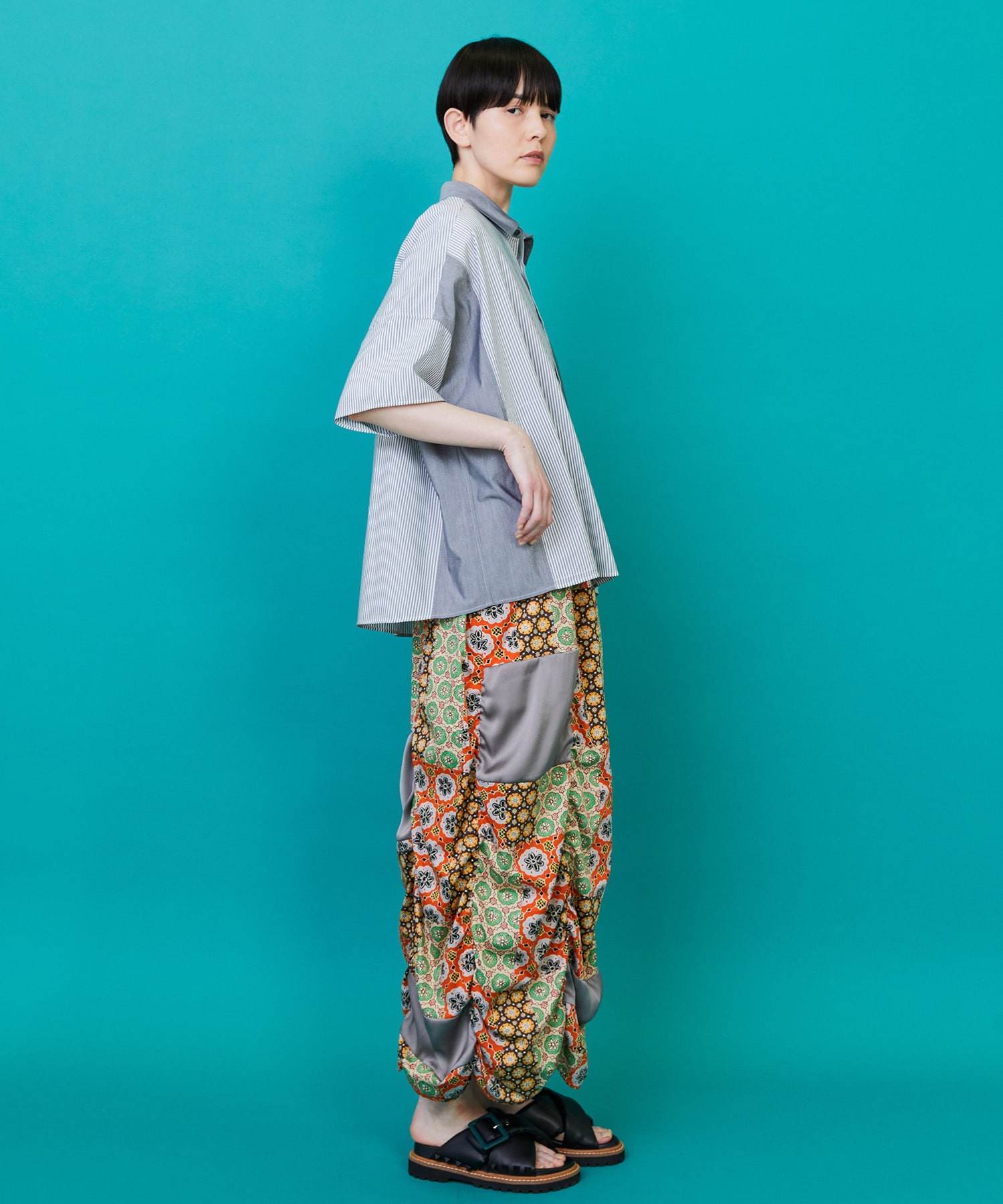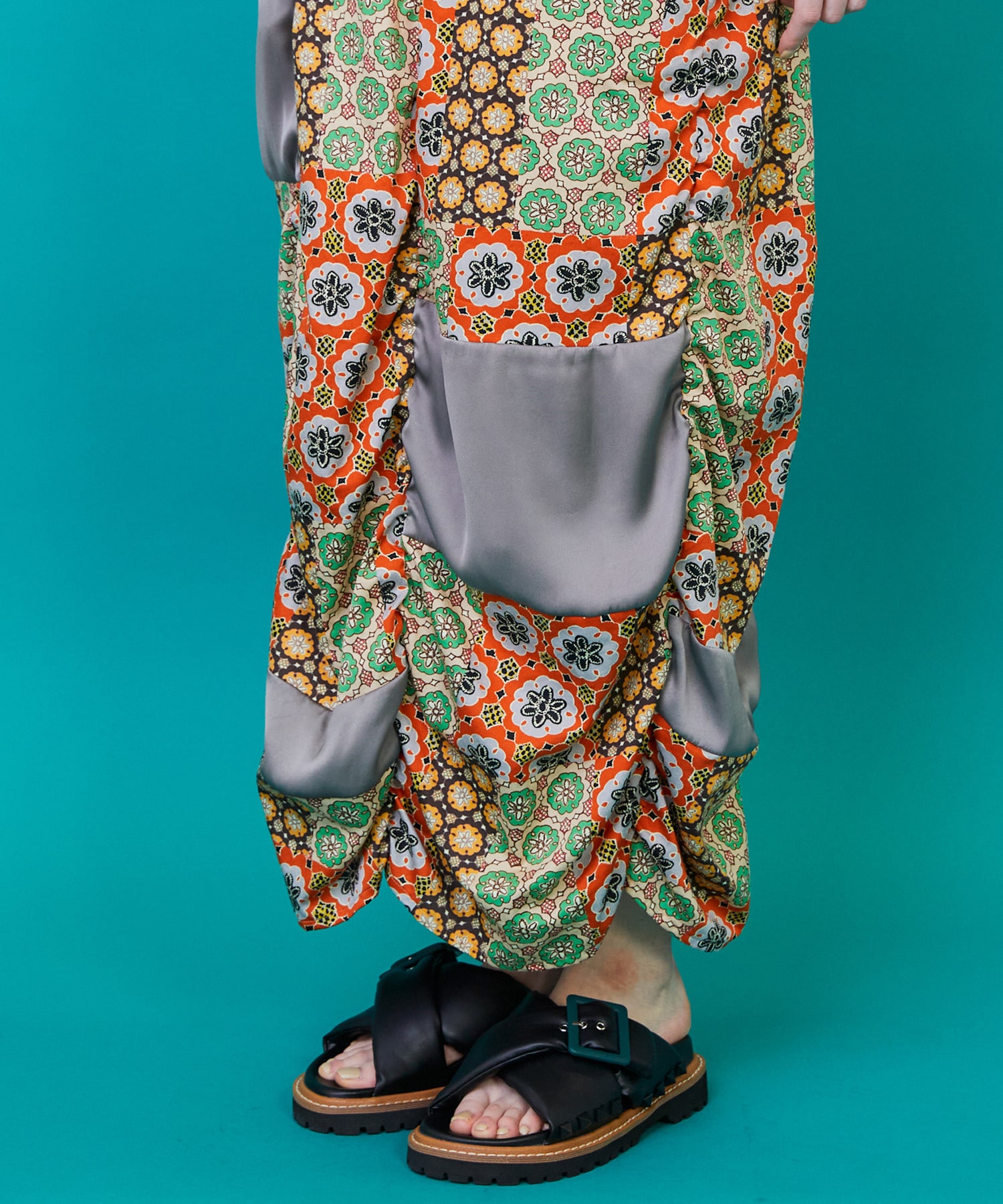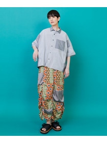 部分的に入れた無地の生地がランダムな柄ともマッチして複雑な雰囲気をつくっています。