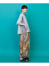 ウエストにふんだんにギャザーを入れて膨らみのあるシルエットながら縦の切り替えにコードゴムを入れて面白い立体感をつくっています。