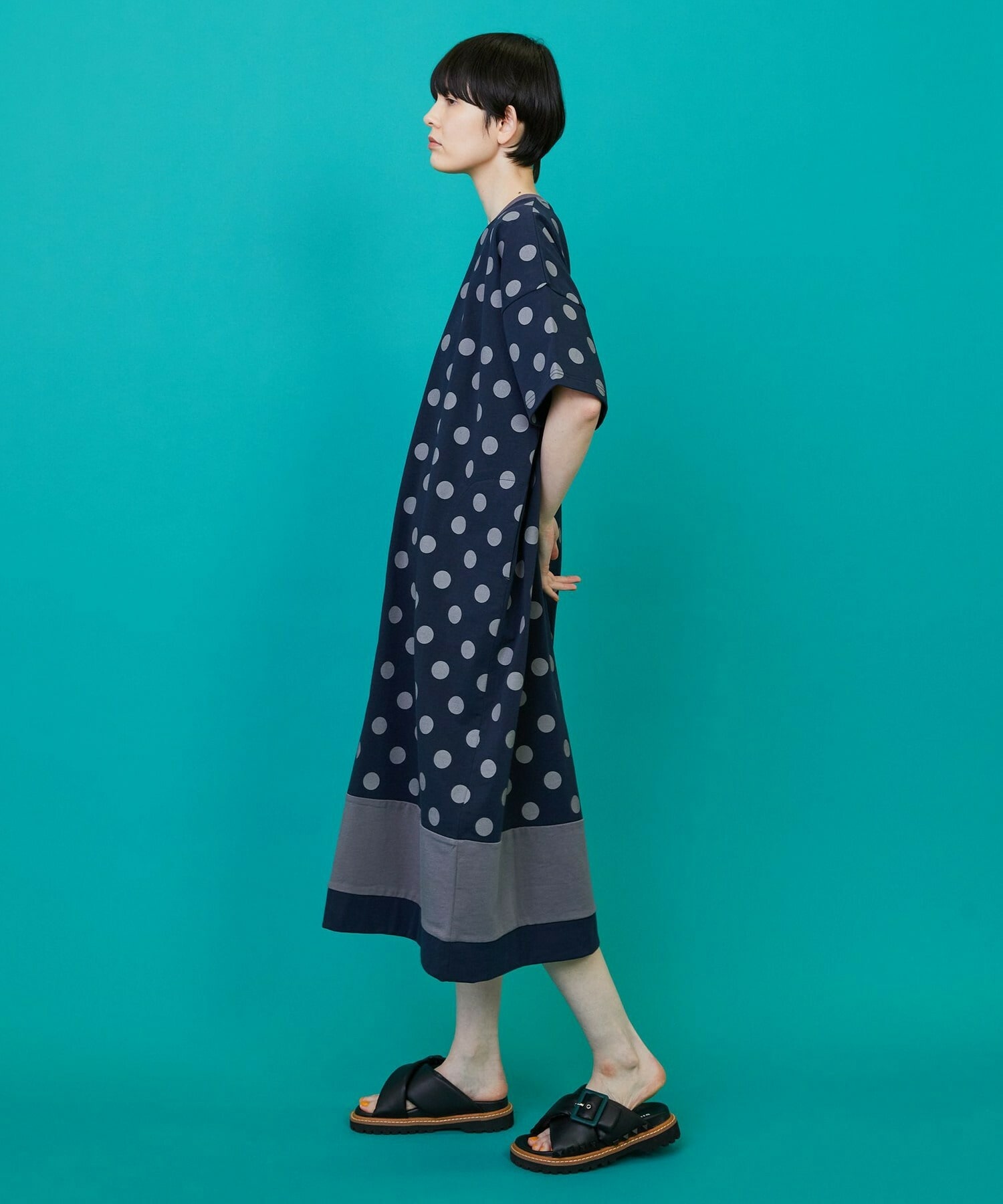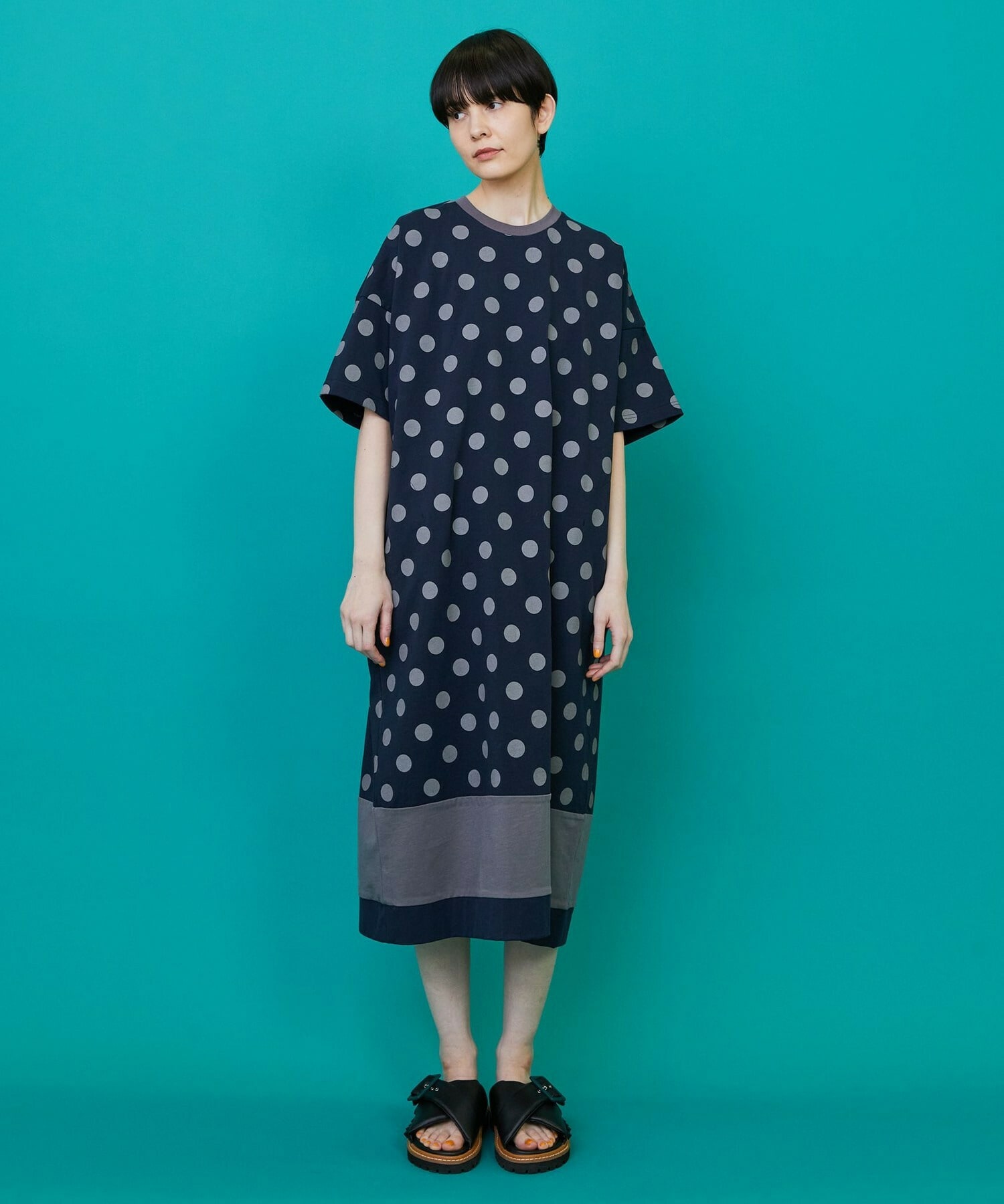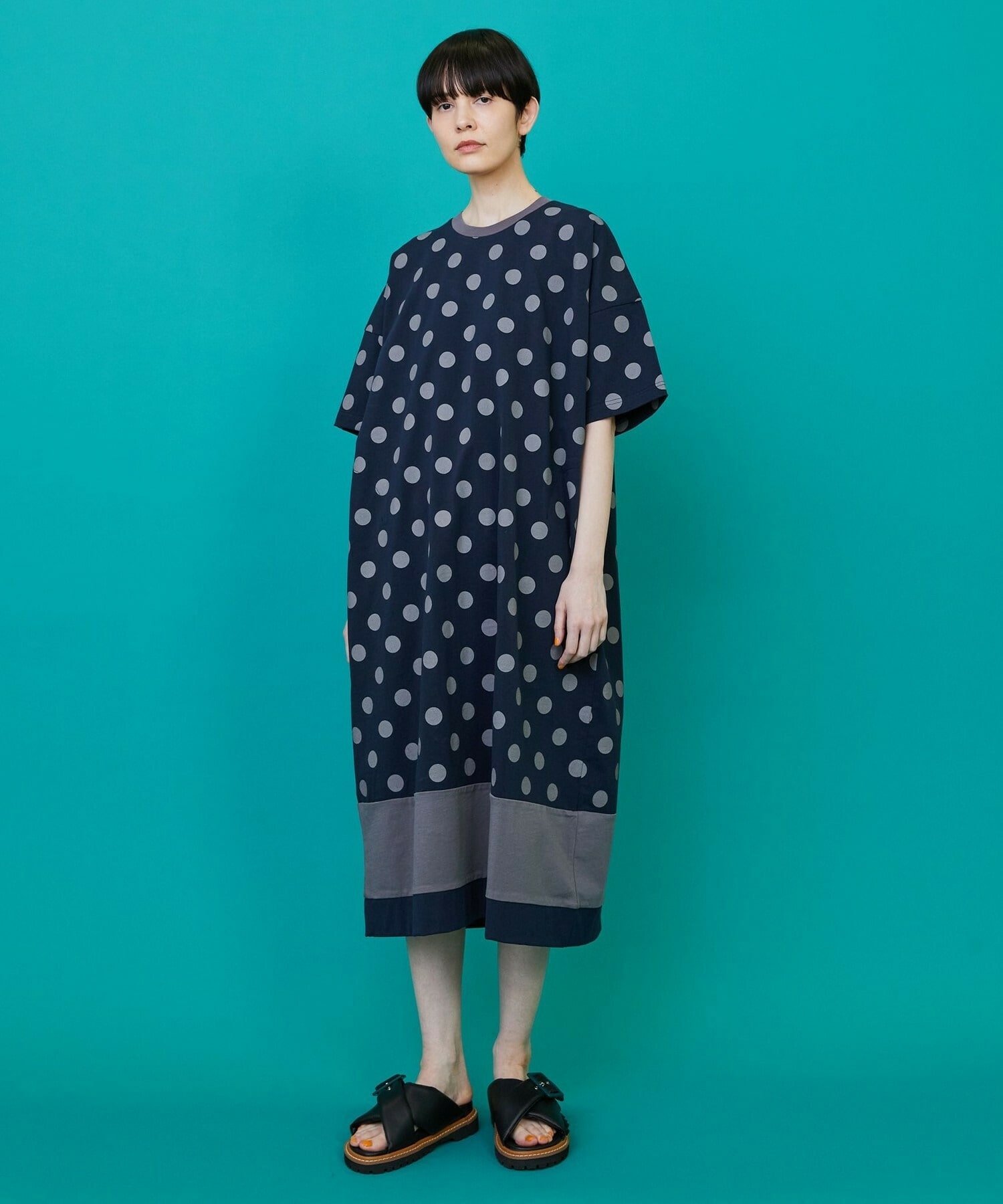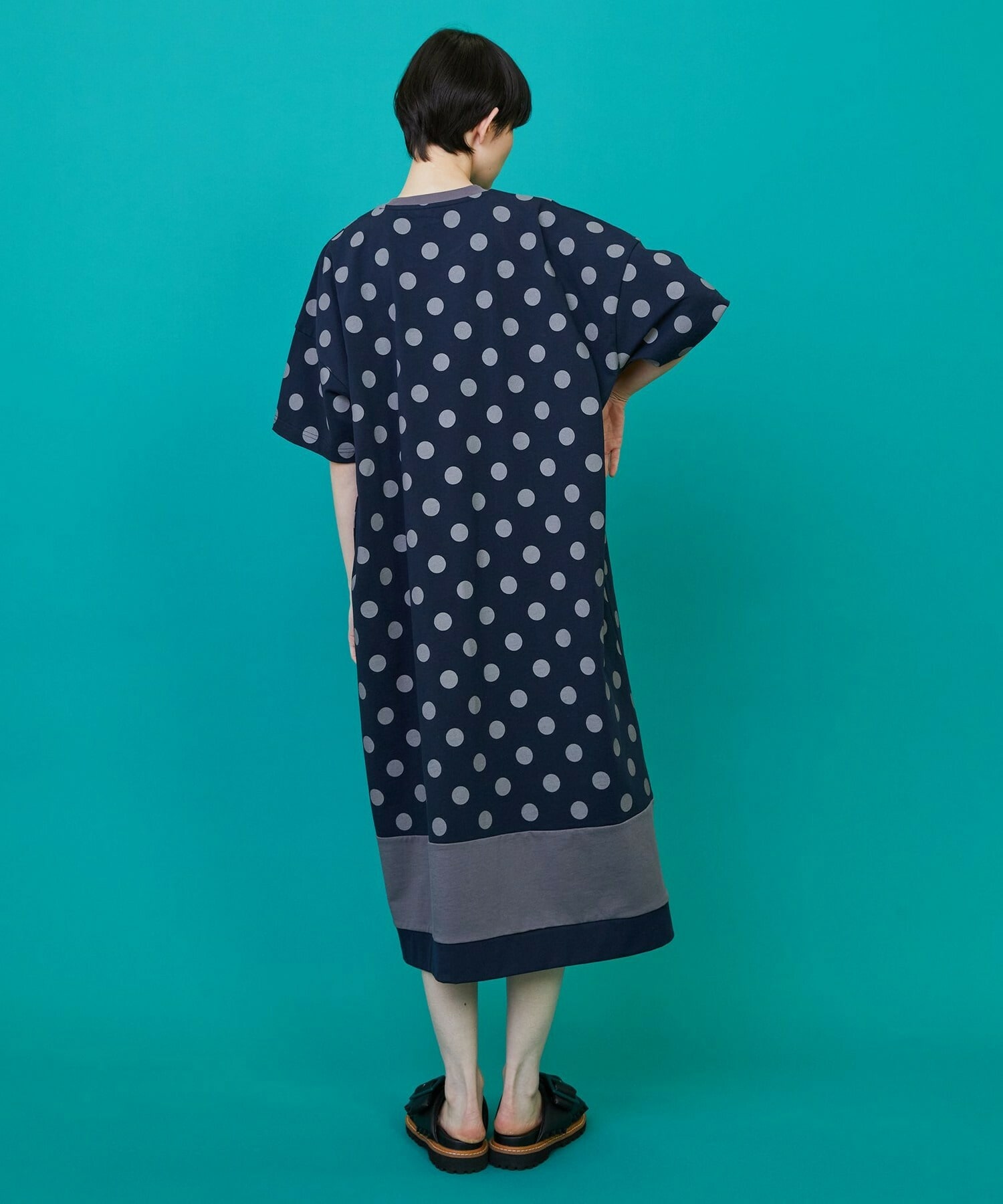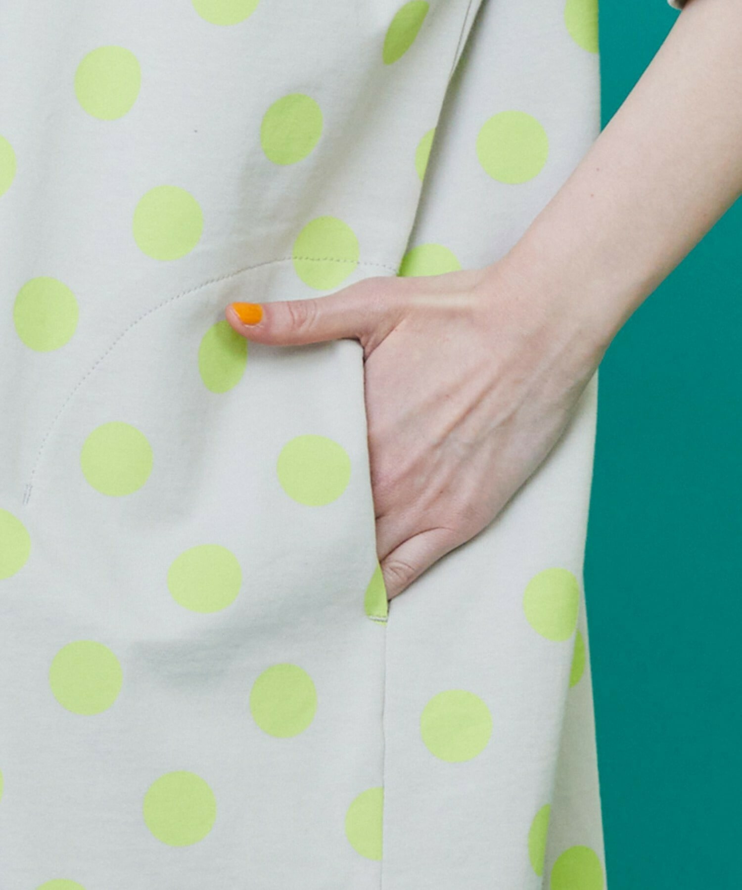 裾に入った切り替えと大胆なドットプリントがポップで軽やかな印象を作っています。