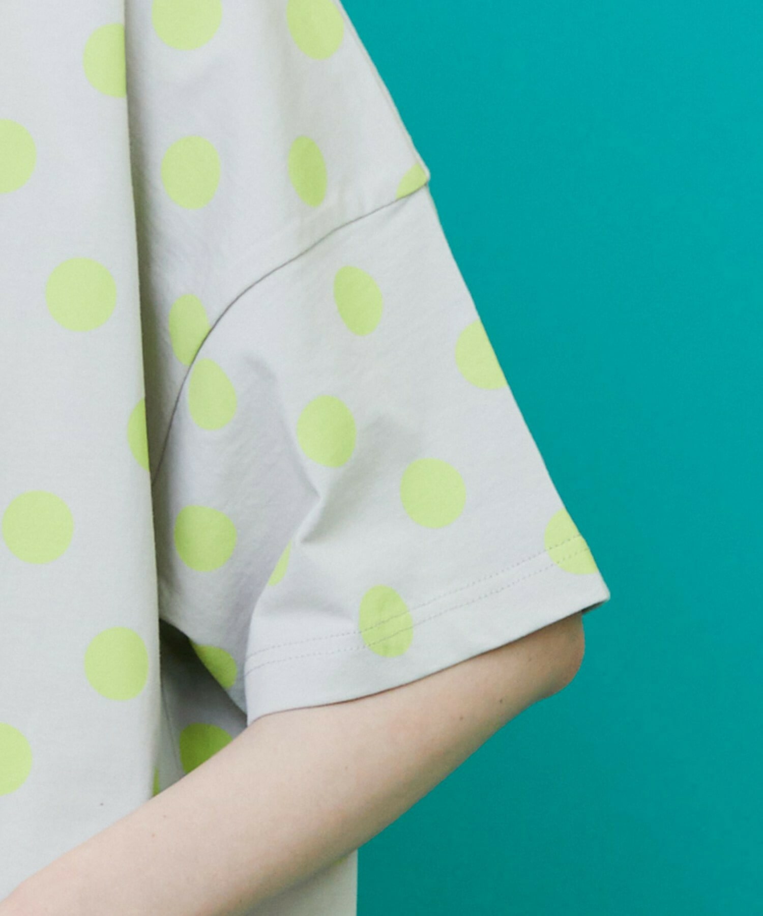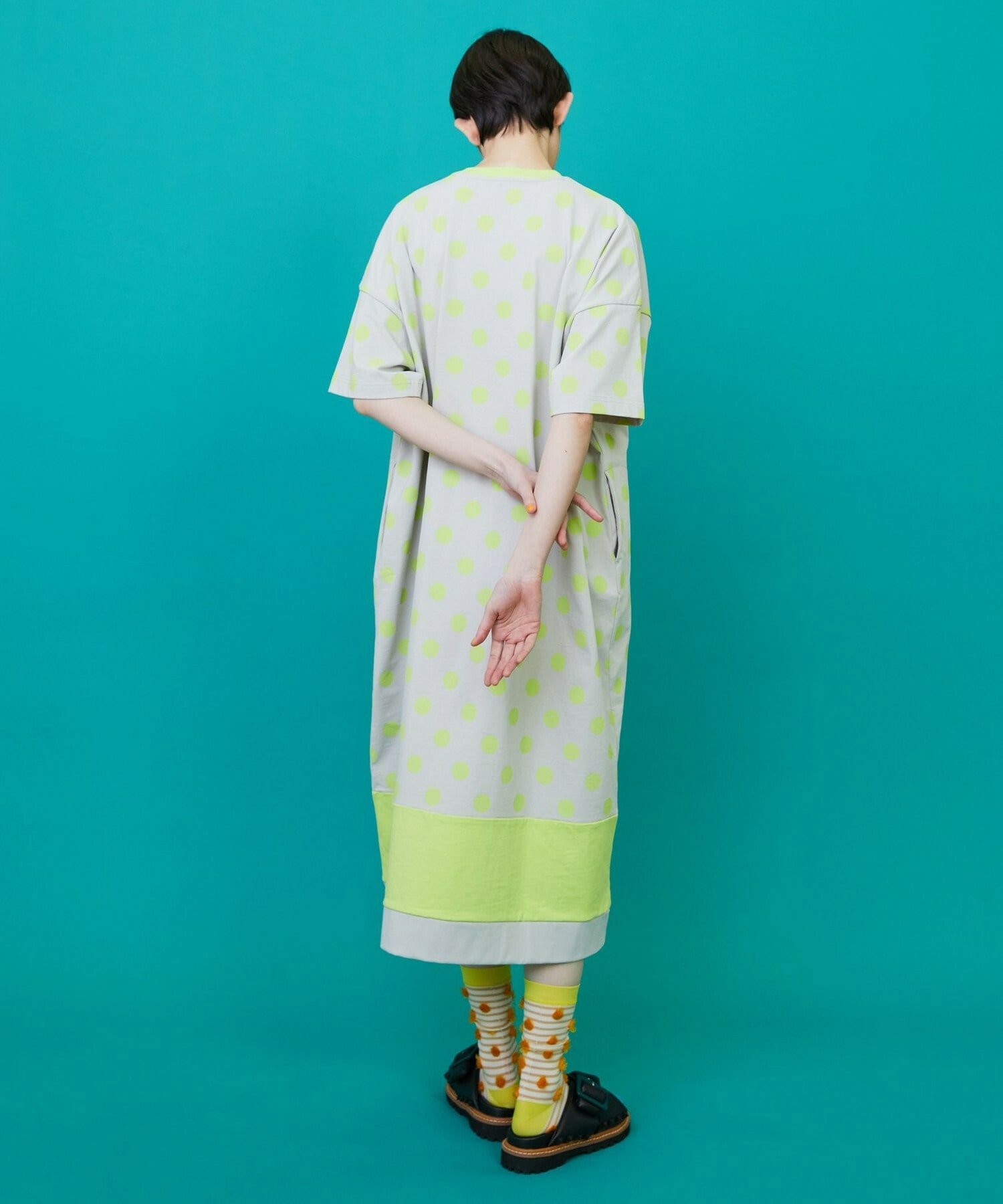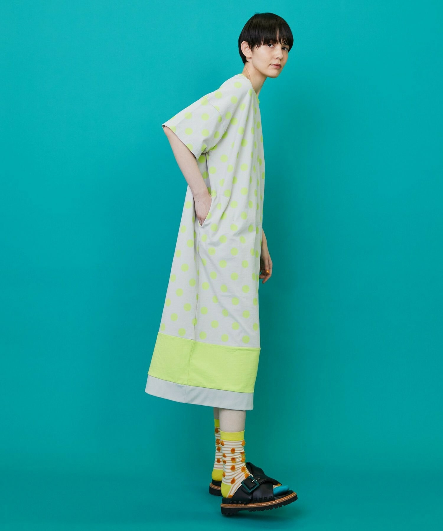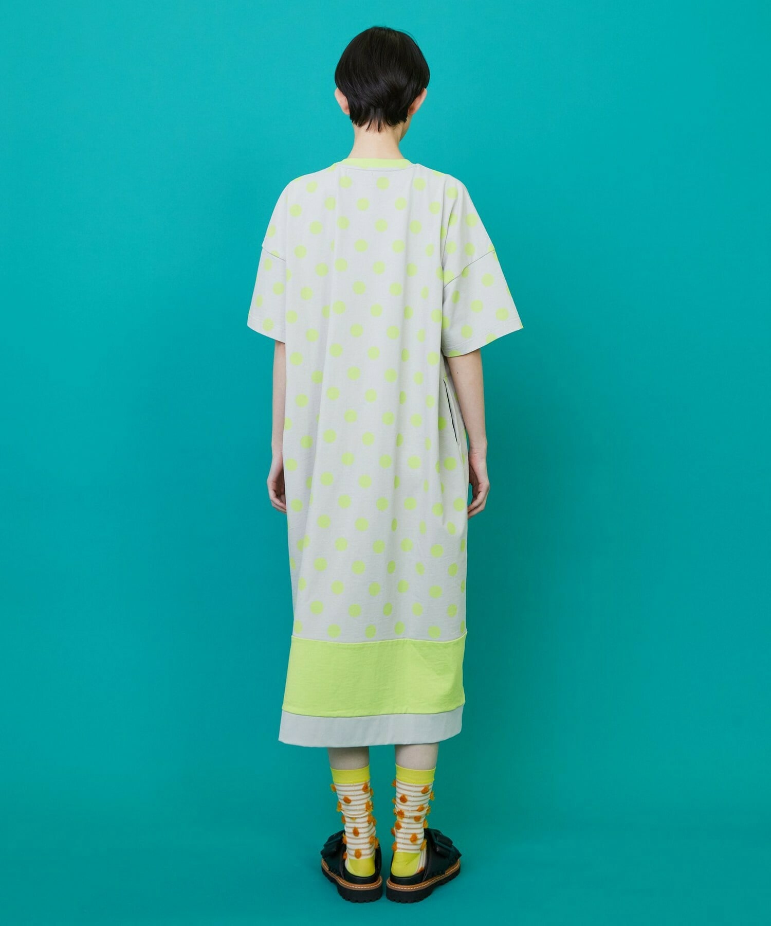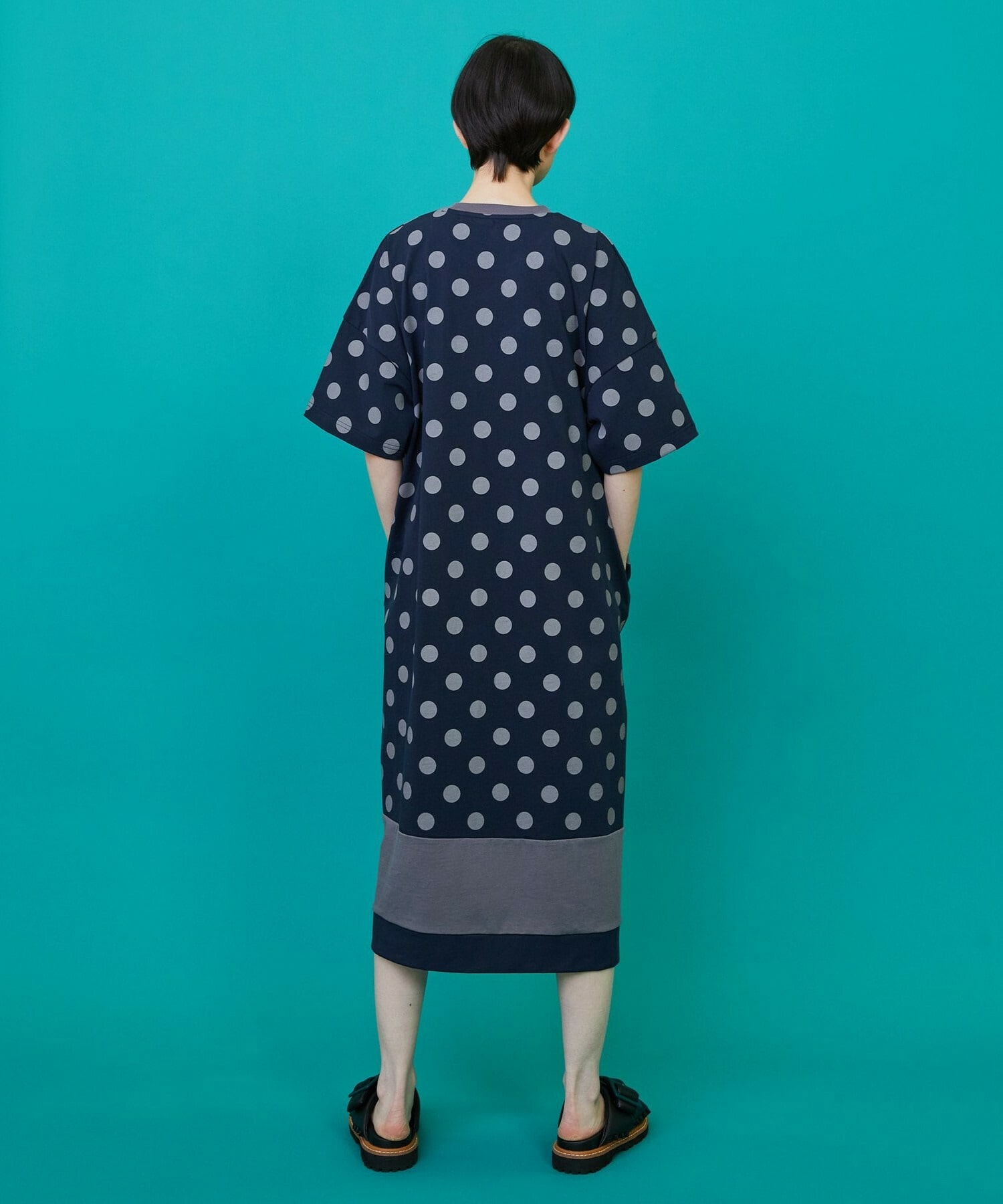 裾に入った切り替えと大胆なドットプリントがポップで軽やかな印象を作っています。