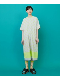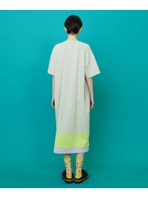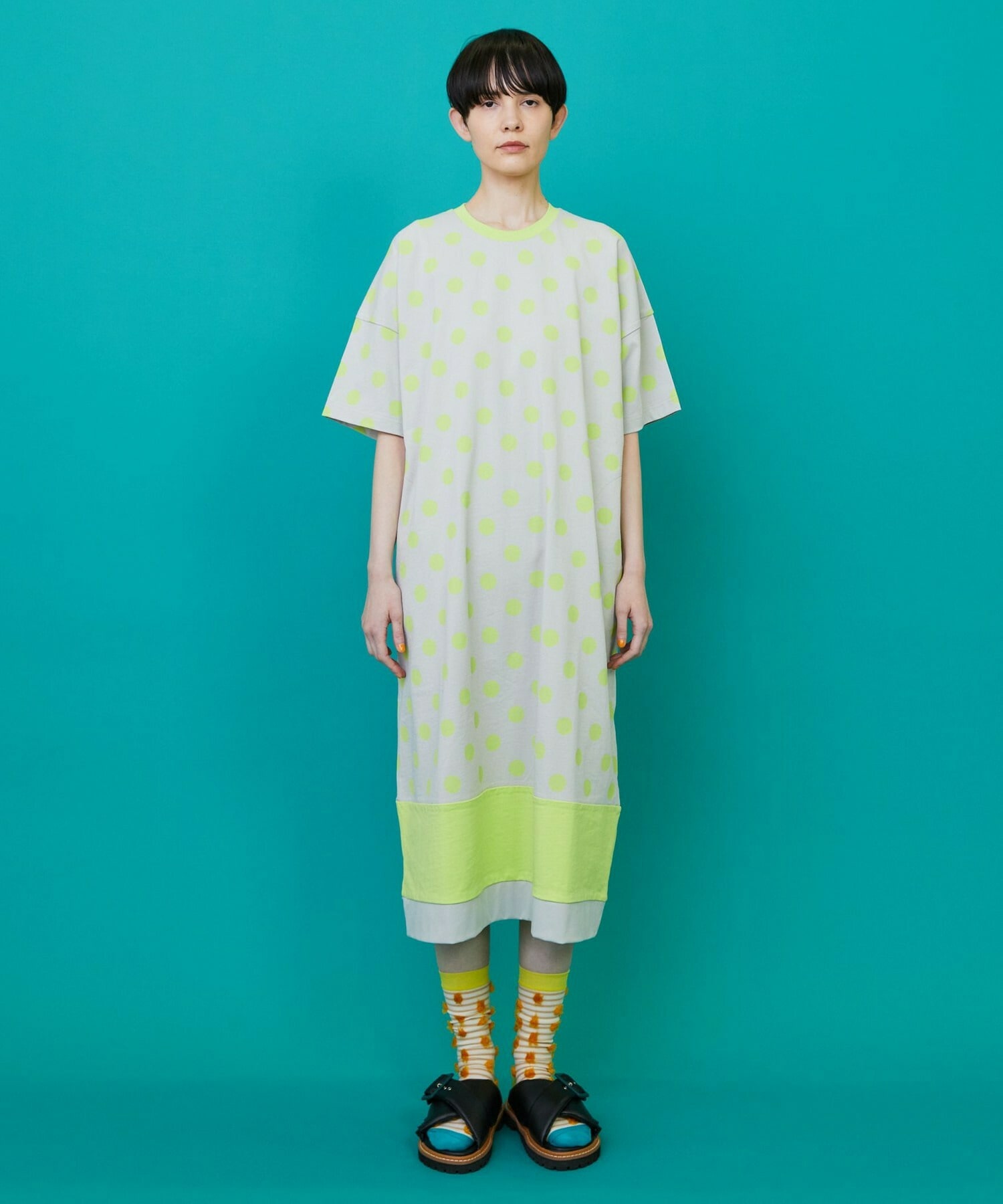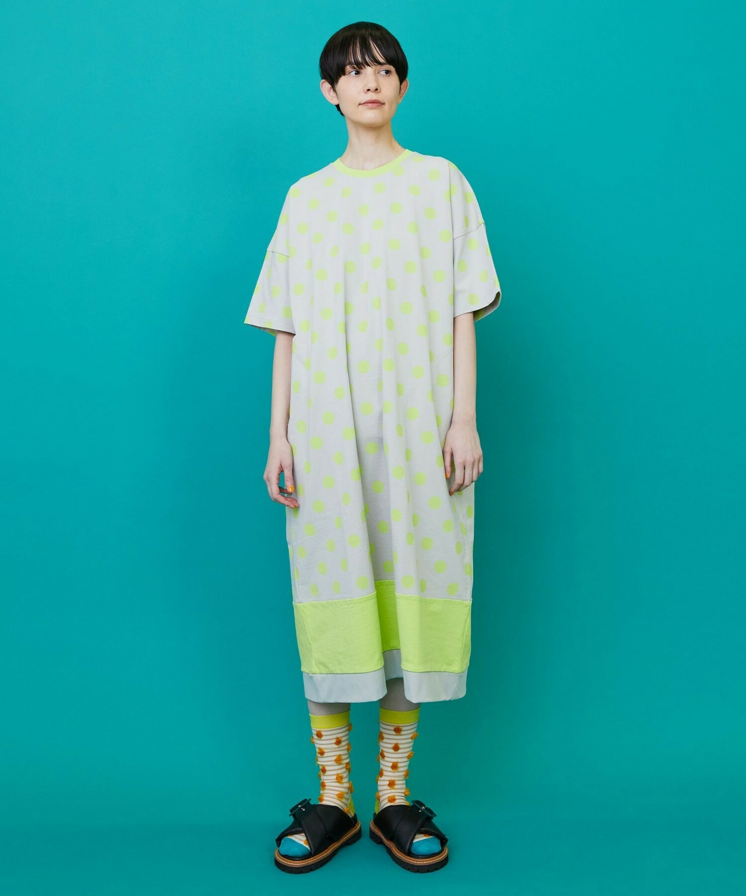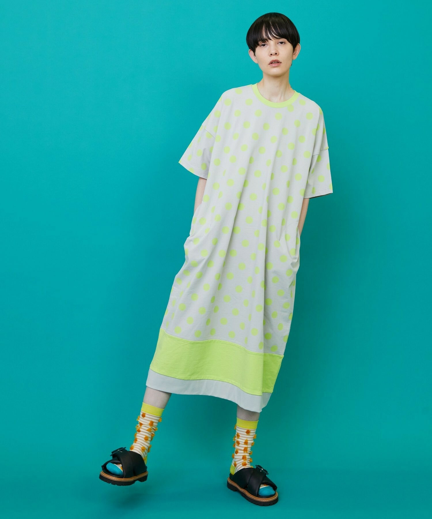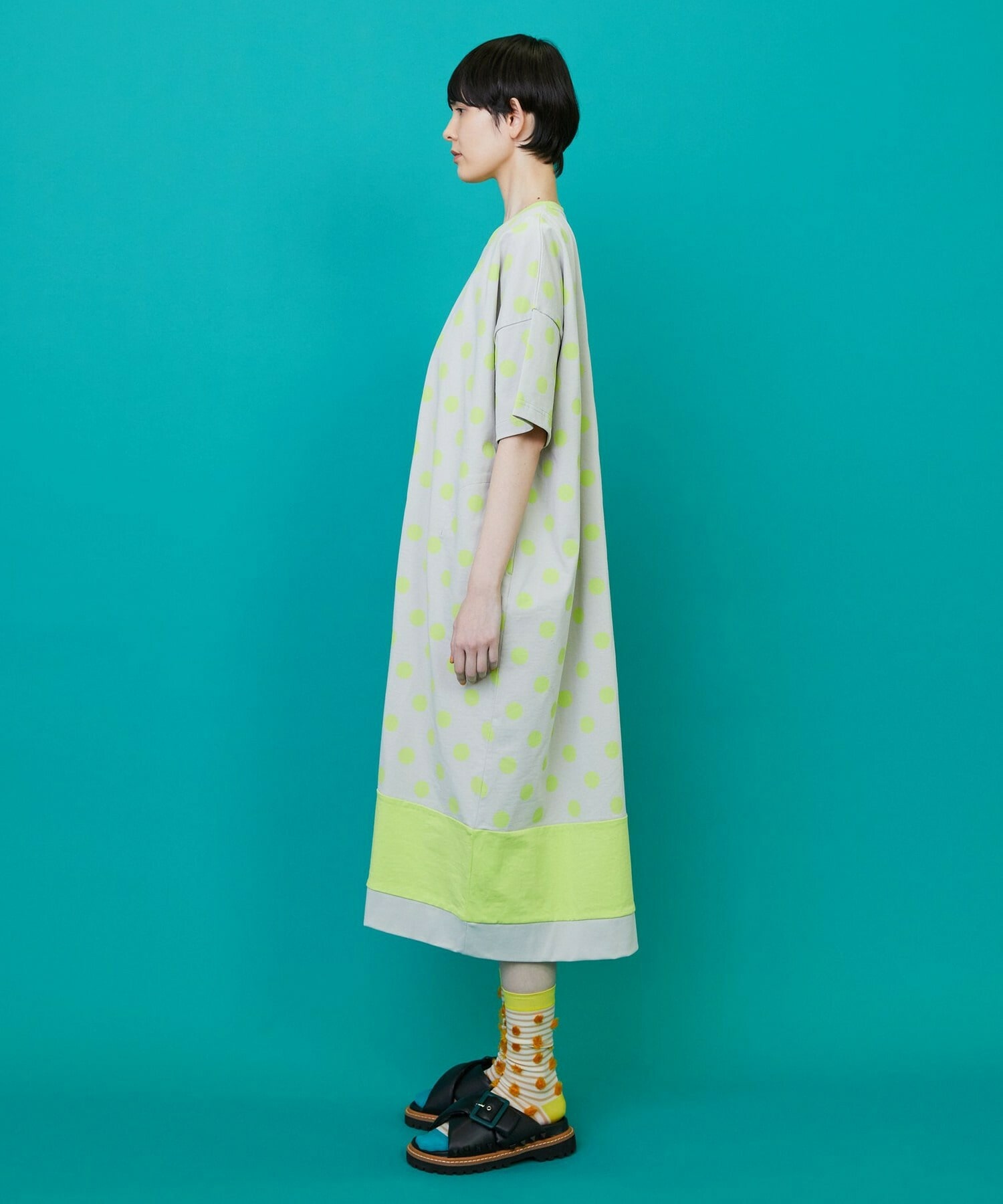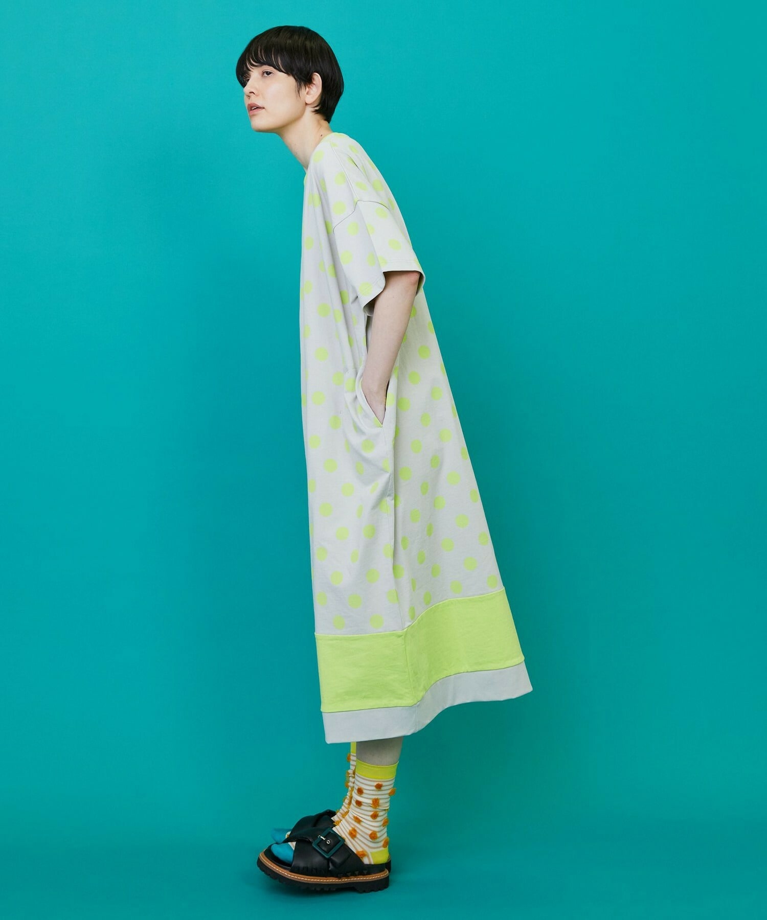 裾に入った切り替えと大胆なドットプリントがポップで軽やかな印象を作っています。