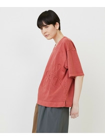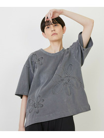 ややワイドシルエットのTシャツをベースに身頃に大胆に「マトリカリア」の花をイメージしたコード刺繍を入れ込んだTシャツを特殊な方法で染め、その後にバイオ加工で着古した風合いに仕上げています。