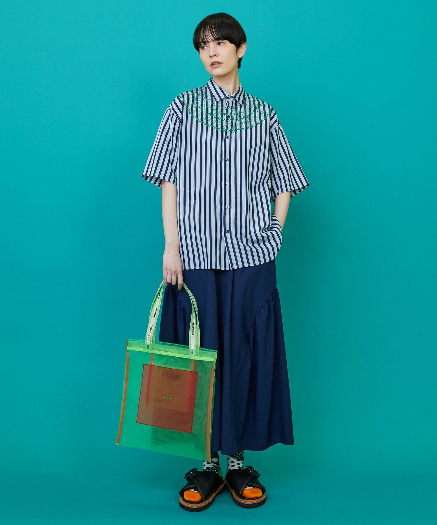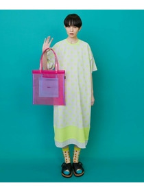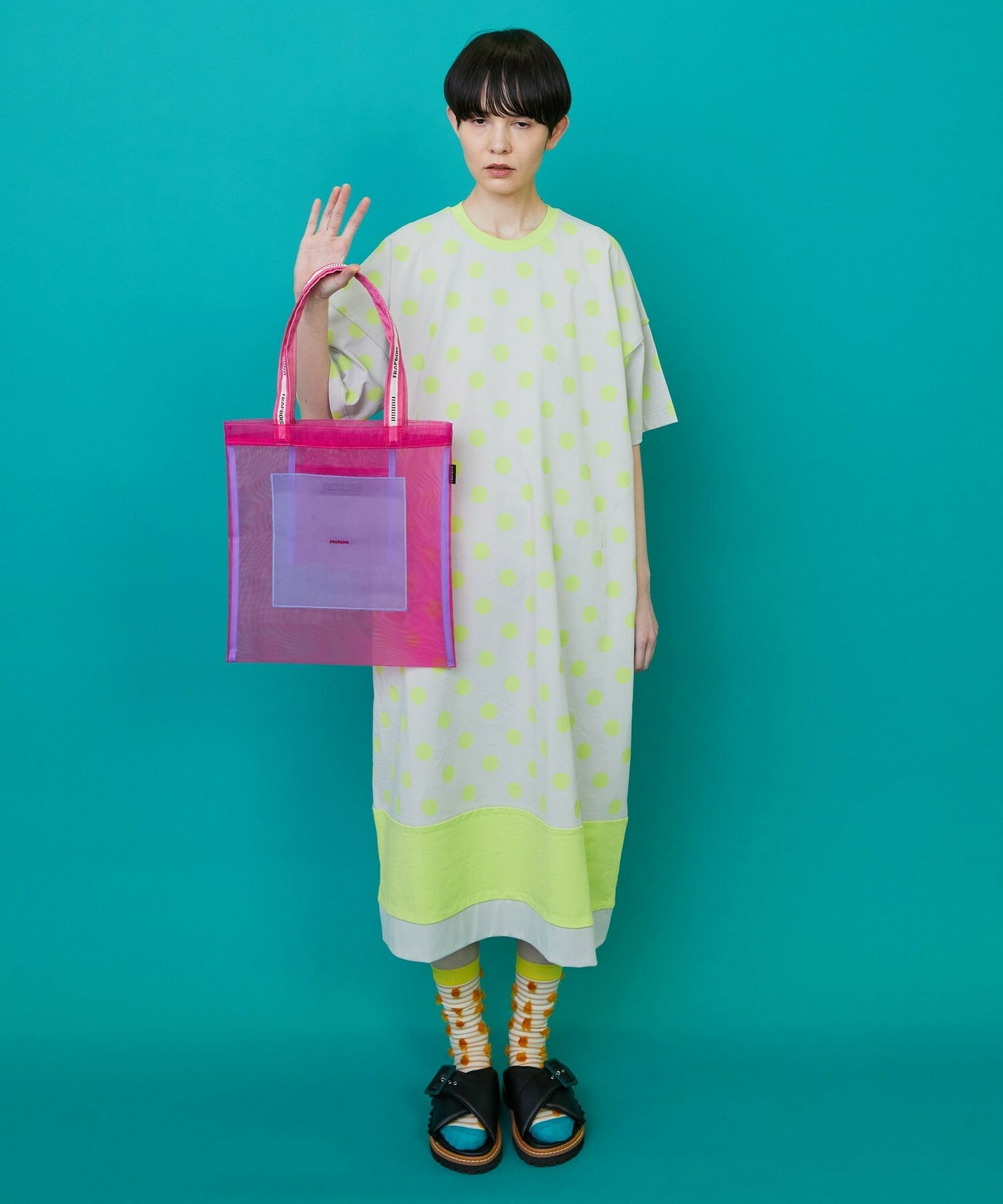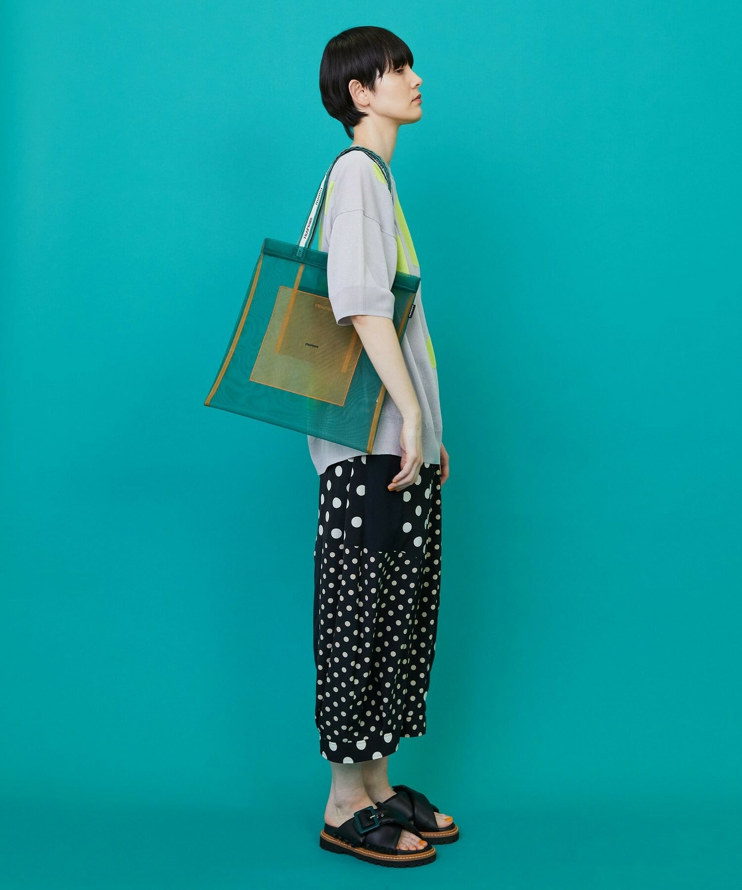 張りのあるナイロンのメッシュ素材を使い、色の重なりで独特の配色を生み出しています。