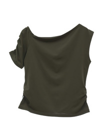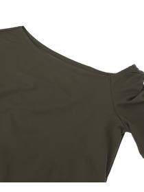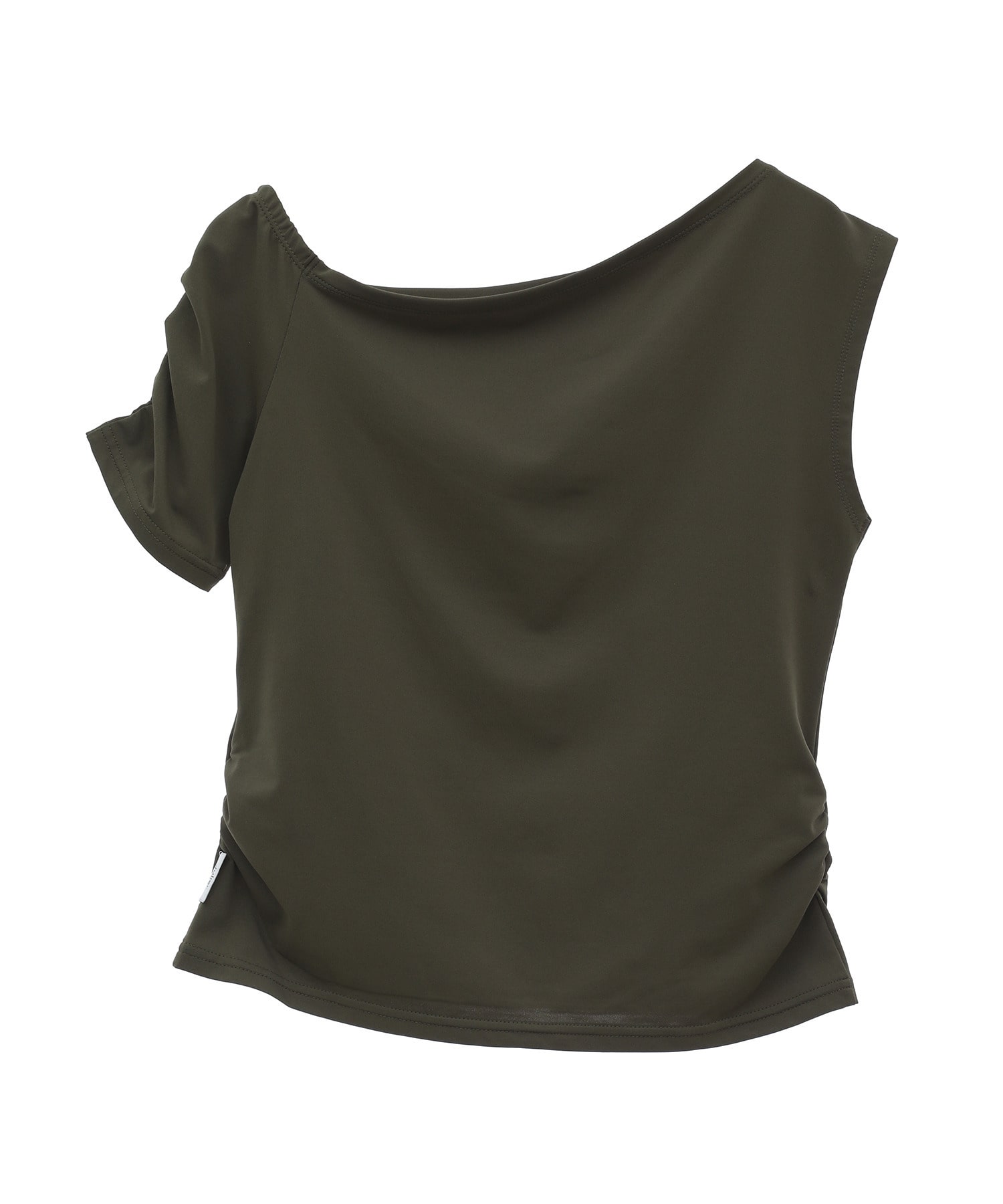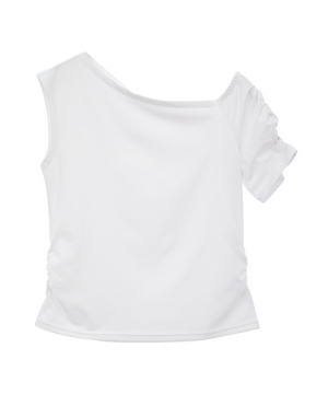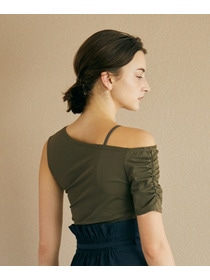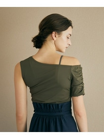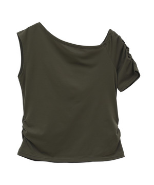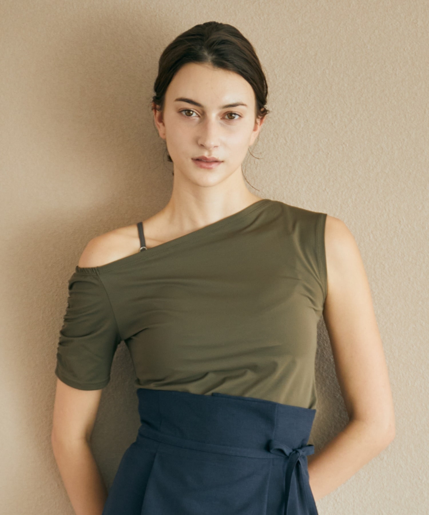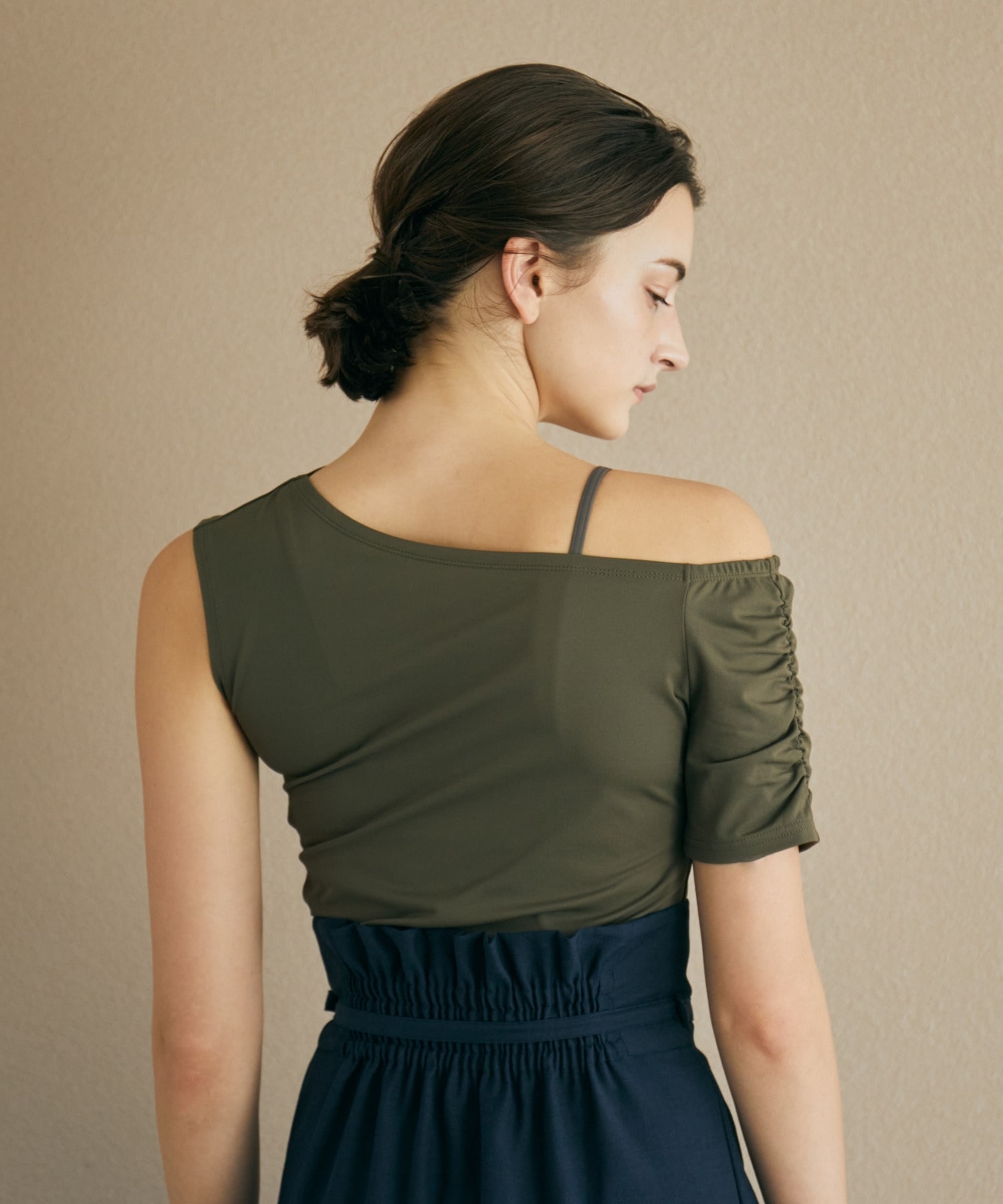 片方はノースリーブ、もう片方は肩を落として着る、アシンメトリーデザインです。
