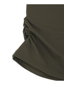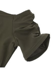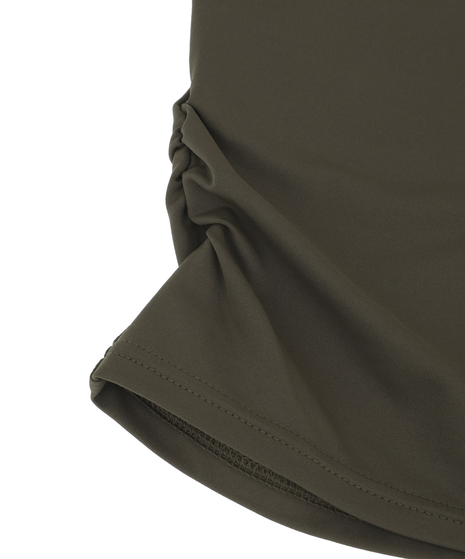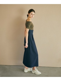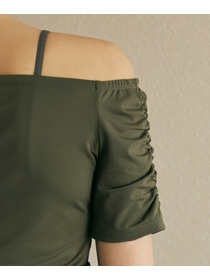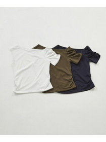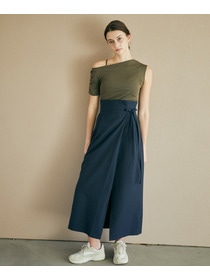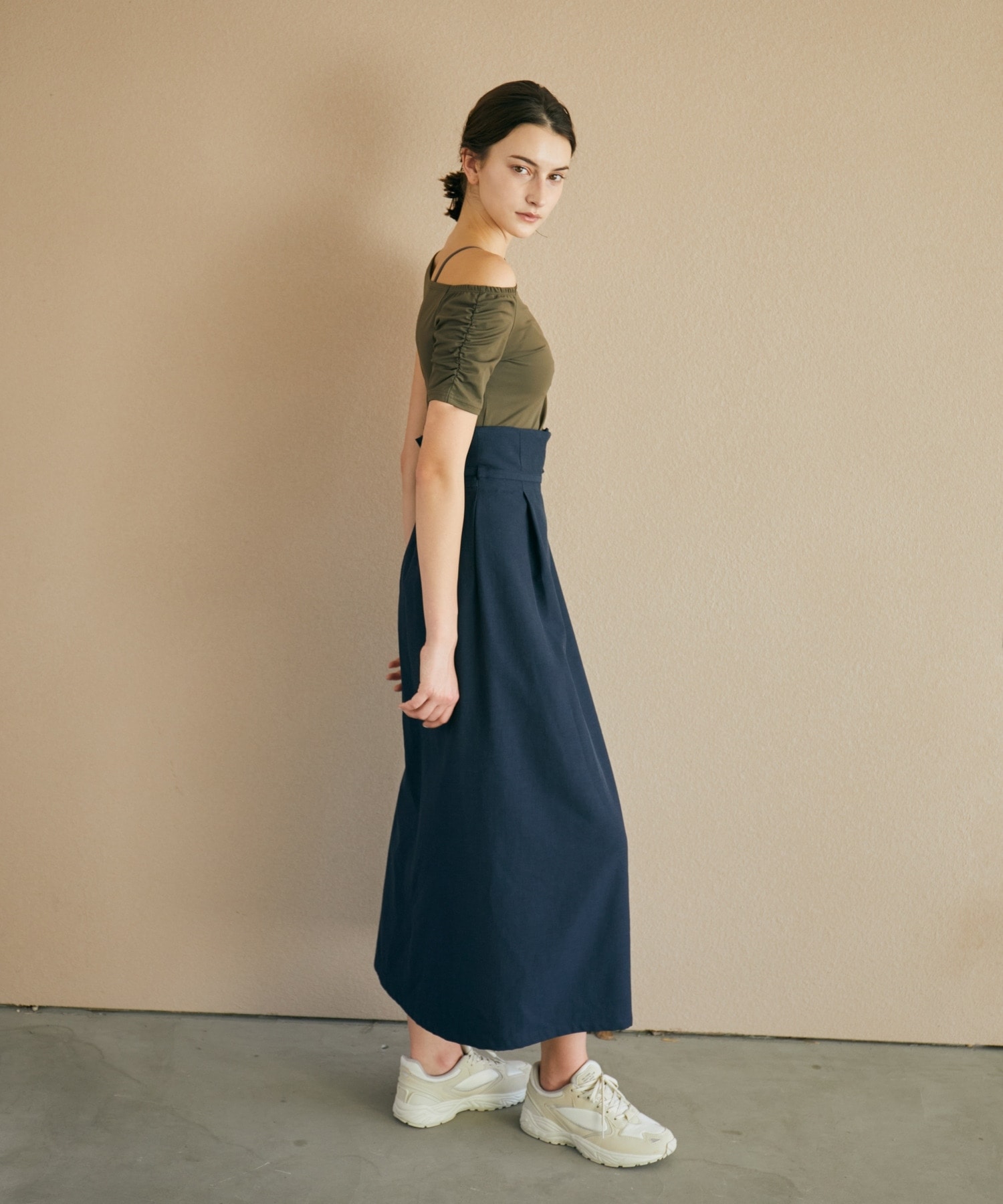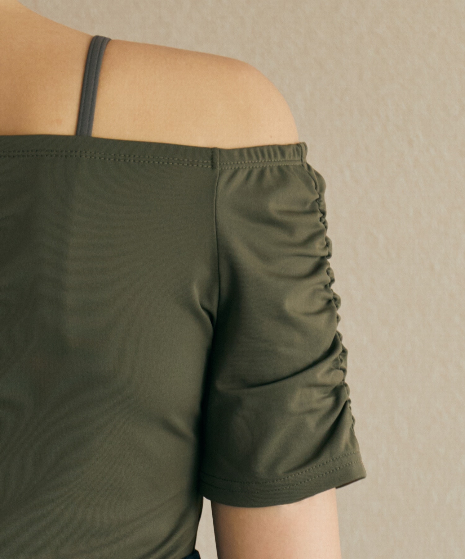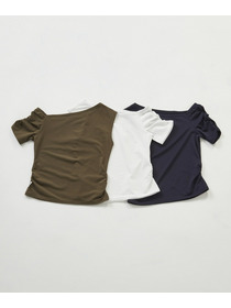 片方はノースリーブ、もう片方は肩を落として着る、アシンメトリーデザインです。