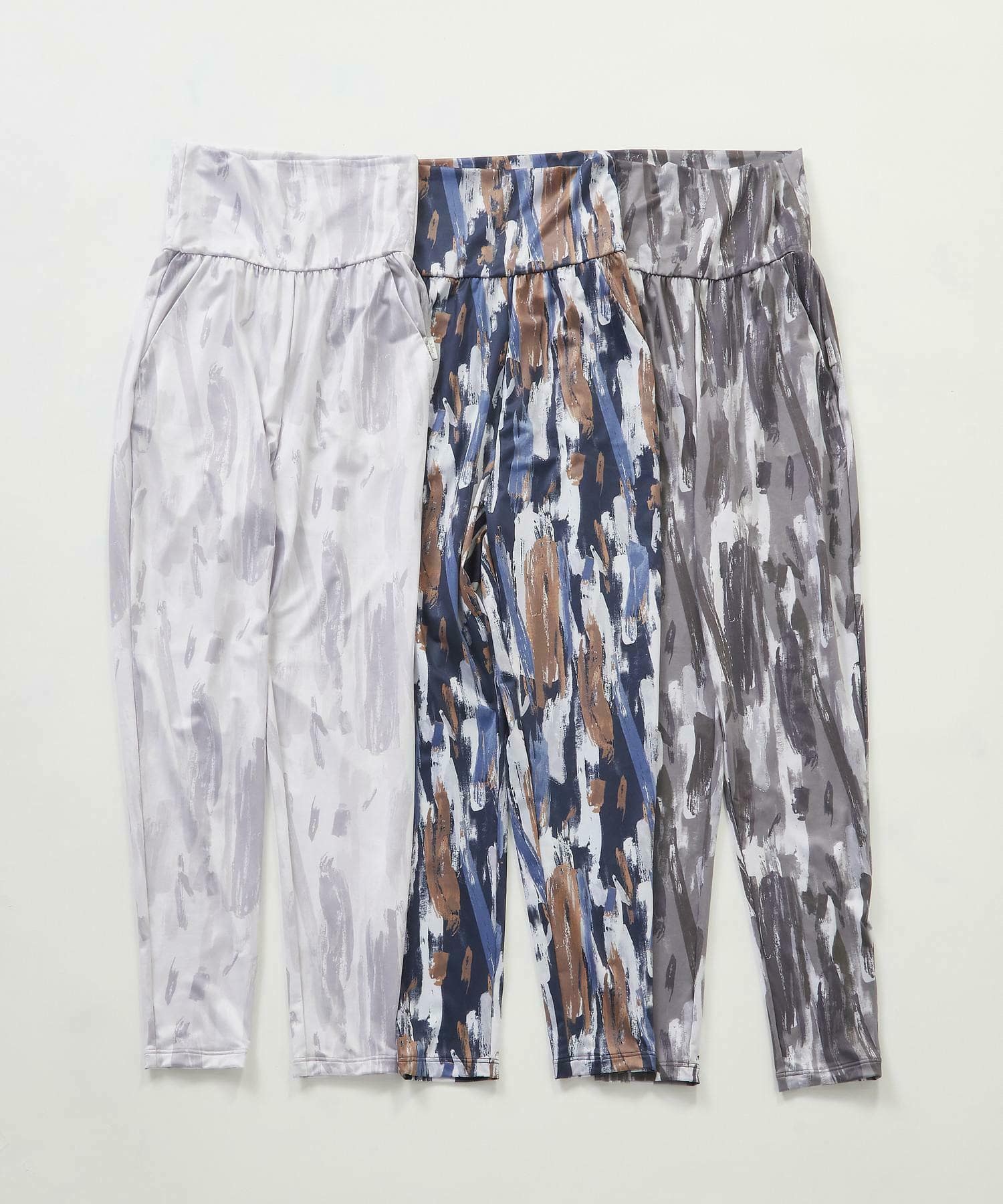着るだけでスタイルアップ!筆タッチの縦ラインが美シルエットを演出!軽やかに履けるギャザーパンツ今季イチオシのオリジナルプリントは、筆で書いたような縦ラインが、着やせ効果抜群です。
