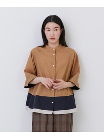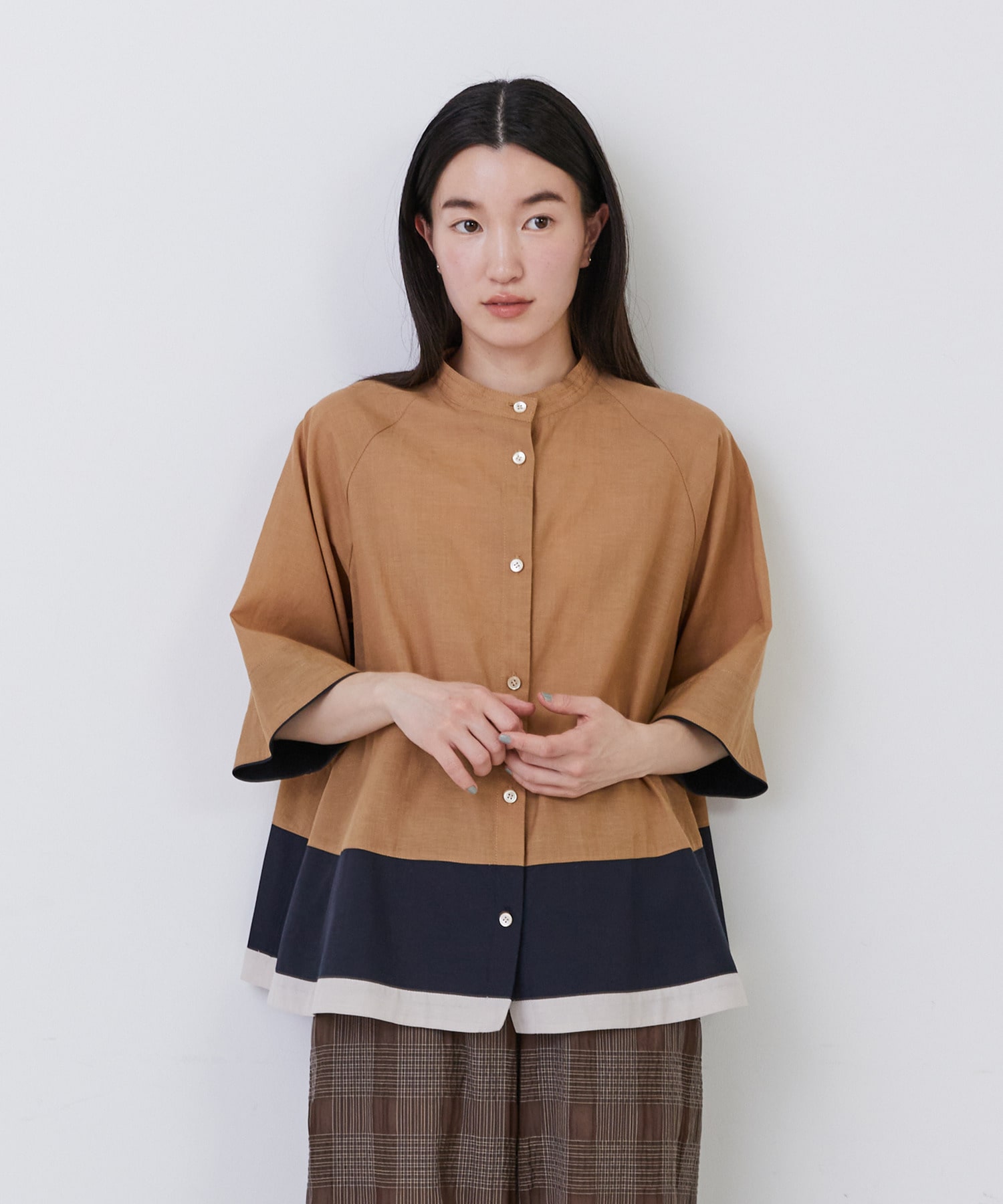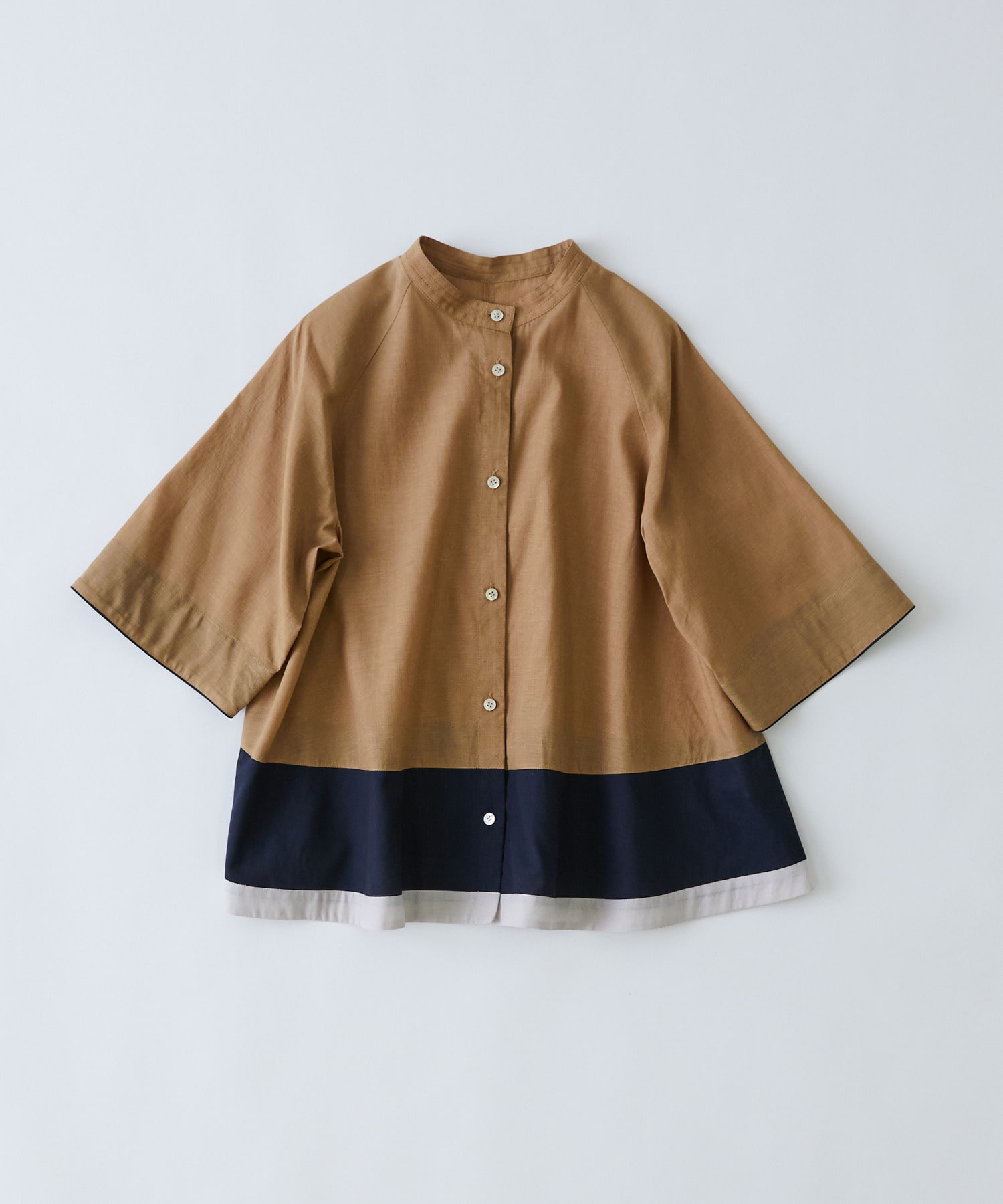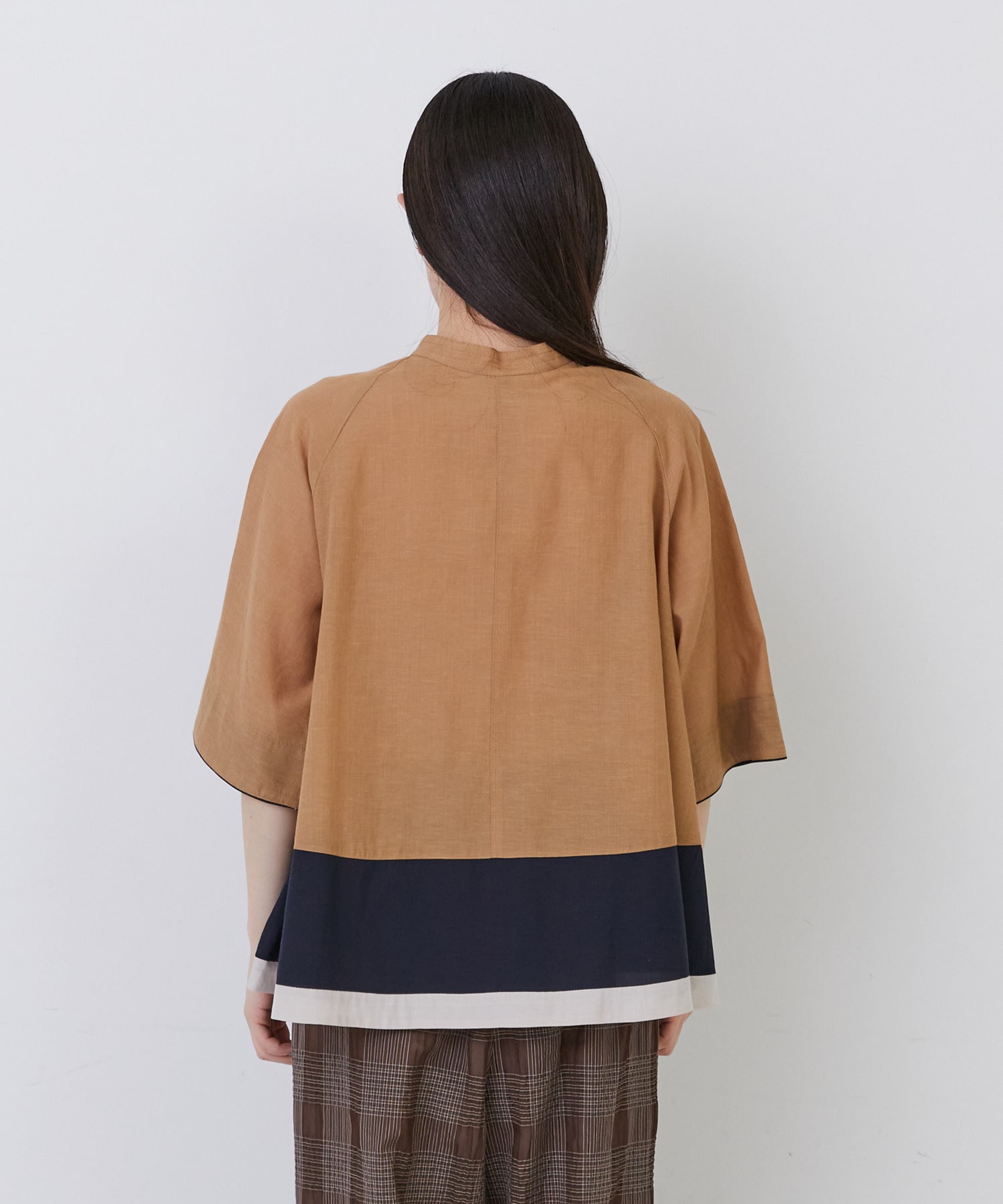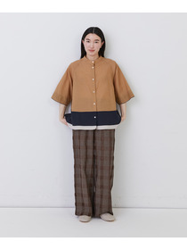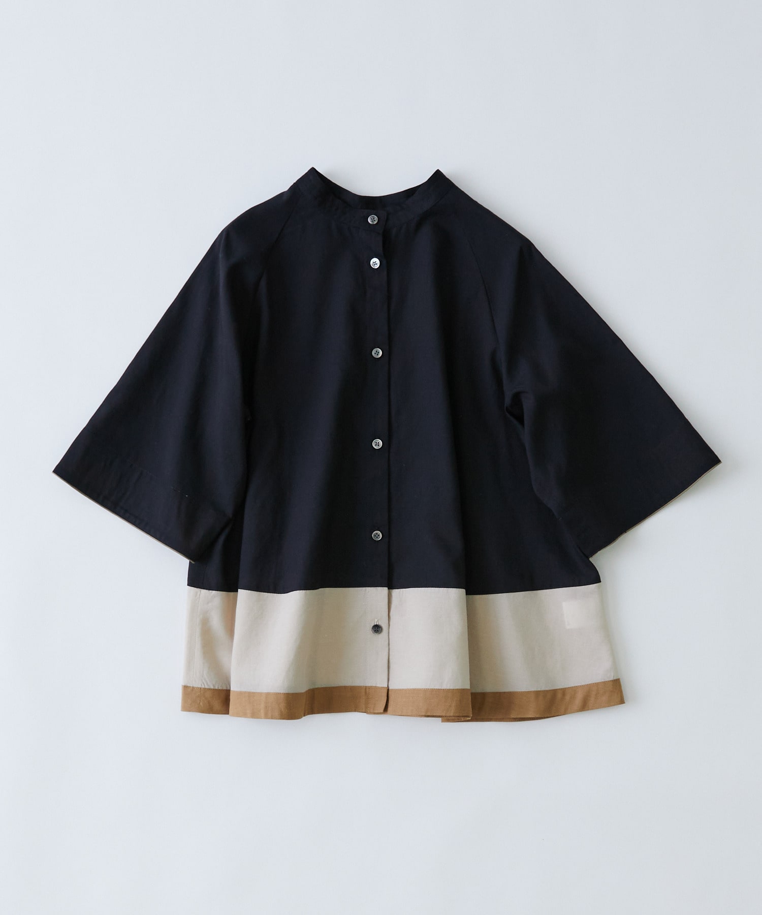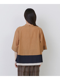 袖を折り返すと配色になるパターンで、折らずに着た時の配色細芯パイピングもポイントです。