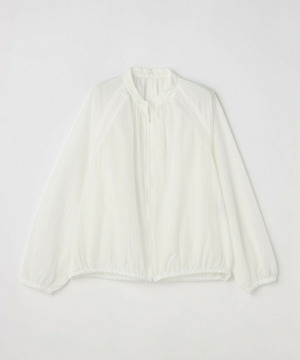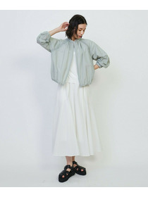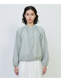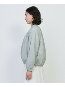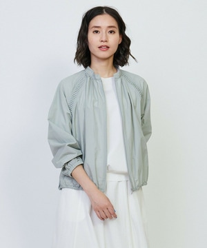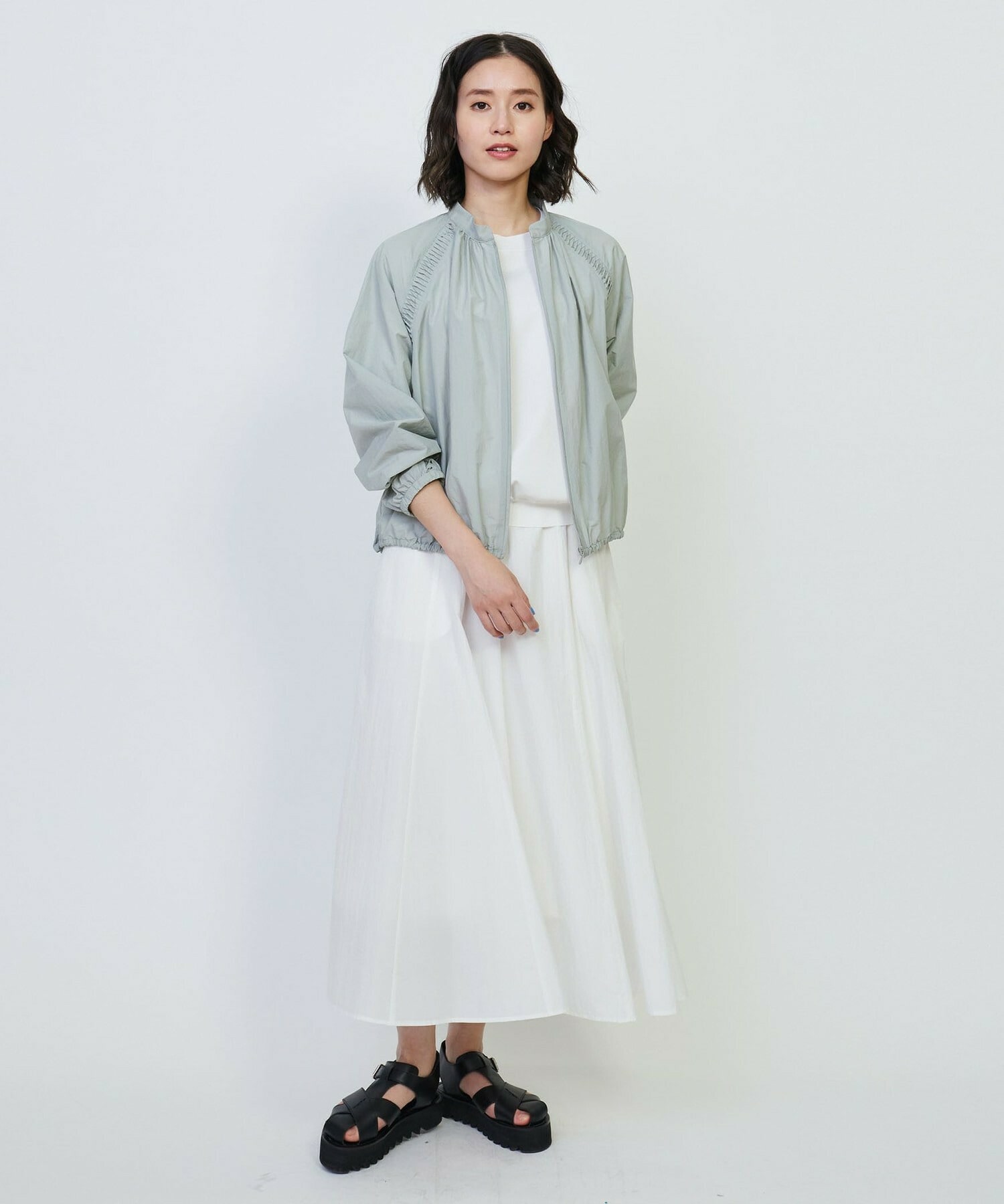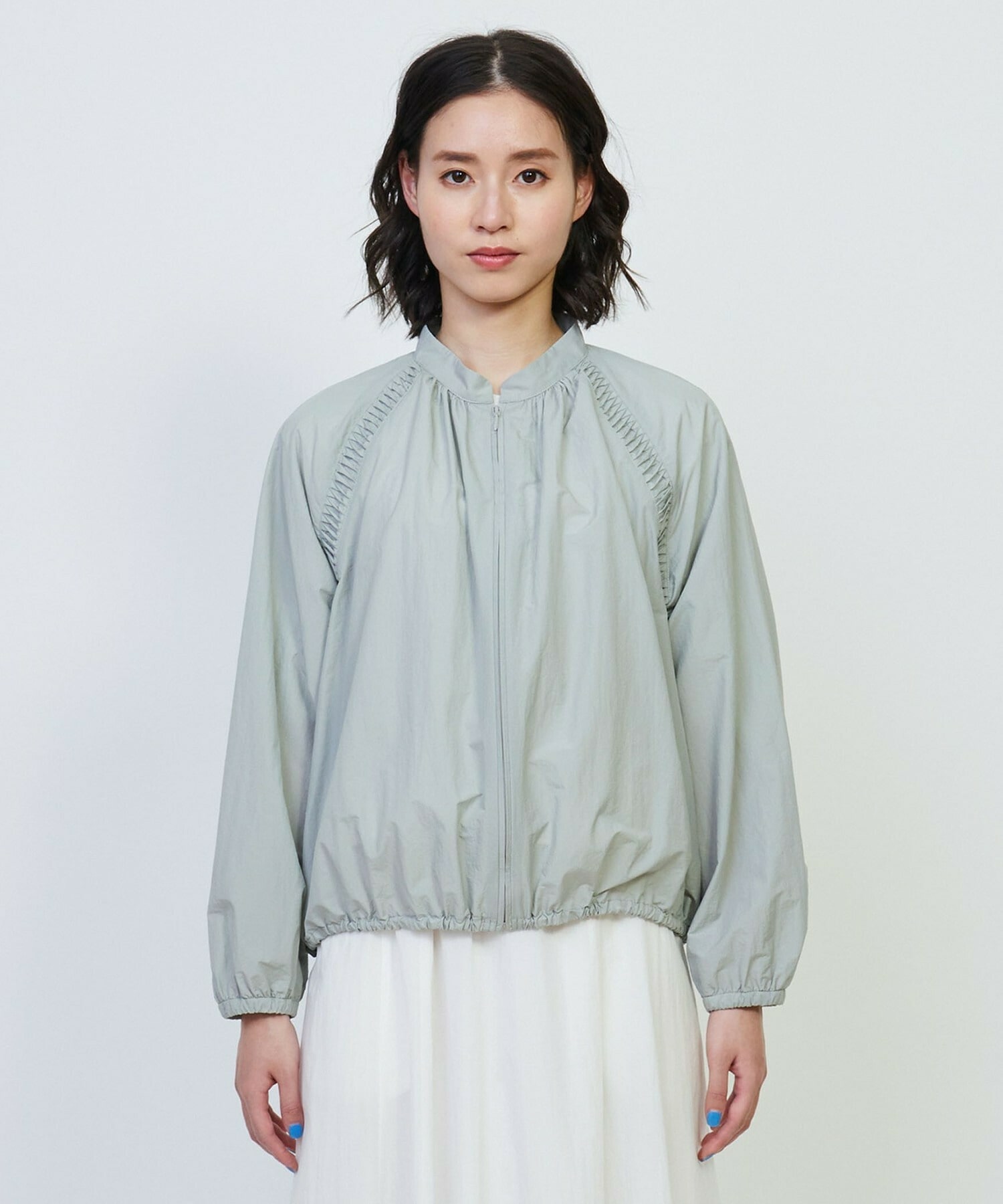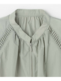 襟元や袖口のギャザーとアームホールに沿って入れたテープ状のランダムタックが目を引く一着です。フロントはファスナー仕立てで羽織としてもお使いいただけます。同素材のスカート(B5552FSK031)やワンピース(B5552FOP032)とのセットアップの着こなしもおすすめです。