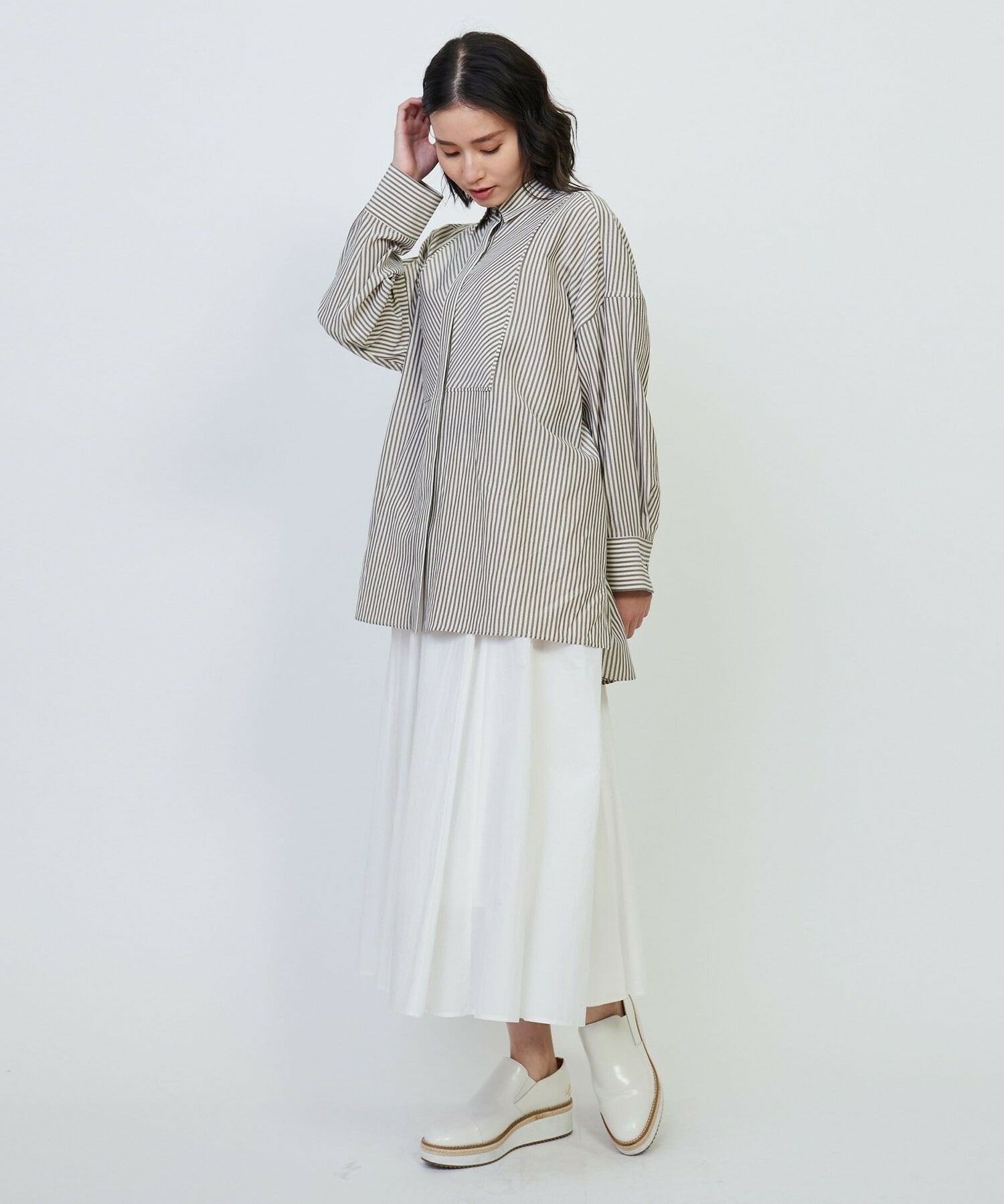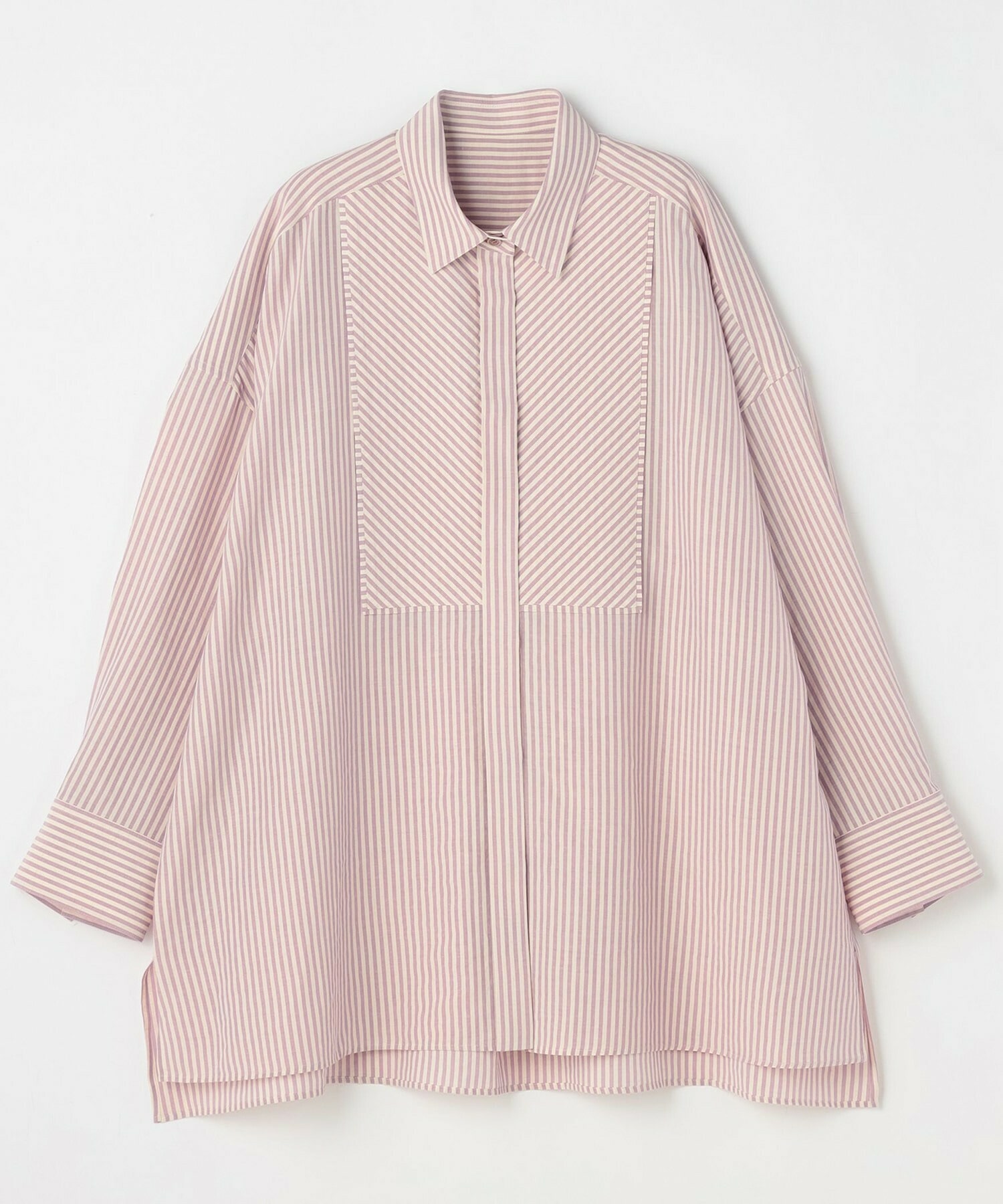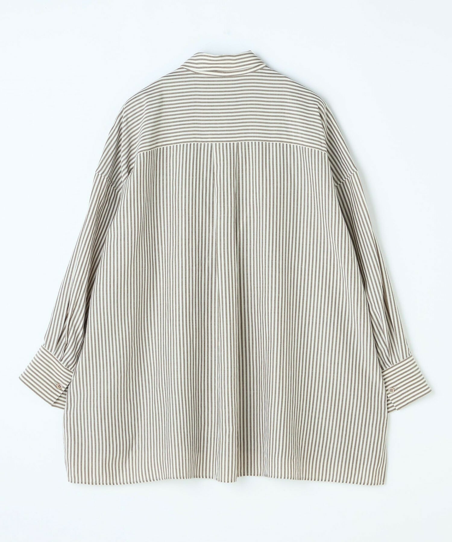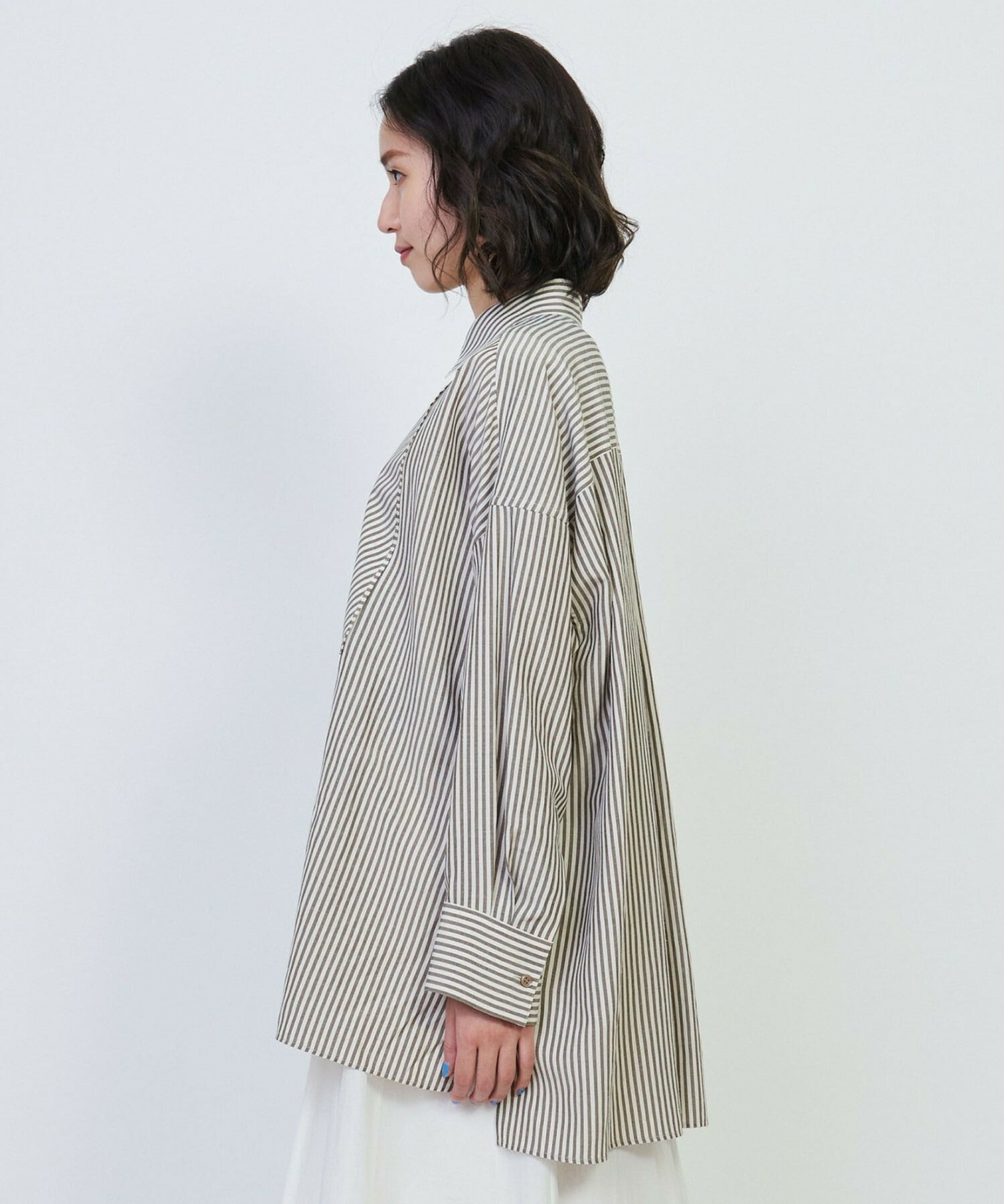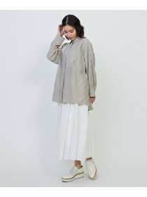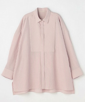 ナチュラル感のあるカラーストライプでシワになりにくいイージーケア素材です。細身のパンツと合わせるのがおすすめです。羽織りアイテムとしてもお使いいただけます。