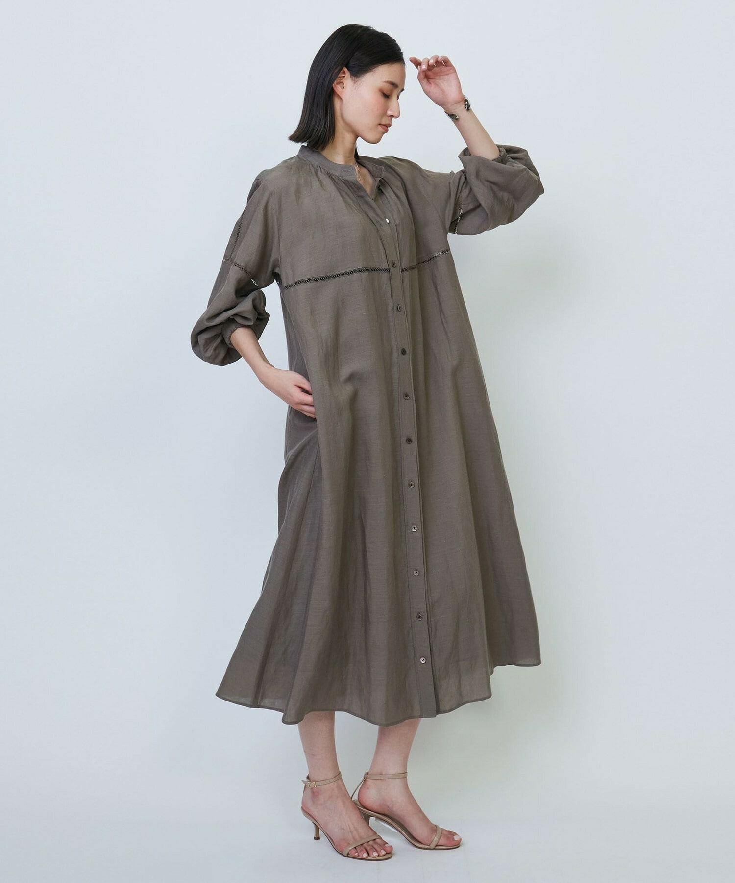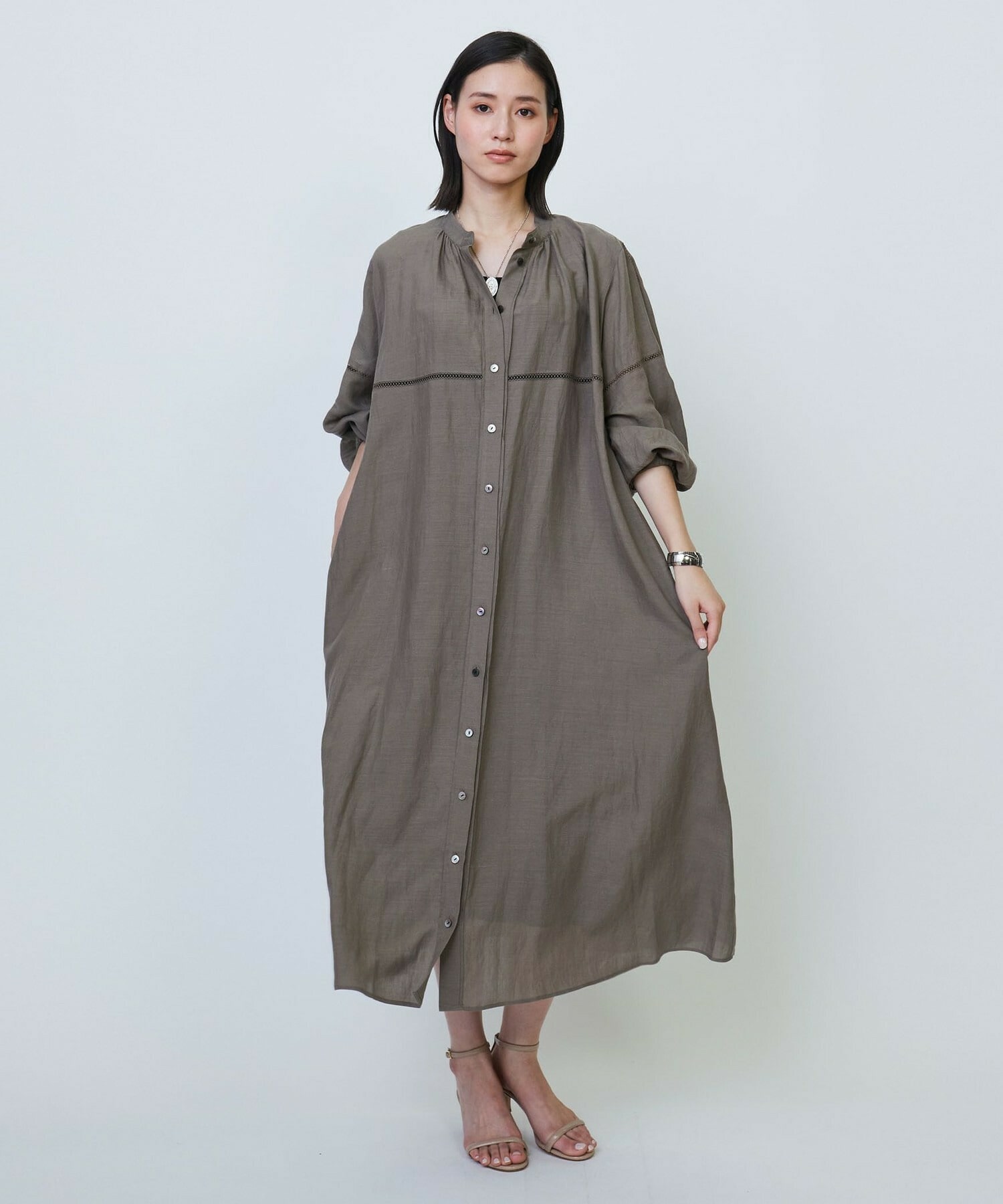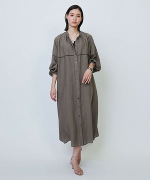 しなやかな風合の再生繊維(セルロース)をタテ糸に細番手の麻糸をヨコ糸にうち、ハリ感の中に程よいドレープ性を持たせた素材です。仕上げに優しく生地を叩きほぐし、洗いざらしのようなソフトで膨らみのある風合に仕上げています。