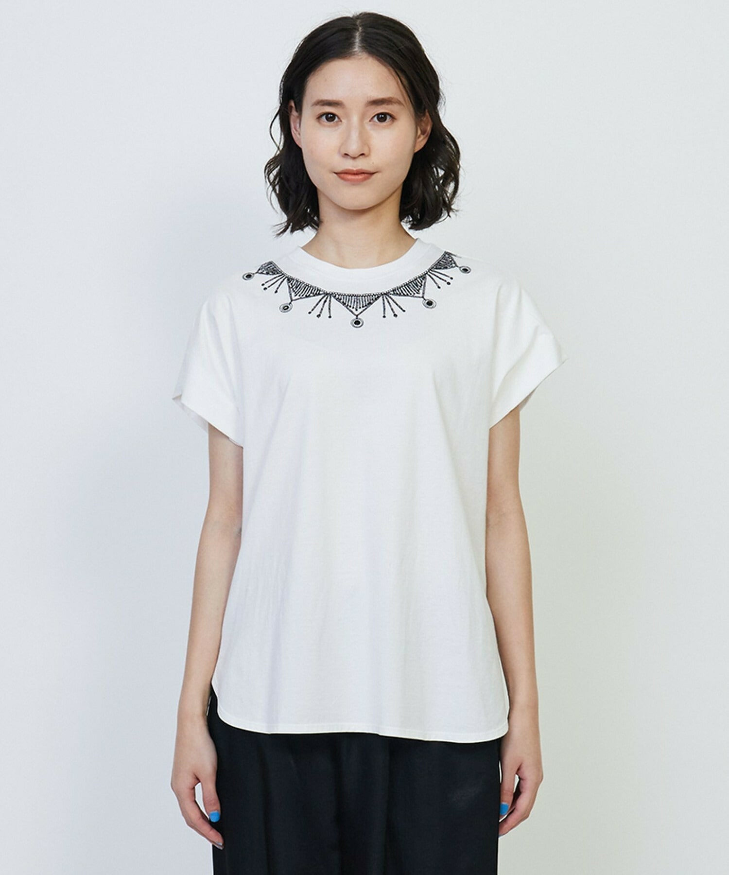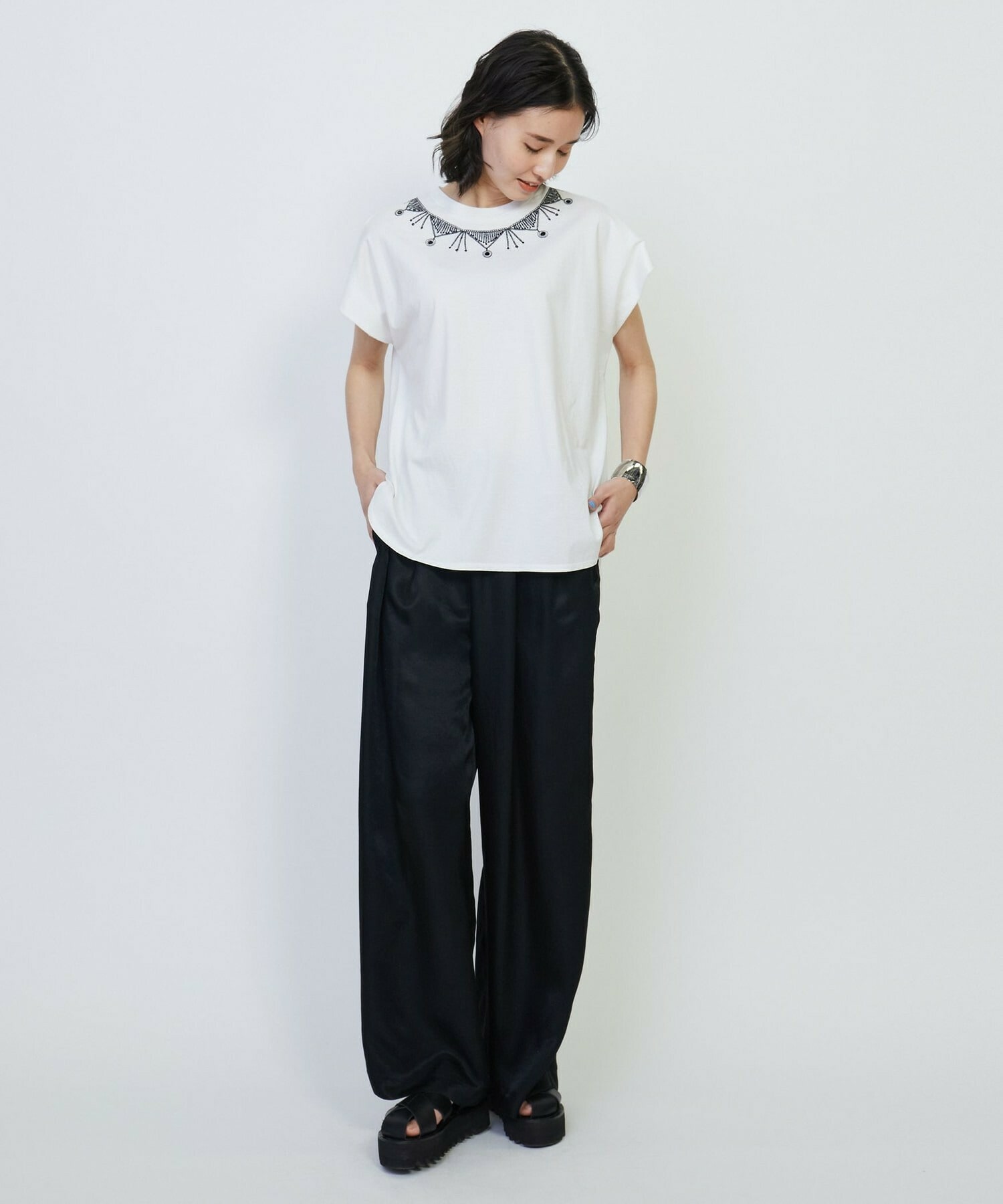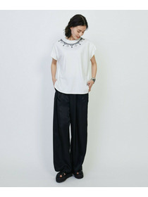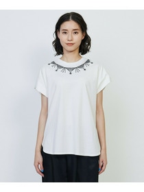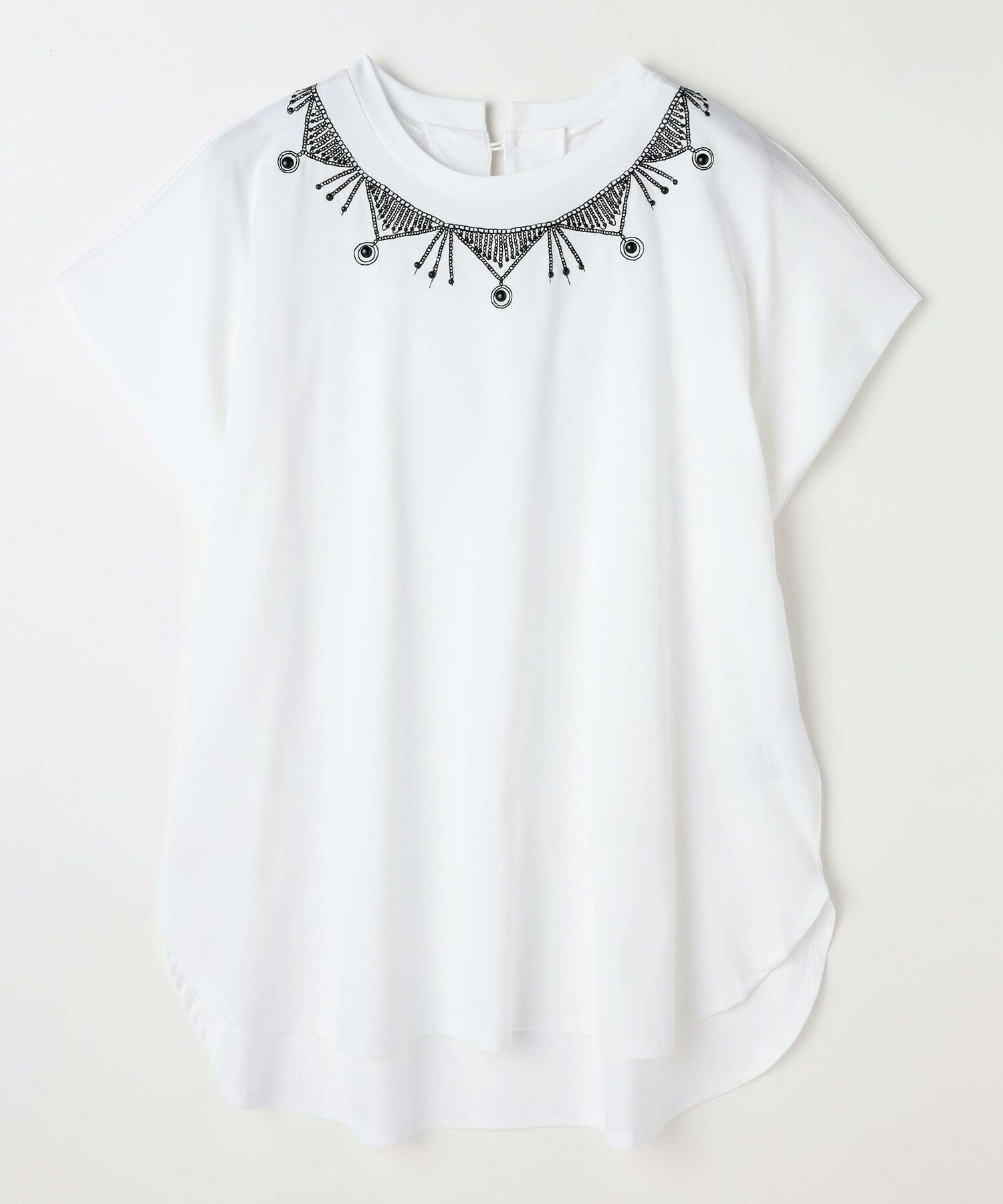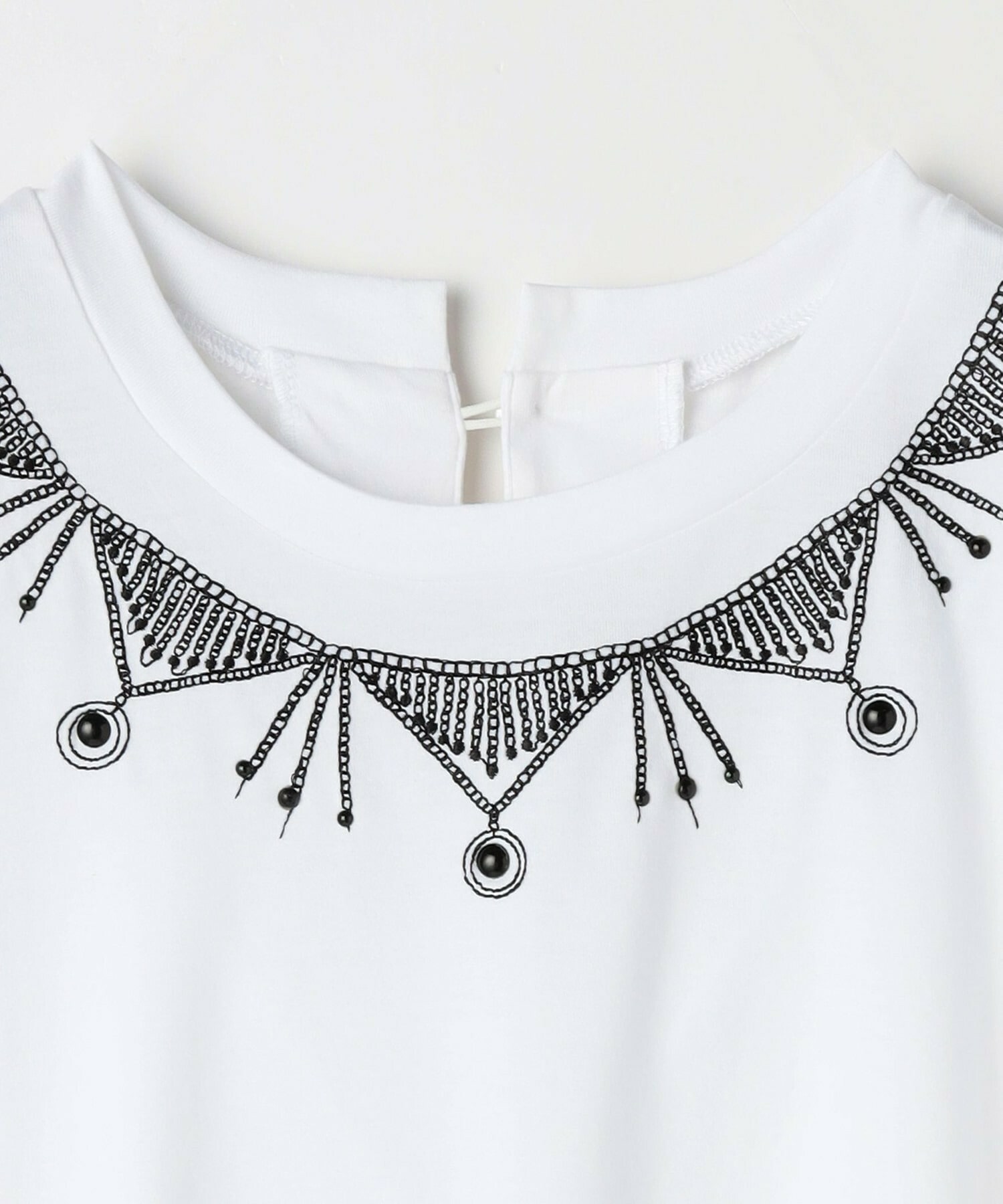 ネックラインに沿って施したネックレスをイメージした刺繍とビジュー使いがキャッチーなTシャツです。
