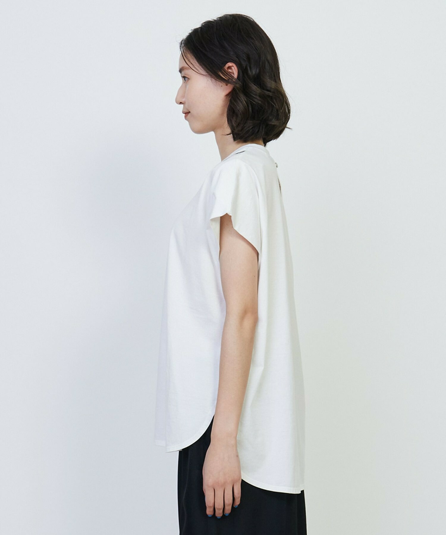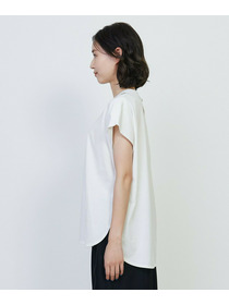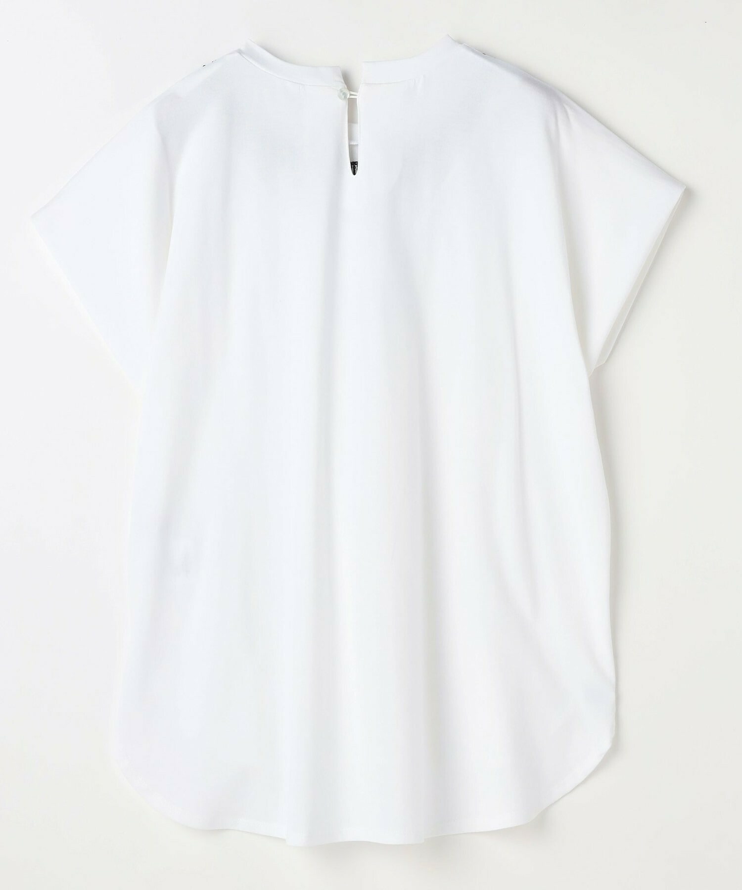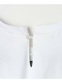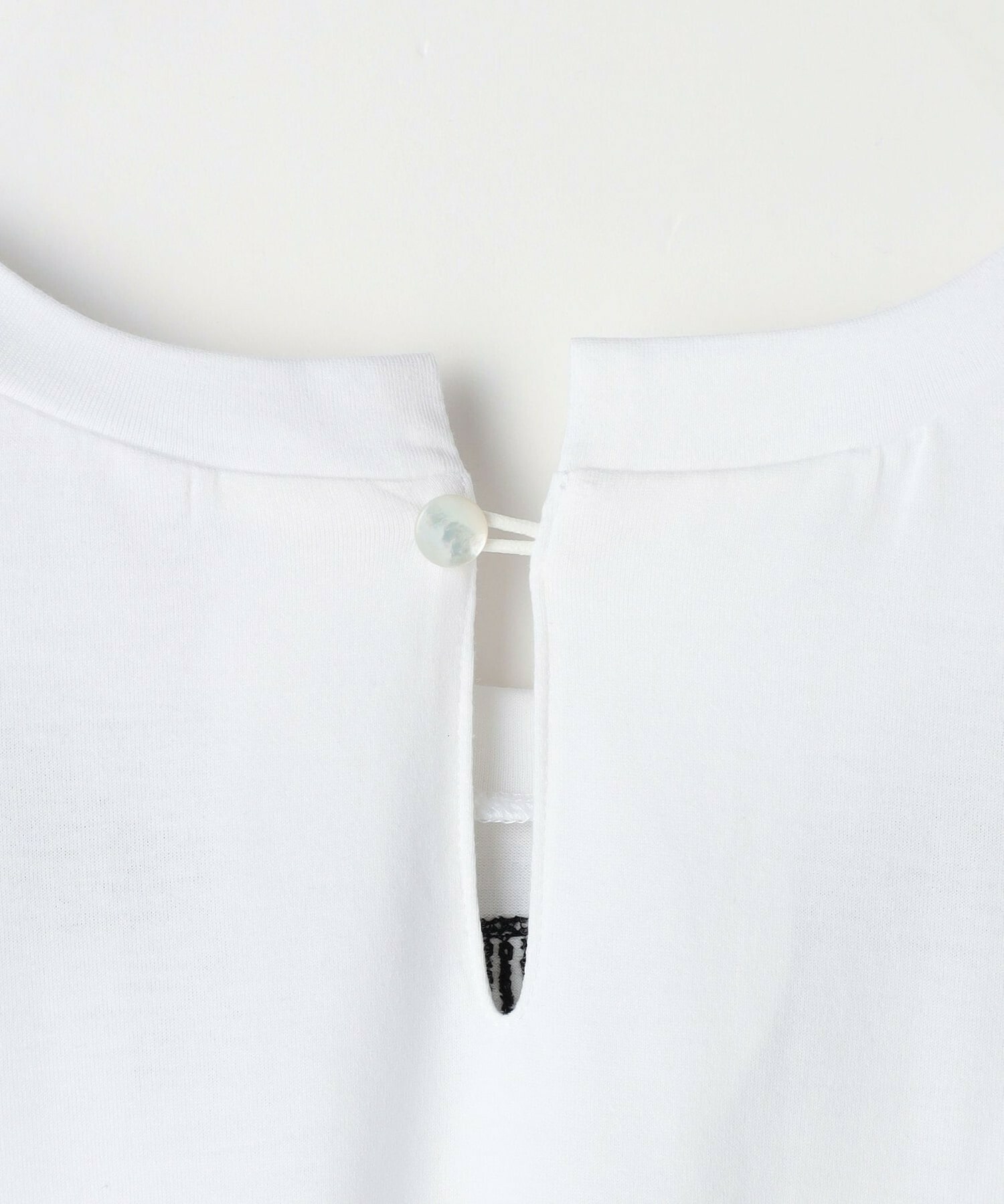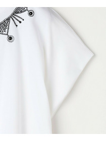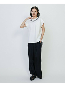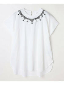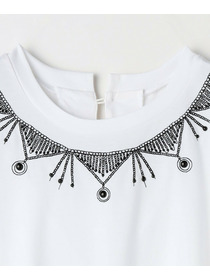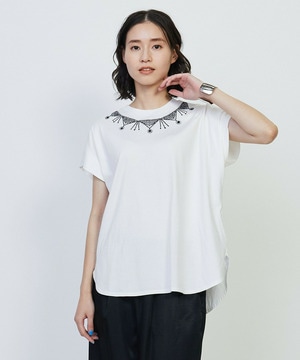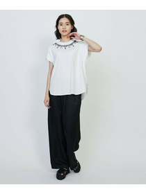 ネックラインに沿って施したネックレスをイメージした刺繍とビジュー使いがキャッチーなTシャツです。