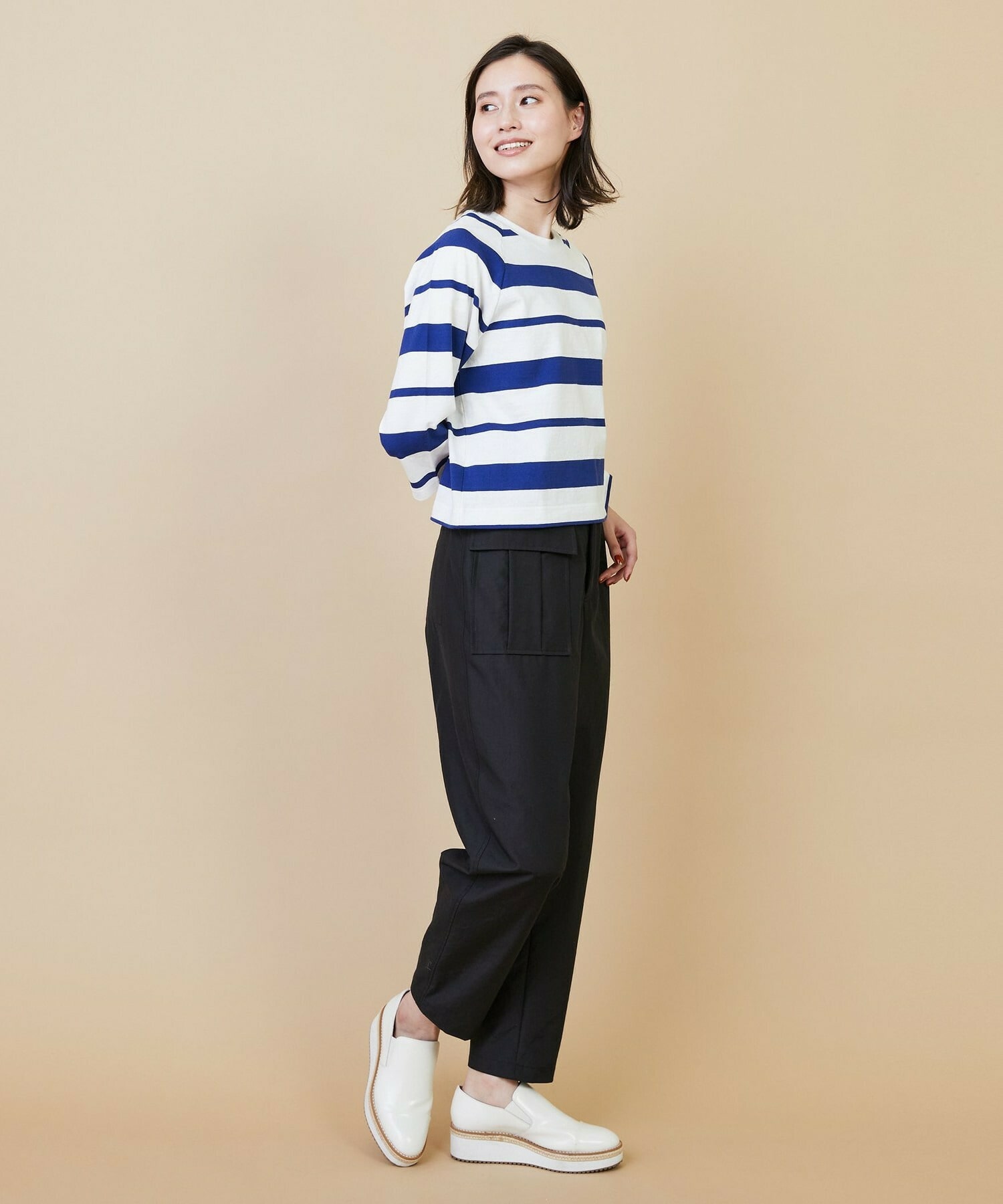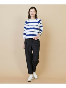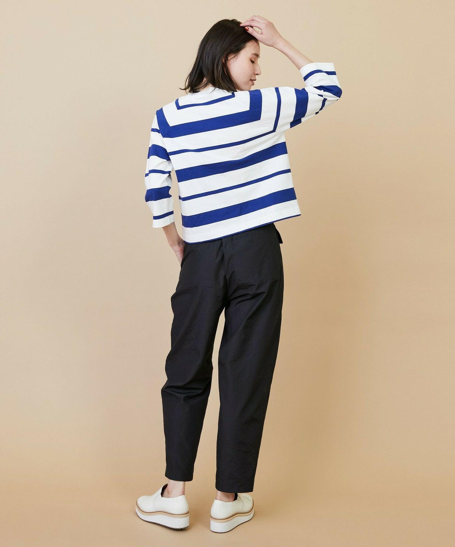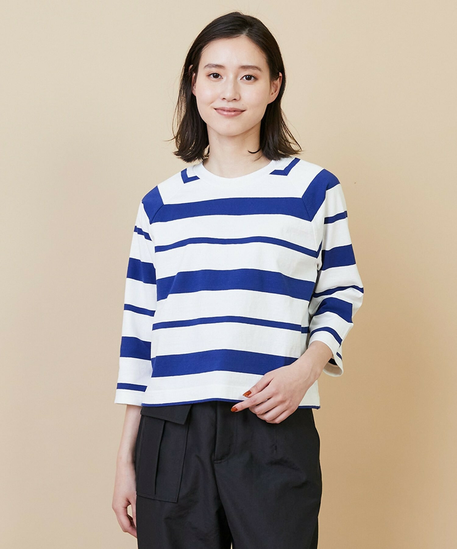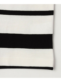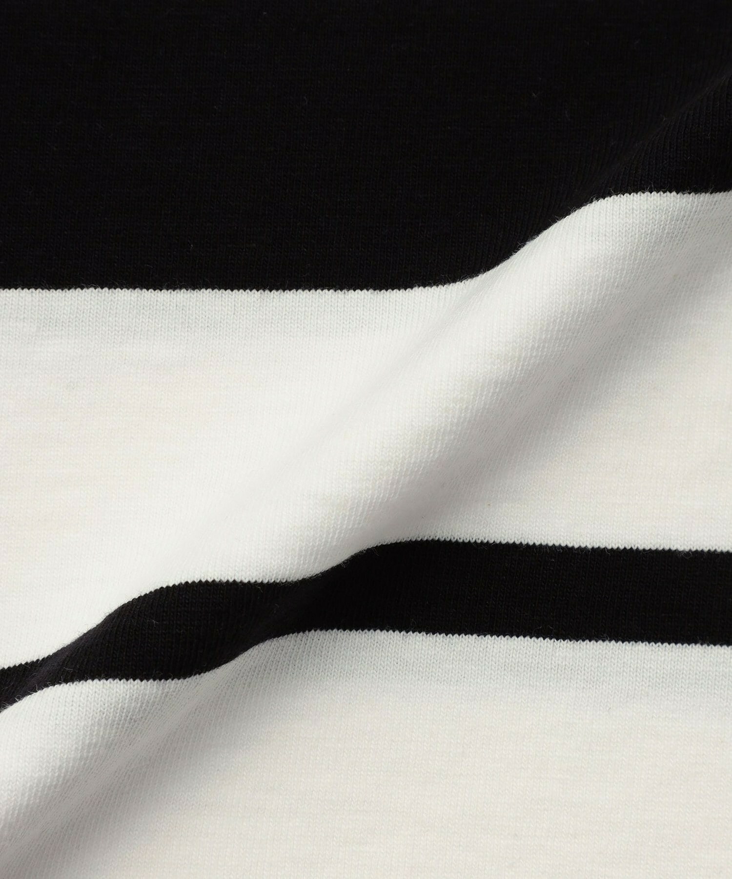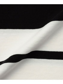 ワイドなボーダーでありながら、ラインの幅に変化をつけることで、とても女性らしい印象のボーダー柄に仕上がっております。また、リサイクル糸を使用することで、糸のムラ感が生地の表情を生み出しています。