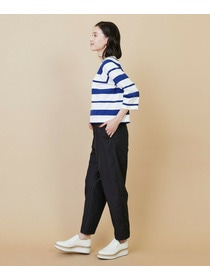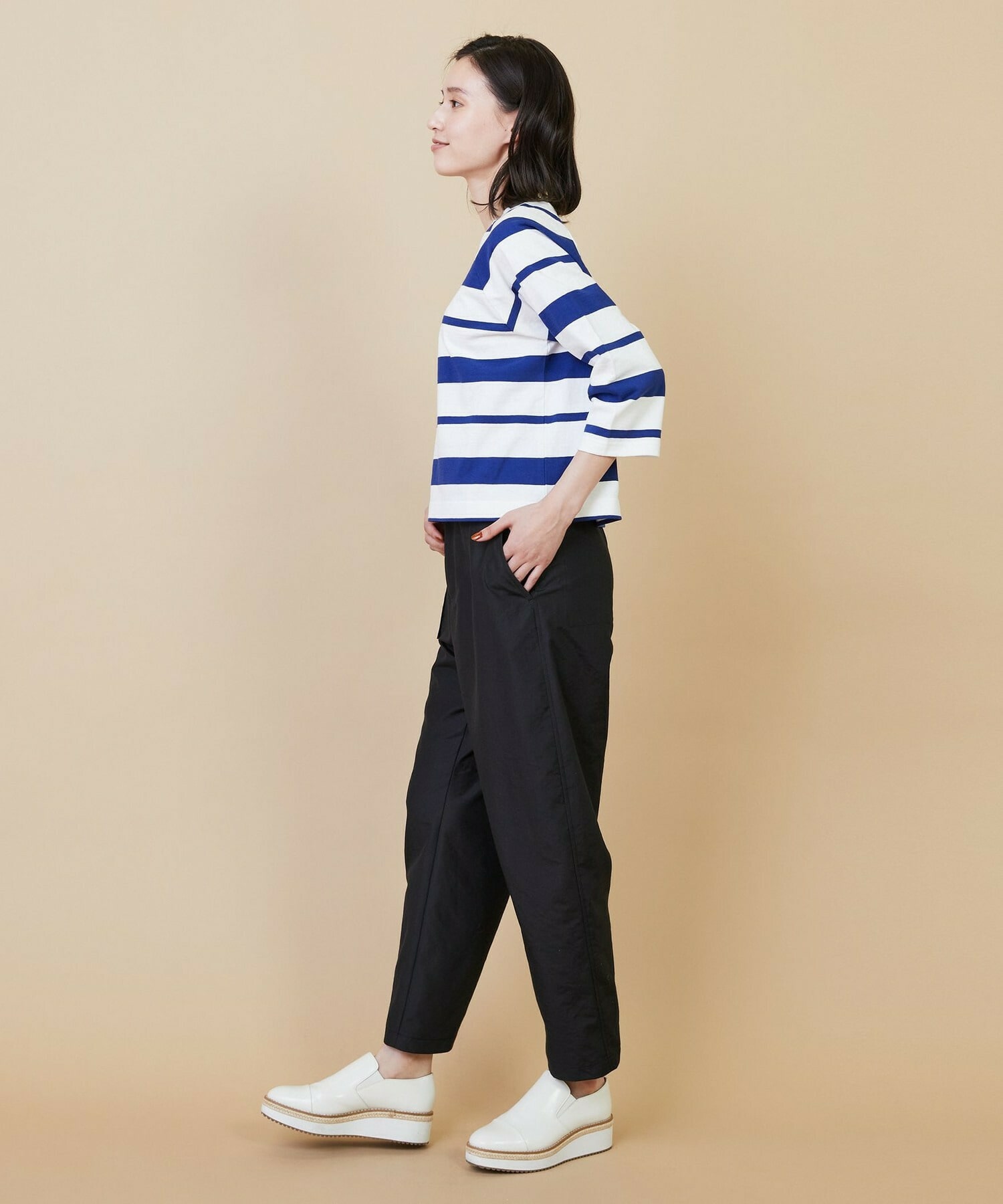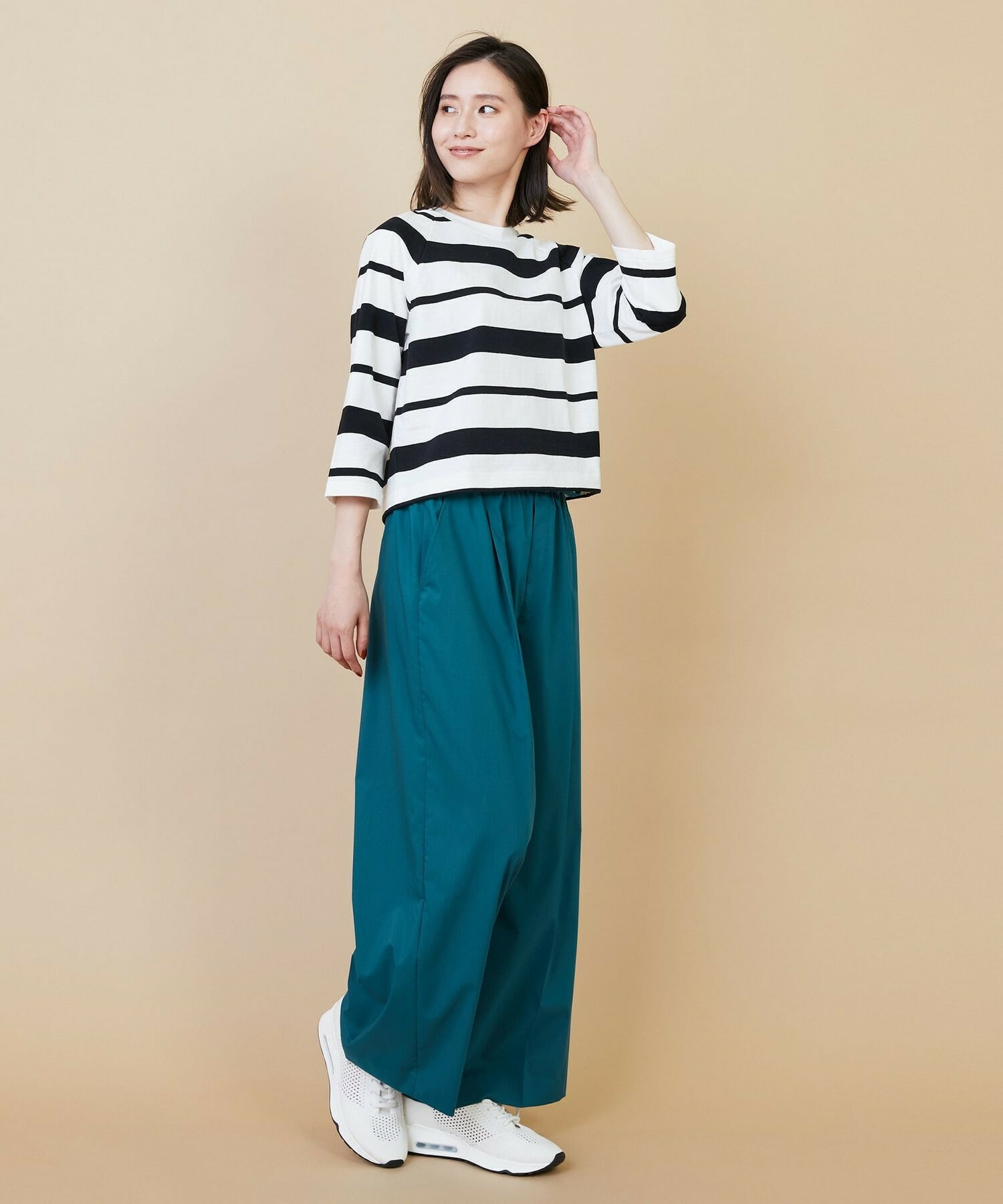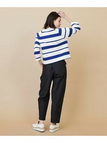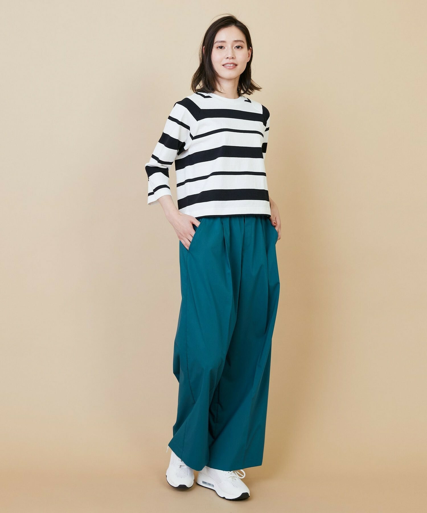 ワイドなボーダーでありながら、ラインの幅に変化をつけることで、とても女性らしい印象のボーダー柄に仕上がっております。また、リサイクル糸を使用することで、糸のムラ感が生地の表情を生み出しています。