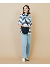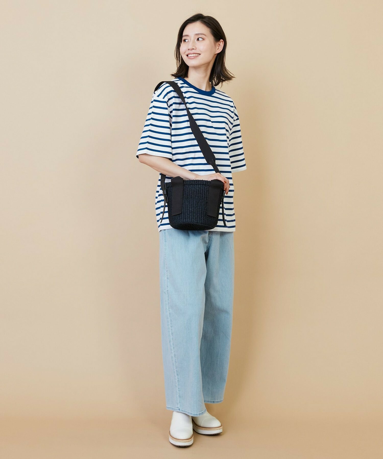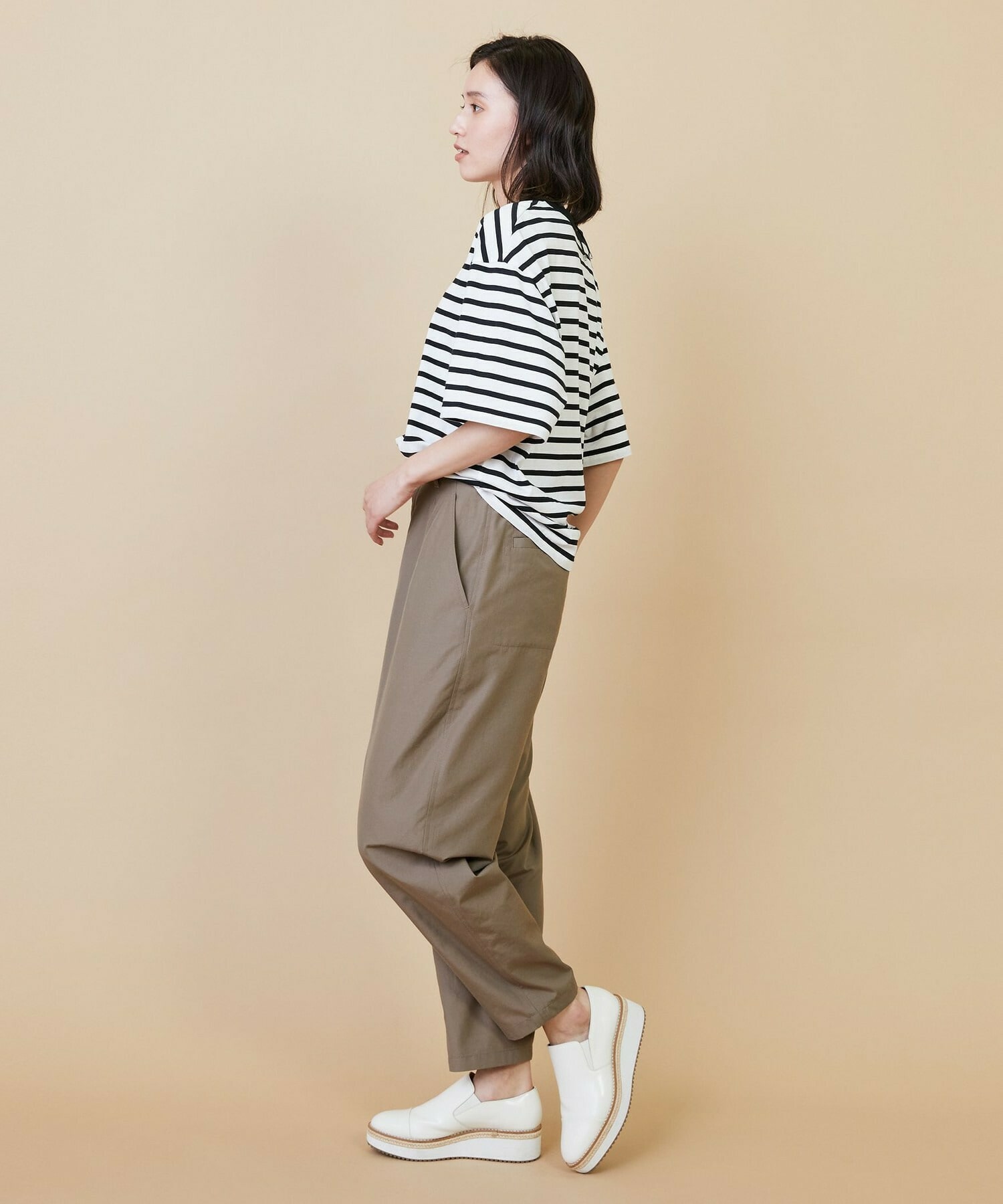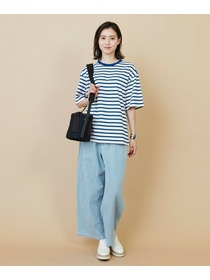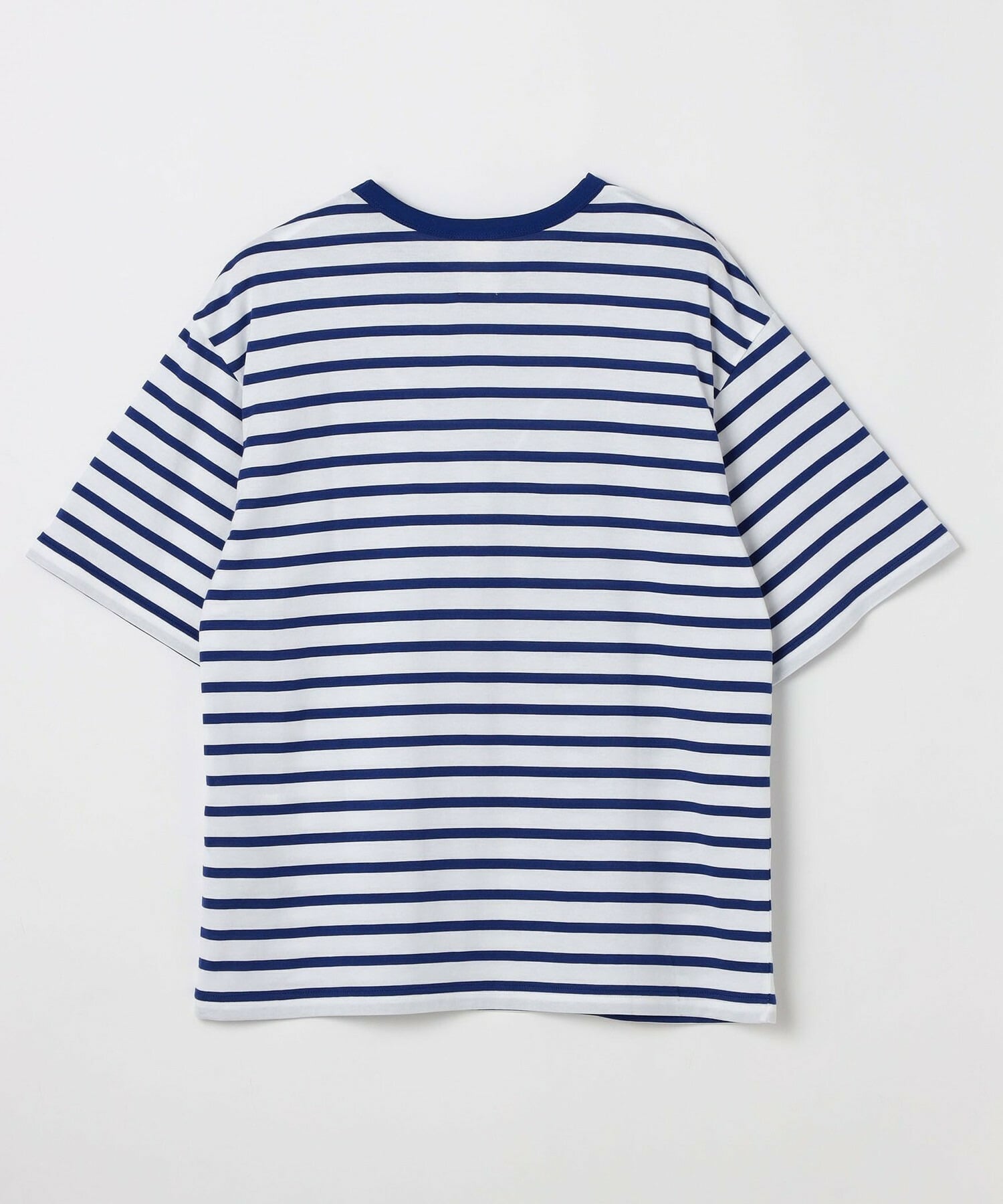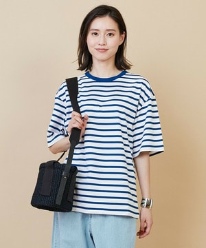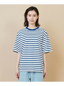 シンプルなボーダー柄ではありますが、白のラインをやや太くすることで、清涼感があり、女性らしい印象のボーダー柄になっています。デザインは、ゆったりとした身幅とやや長めの半袖のバランスが上品なボーダーTシャツです。