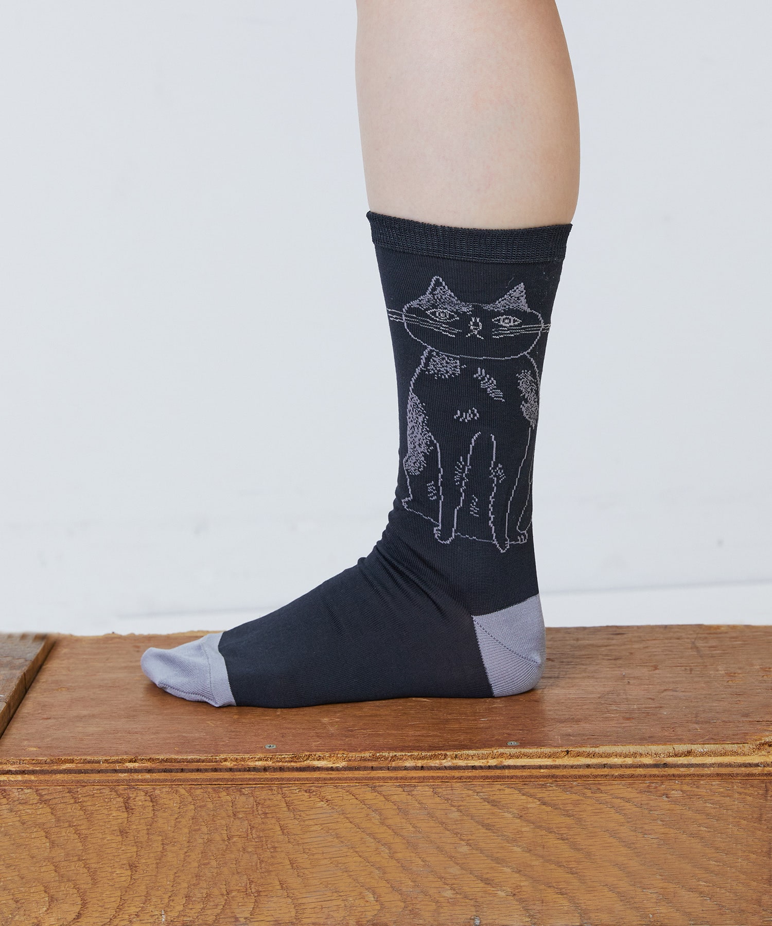 ぽってりとしたフォルムの猫を編み込んだソックス。