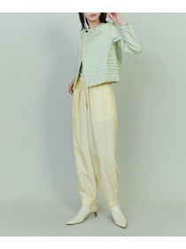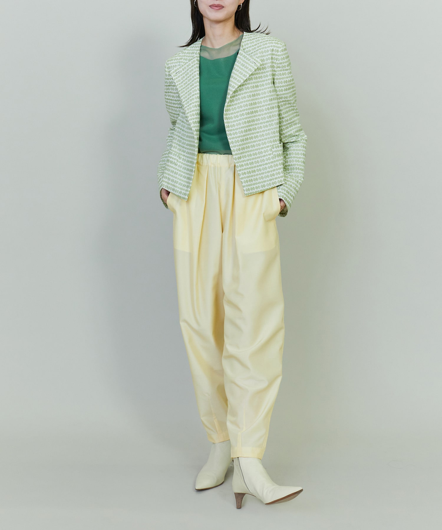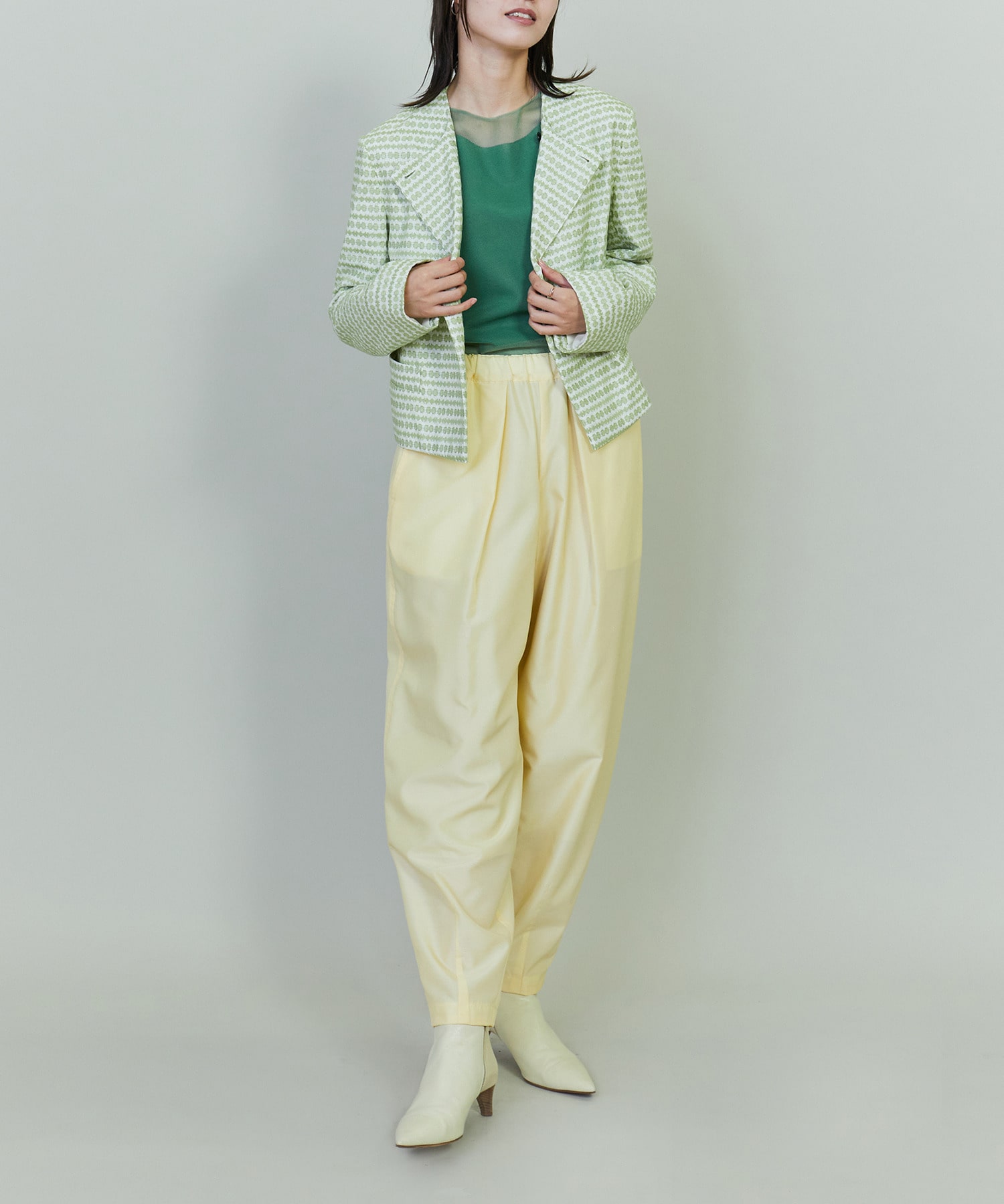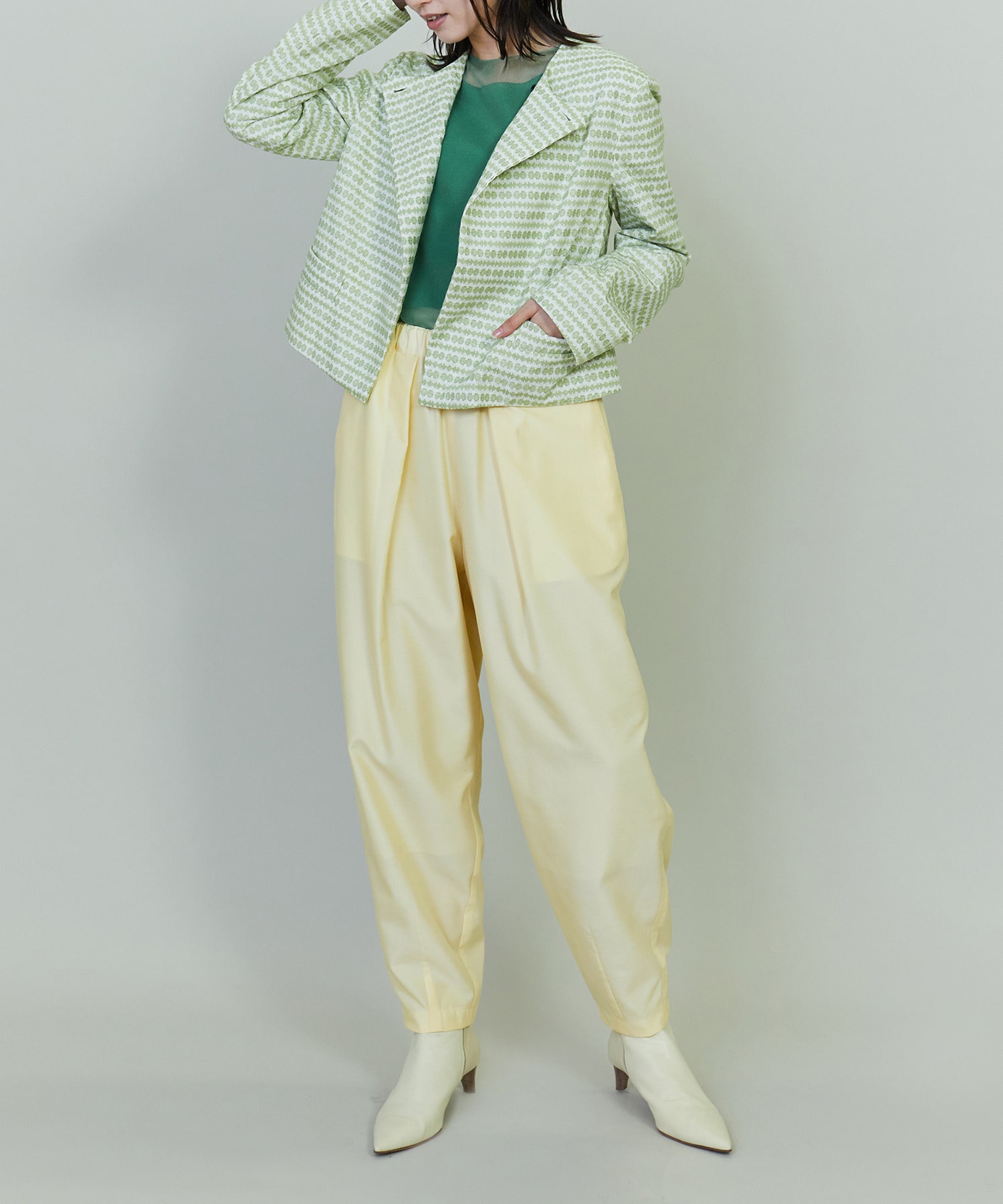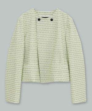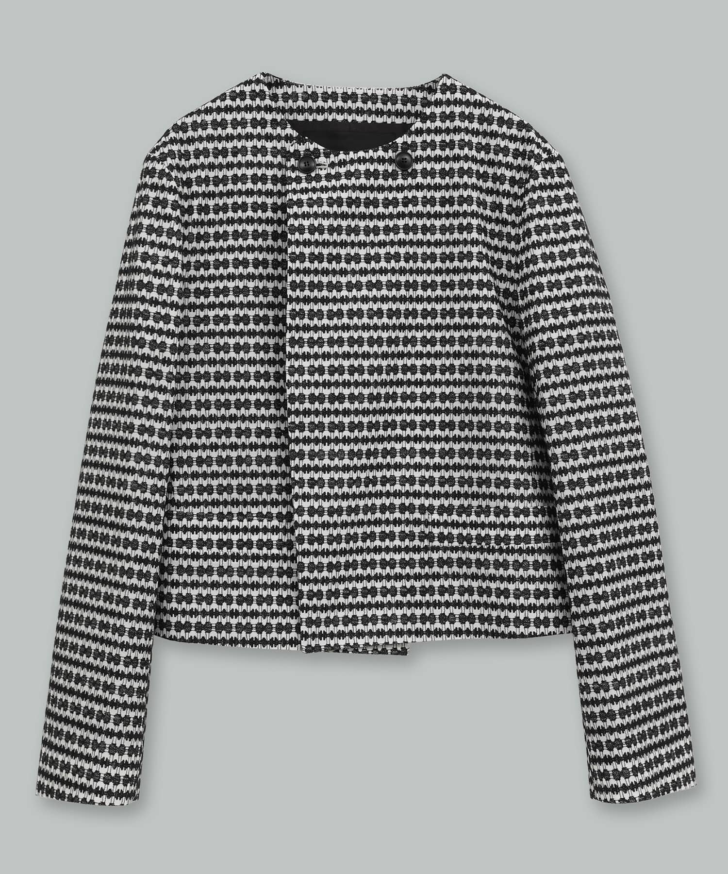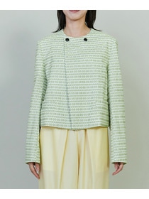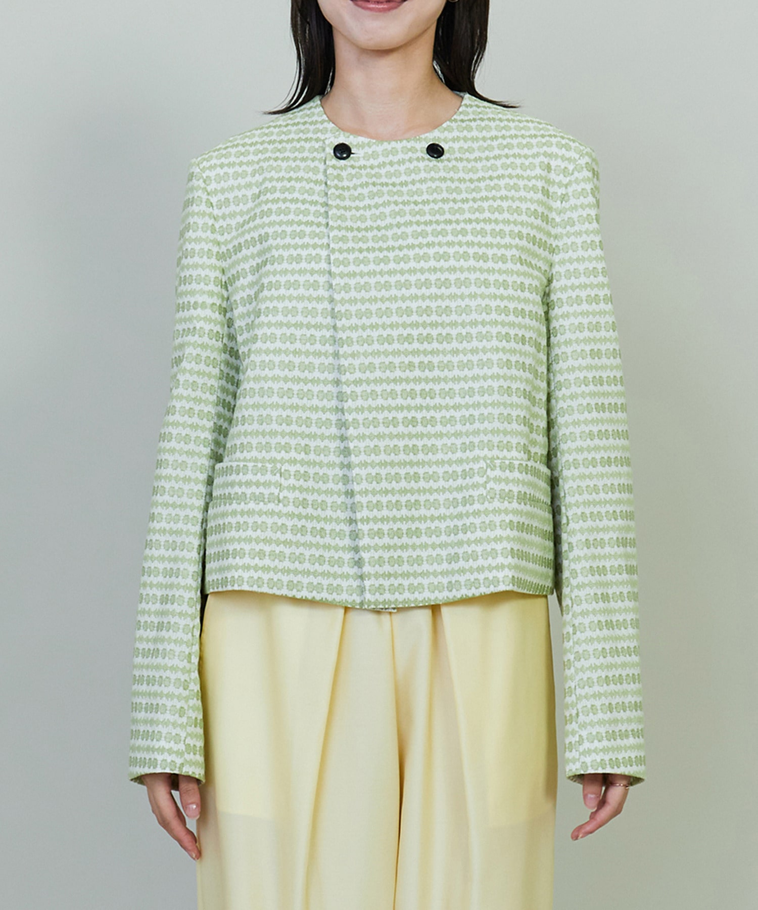 エレガントとマニッシュ感を持ち合わせたノーカラージャケットです。フラップ、ボタン位置を工夫することでモダンに仕上げました。