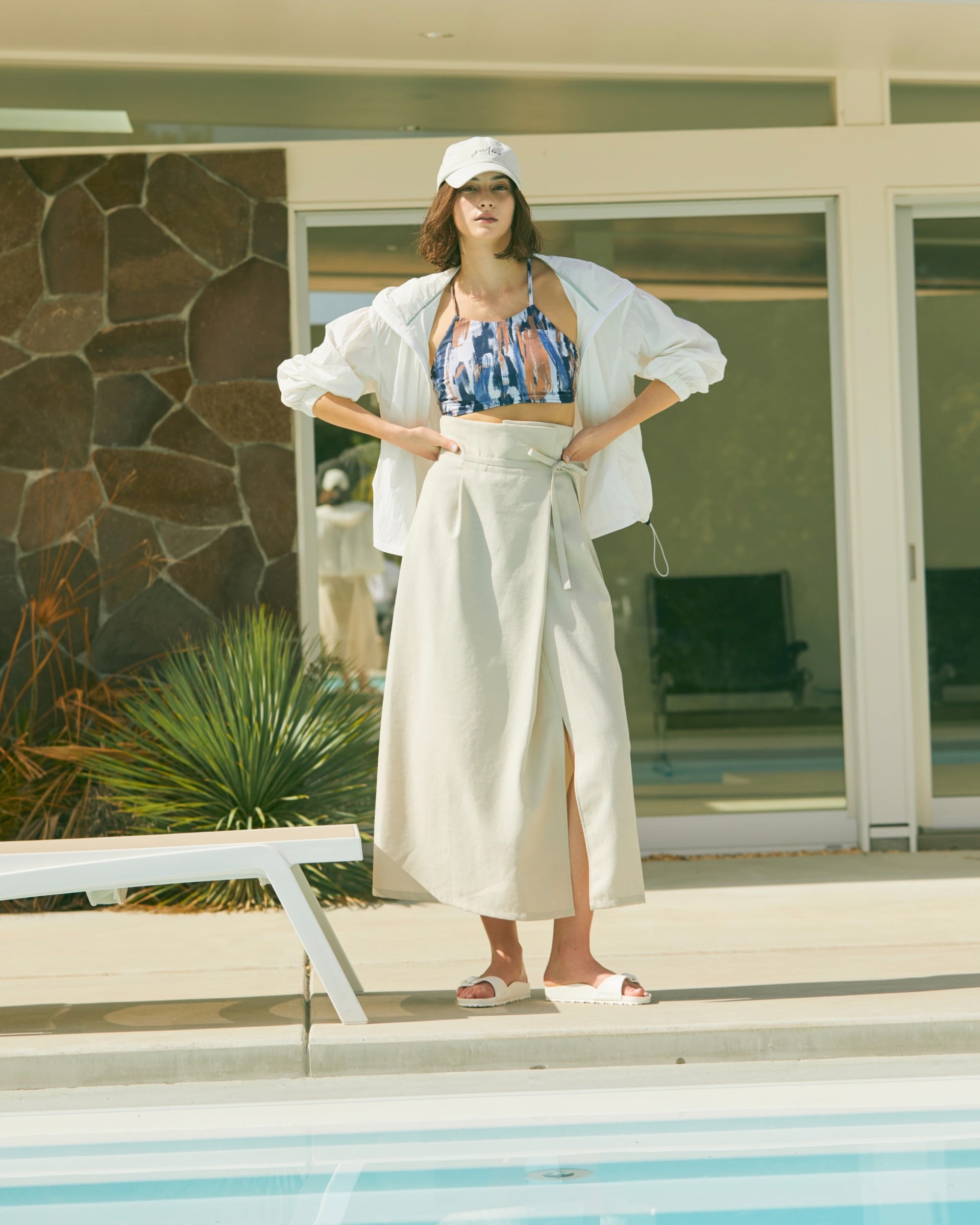 さっと巻くだけで、こなれ感の出るラップスカートは、動くたびに美しく揺れ、大人の余裕を感じるスタイルに仕上がります。