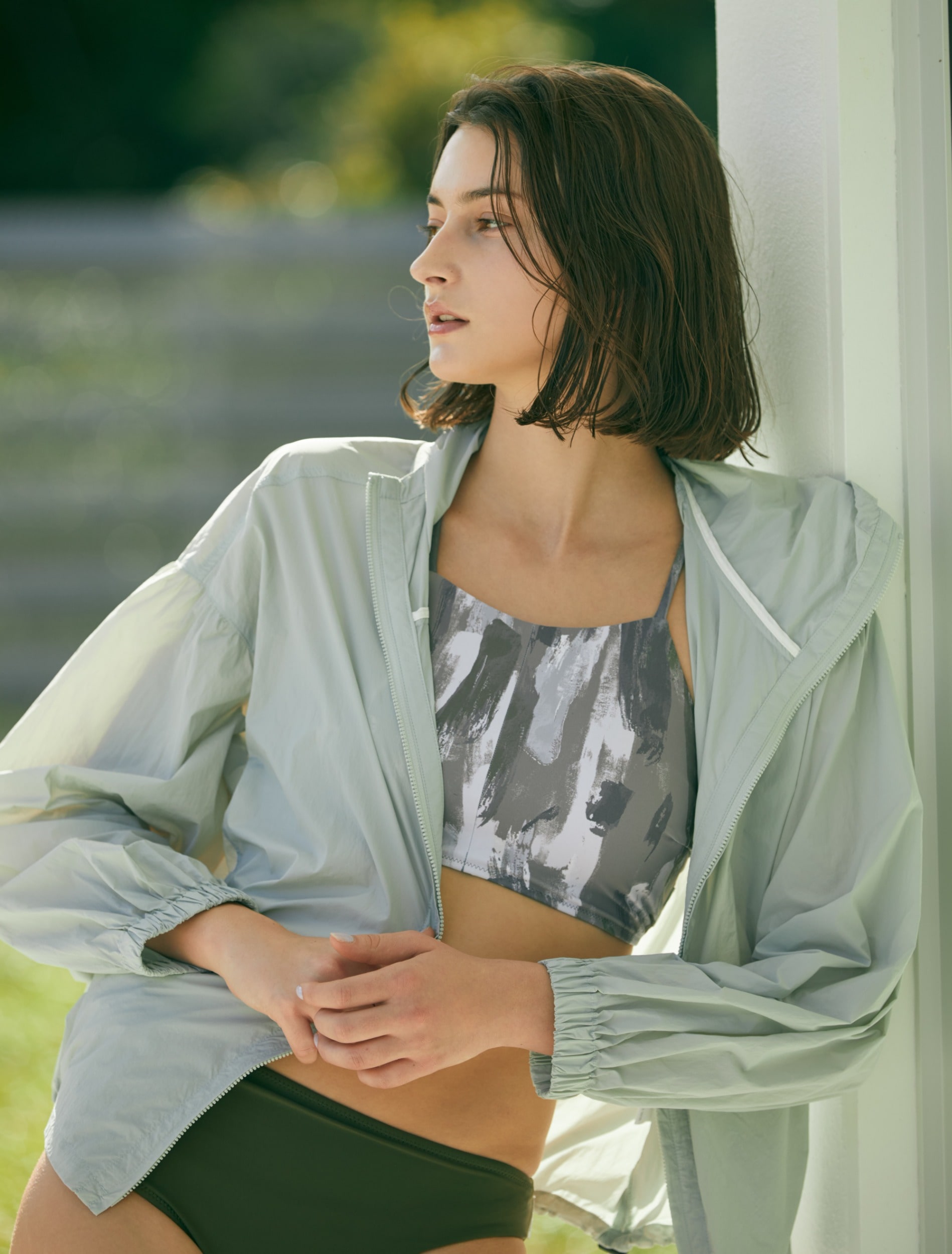 スイムウェアの上から、軽やかに羽織れるアウターは、日差し対策もバッチリ。