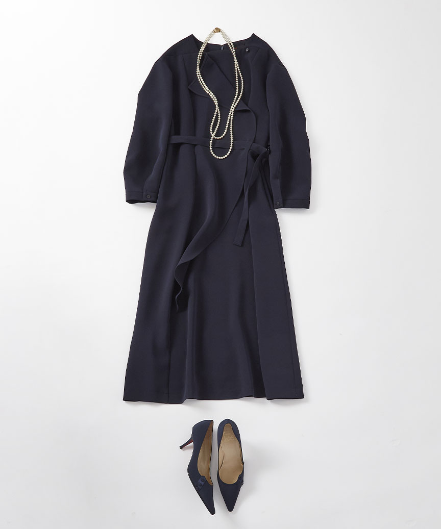 いずれにせよ、紺の上品な色合いとドレッシーな素材感に自然と背筋が伸びます。