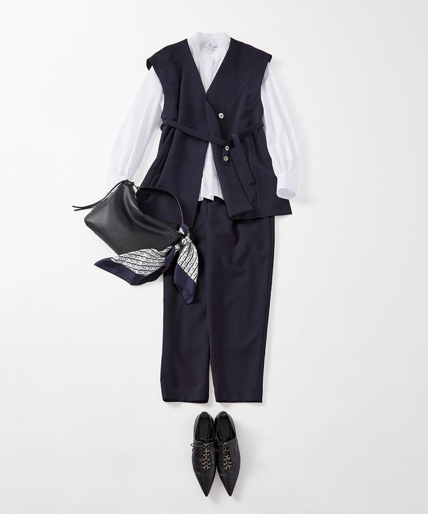 ネイビー×白の清潔感が際立つセットアップスタイル。夏は、Tシャツやノースリーブにもバランスよく着こなせるジレ。オフィススタイルはもちろん、デニムスタイルもアップデートしてくれます。