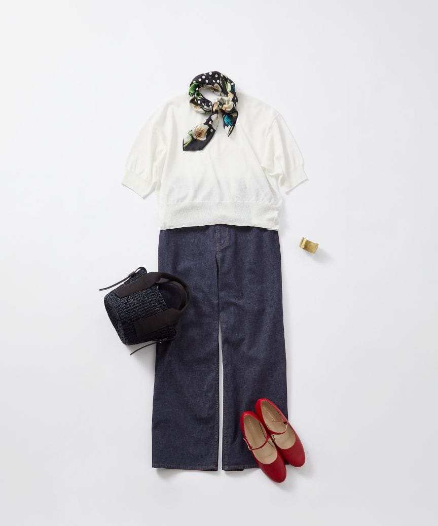 まさにTシャツ×デニムさながらのスタイルも上質素材のニットだからシックで気品が漂います。 少し短めの丈が美バランスに。 ジャケットをオンしても素敵。赤のシューズやスカーフで遊んでハッピーに。