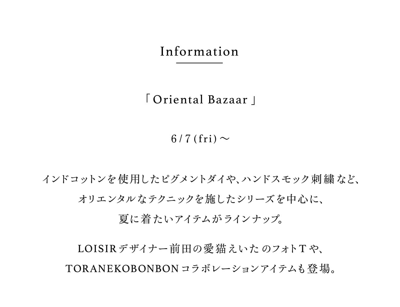 掲載アイテム一覧はこちら すべてのアイテムはこちら LOISIR LOISIR STORE NEWS 6/7(金)より各店舗にて<Oriental Bazaar>がスタート!オリエンタルなテクニックを施したアイテムがラインアップ! 2024.06.03 LOISIR NEW ITEMS #07 \先行受注受付中/7月お届けアイテムがラインアップ 2024.06.03