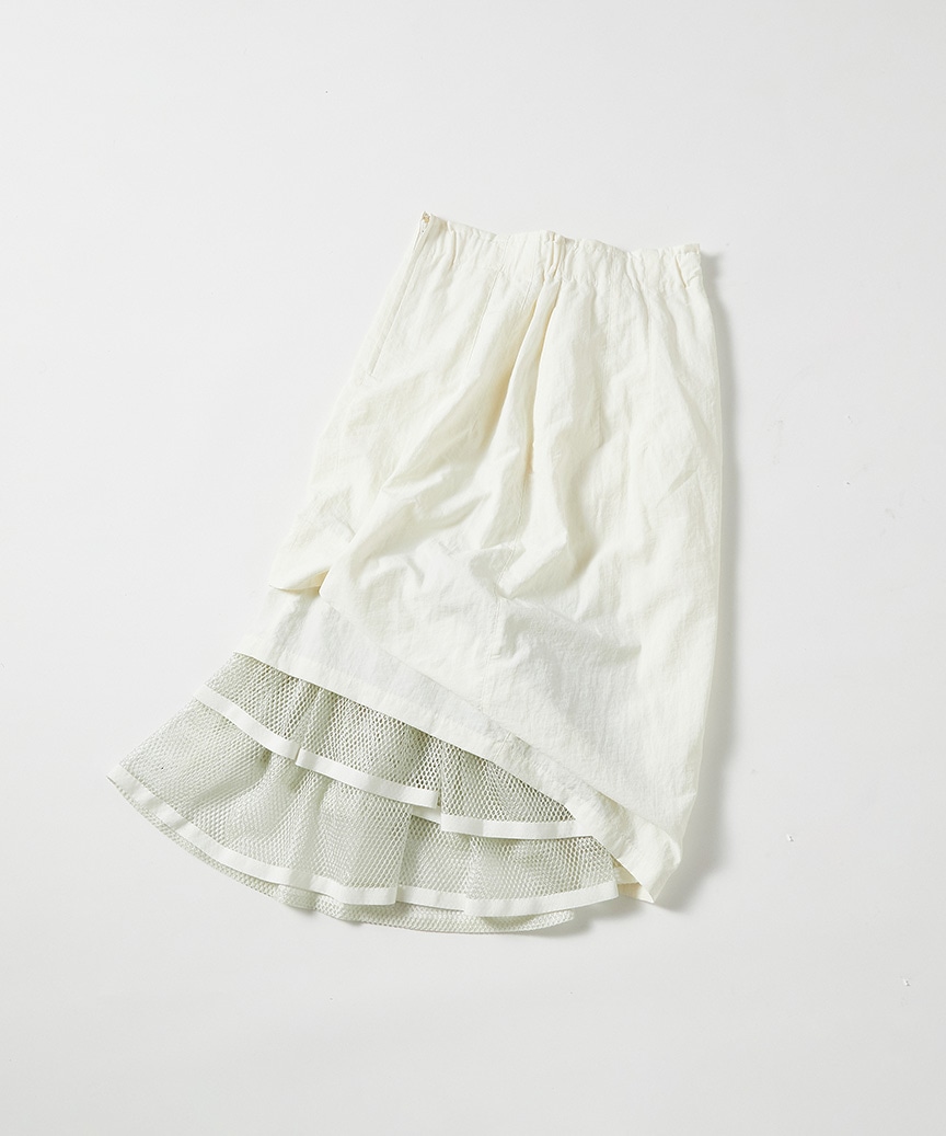 裾からのぞくビッグメッシュフリルが華やかな印象のバレル型スカートです。張りのあるメッシュは漁網由来のリサイクルナイロンです。