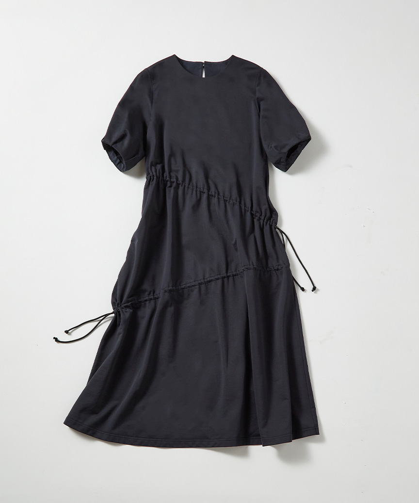 ボリュームスリーブドレスは、身頃は斜めに入ったドロスト仕様でシルエットの変化を楽しめます。
