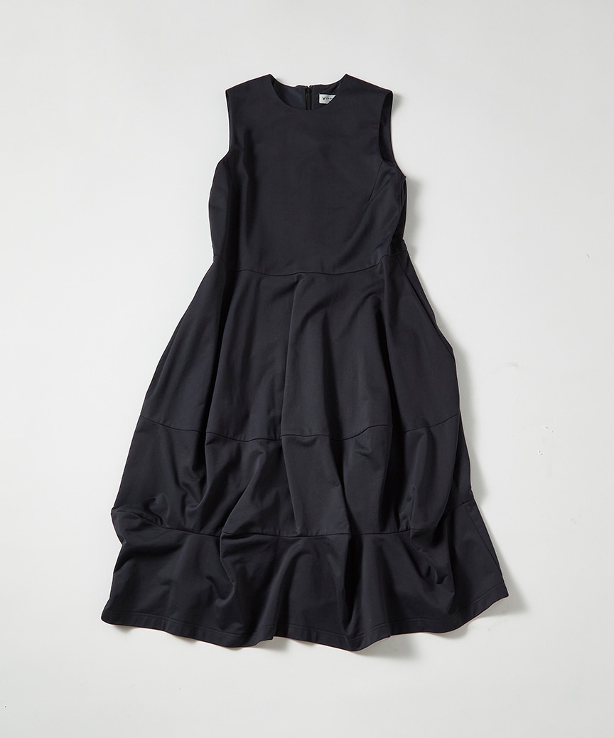 身頃はコンパクトでスカートはバレル型の分量感のあるフォルムがポイントのノースリーブドレス。