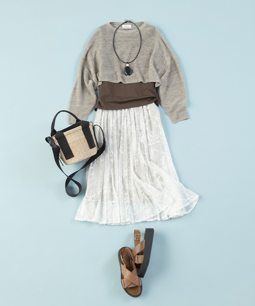 リーフ柄が施されたメッシュレースのプリーツスカートに、ストライプに見える透かし柄を表現したリネンのニットを合わせて。