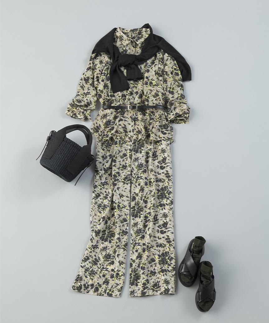 トレンド感のあるレトロな花柄のブラウスとパンツをセットアップで。