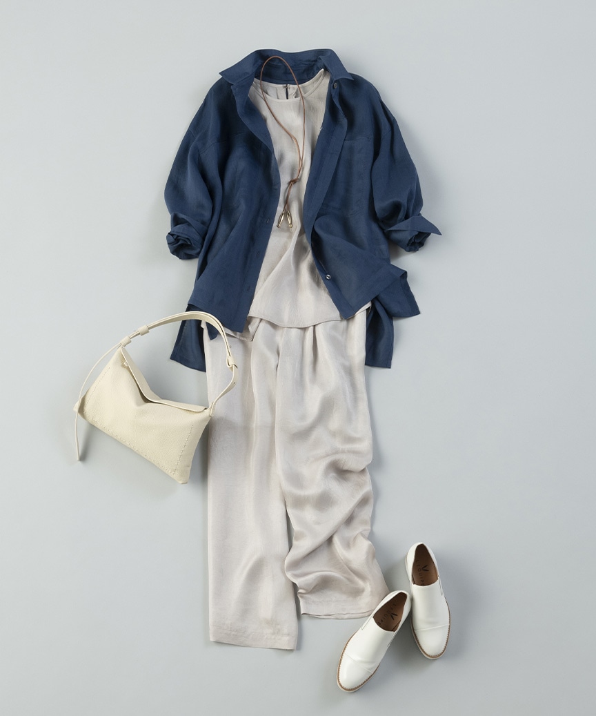 ツヤ感がリッチなベージュのセットアップに、深みのあるブルーのリネンシャツを羽織った上品なパンツスタイル。