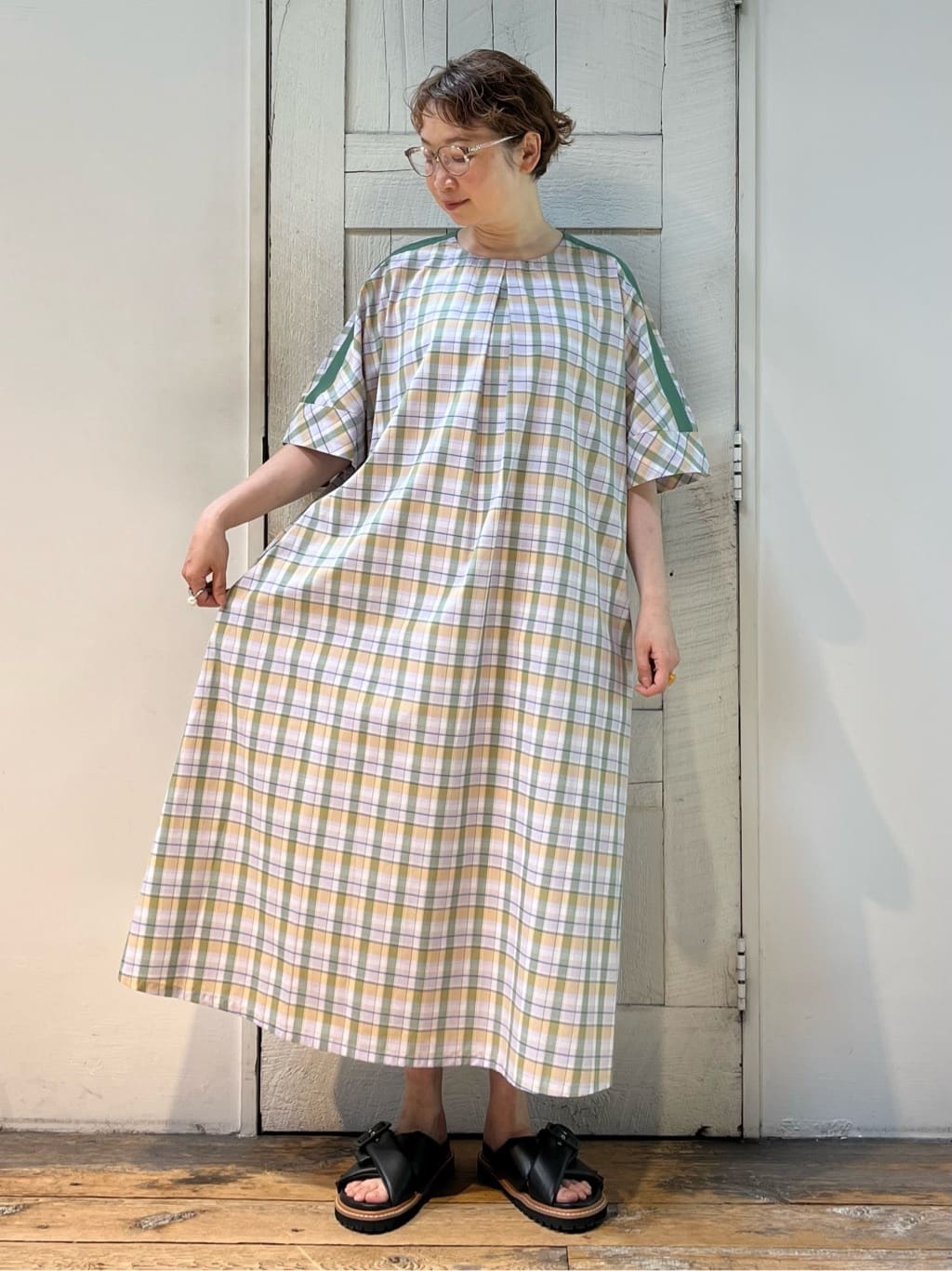 グリーンとパープルの爽やかなチェック柄が 初夏にぴったりの「マドラスビュー」シリーズ。 綿ポリエステル素材が軽やかな見た目を作っています。 一枚でも着やすいポケット付きのワンピースは 2サイズ展開なので、お好きな長さのサイズで お選びいただけます。 ▼着用アイテム▼