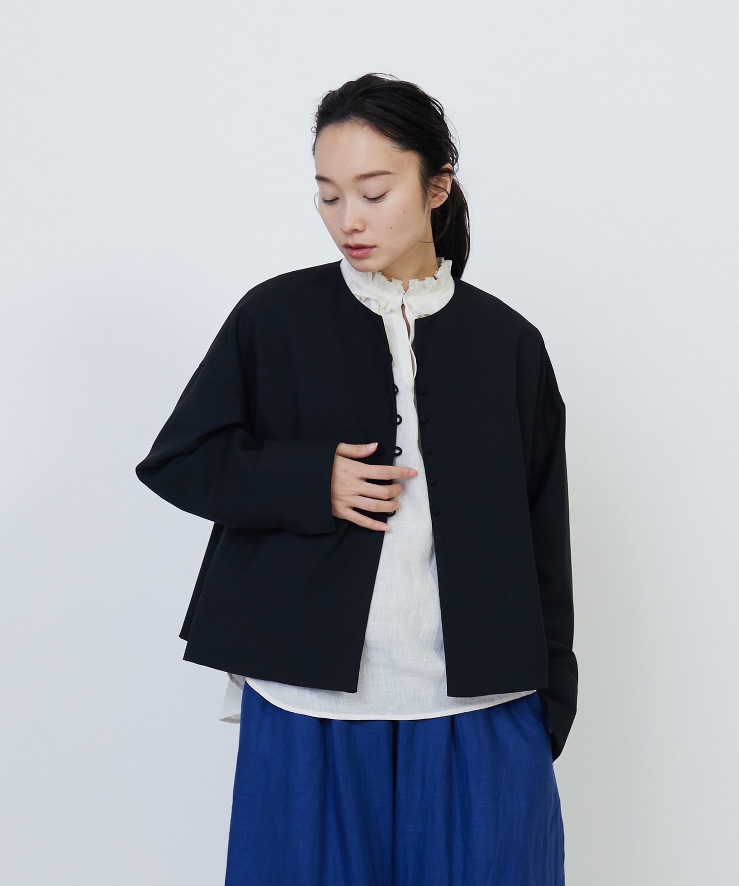 細番手のウール梳毛糸とポリエステル糸を平織したトロピカルクロスを使用。ポリエステル糸には一部リサイクル糸を用いエコロジカルな素材です。トロピカルクロスは通気性があり、薄くてコシがあるのが特徴で通年着用出来ます。