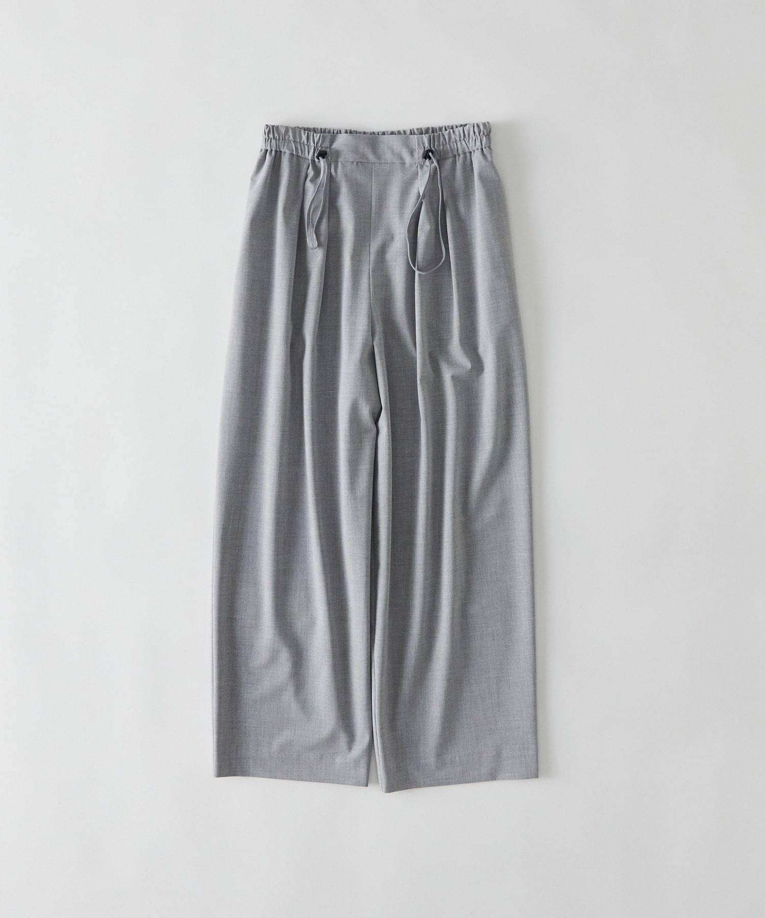 きれい目なワイドパンツをイージーに仕上げたアイテム。裾に向けてストンと落ちたシルエットです。ウエストはゴム仕様に加えてドローストリングがデザインのポイントになっています。