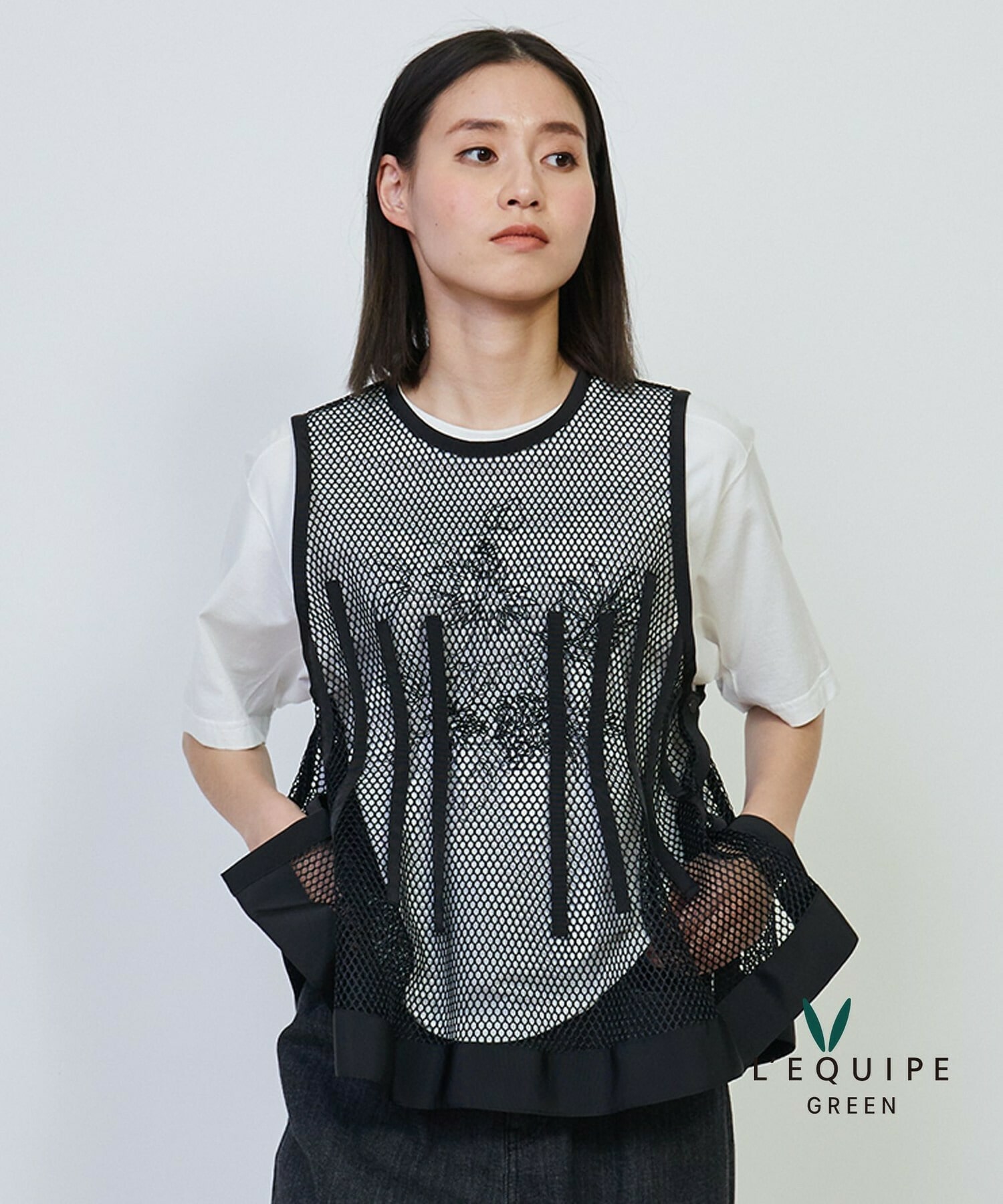 これまで廃棄されるほか使い道のなかった使用済の漁網を再生して新たな服へ変換する「漁網アップサイクル企画」。張りのあるメッシュは、漁網由来のリサイクルナイロンです。