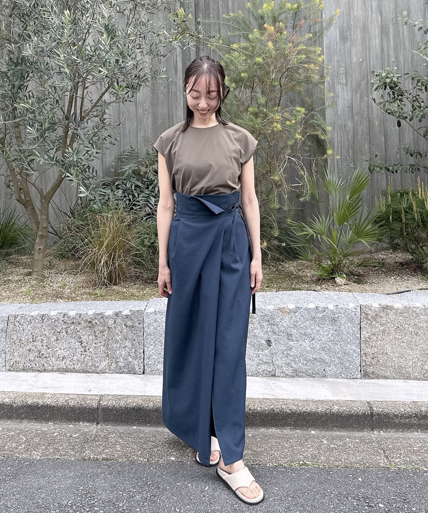 吸水速乾・UVカット・ストレッチ性に優れたトップスと、ドライタッチで接触冷感のスカートを合わせた快適スタイル。スカートはシワになりにくく、ハイウエストデザインでウエスト位置を高く見せ、脚長効果も◎。カーキ×ネイビーのシックな配色で、ヨガやお出かけ時にも品よく映えるスタイリングです。