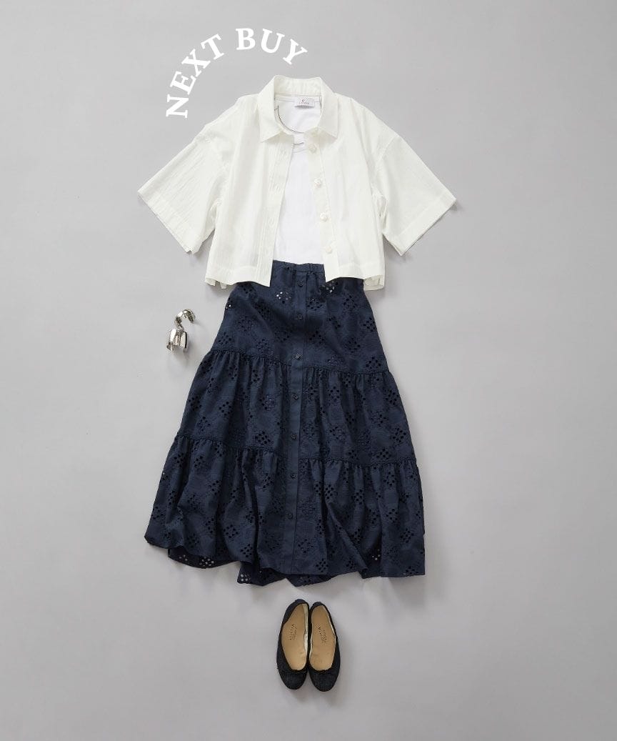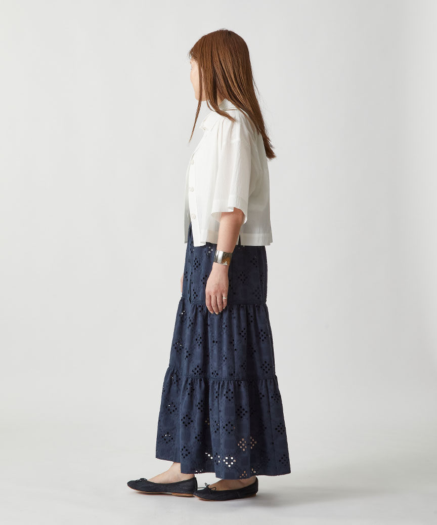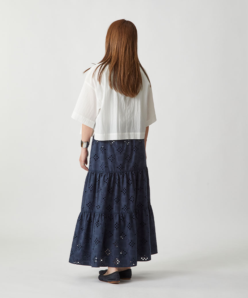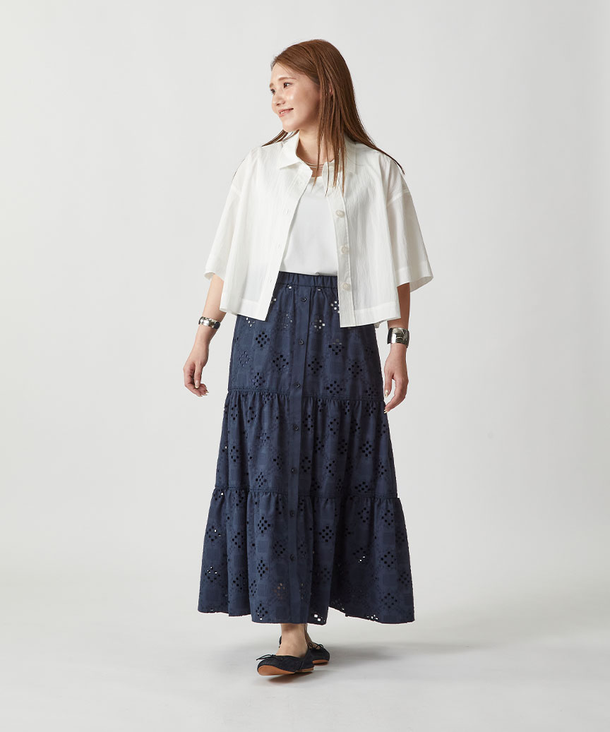 ブラウスの着丈が短めなので、ロング丈のスカートでバランスよく着こなしました。