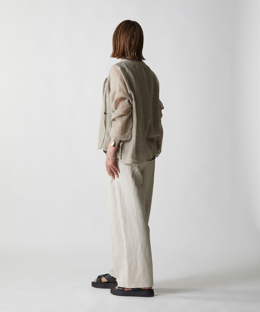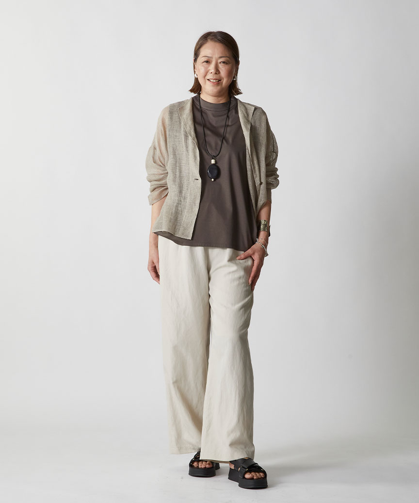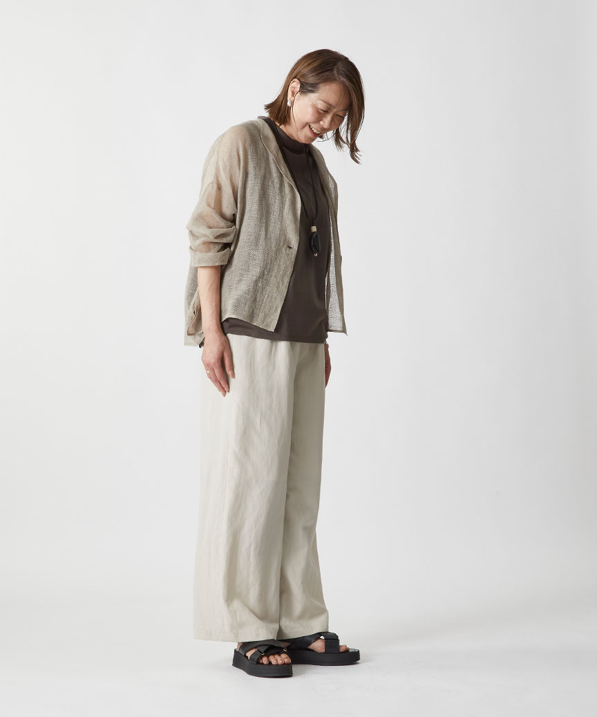ジャケットの透け感を活かして、程よいリラックス感のあるボトムを合わせてみました。全体のトーンも意識したナチュラルなコーディネートに。