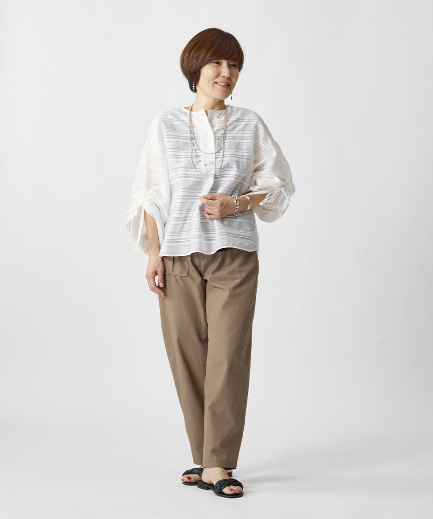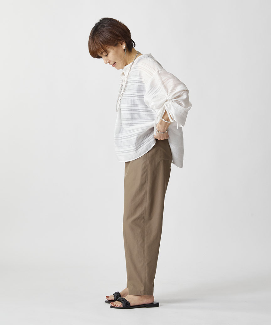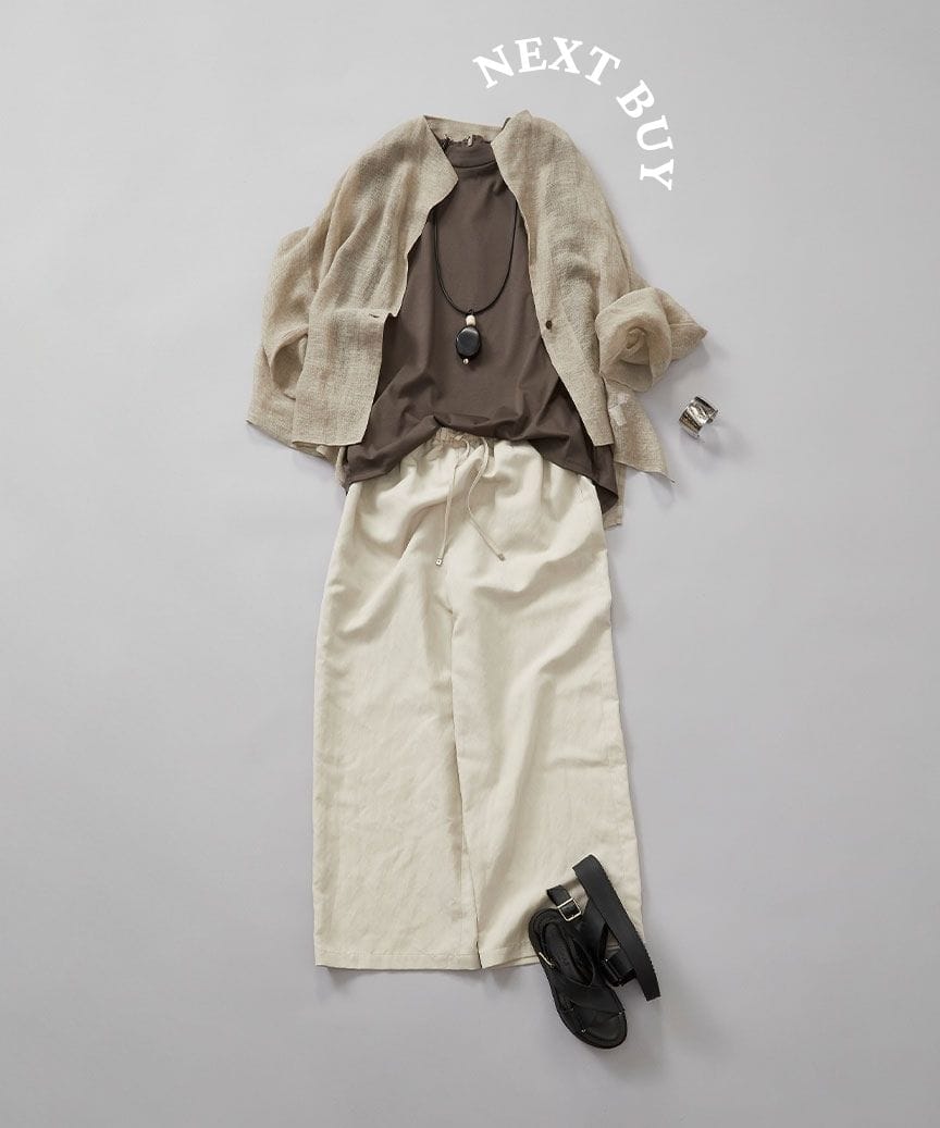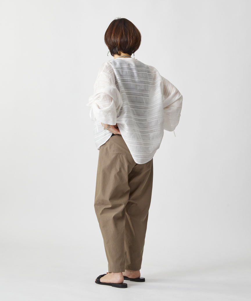 ジャケットの透け感を活かして、程よいリラックス感のあるボトムを合わせてみました。全体のトーンも意識したナチュラルなコーディネートに。