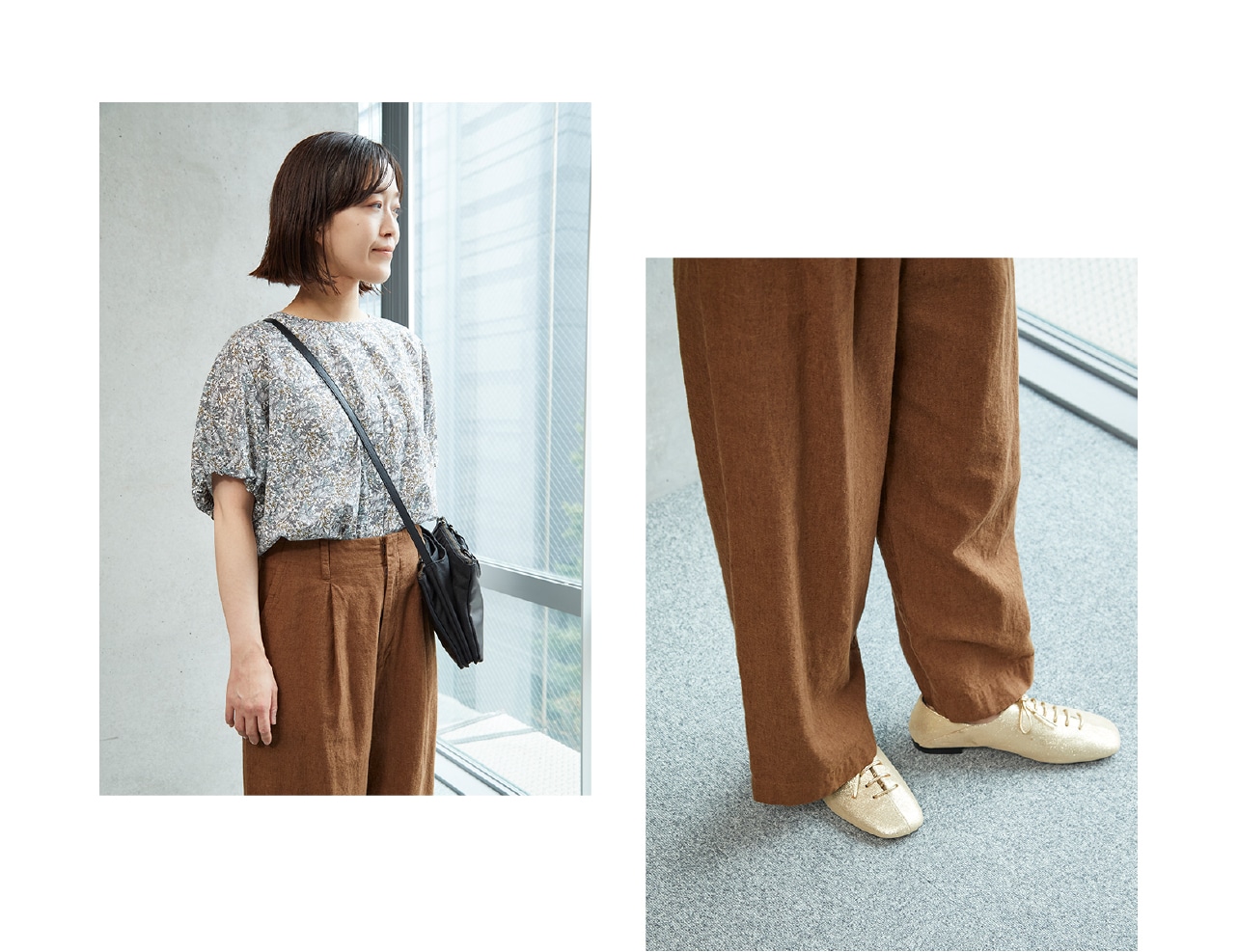 ノースリーブブラウスとコットンリネンのワイドパンツを