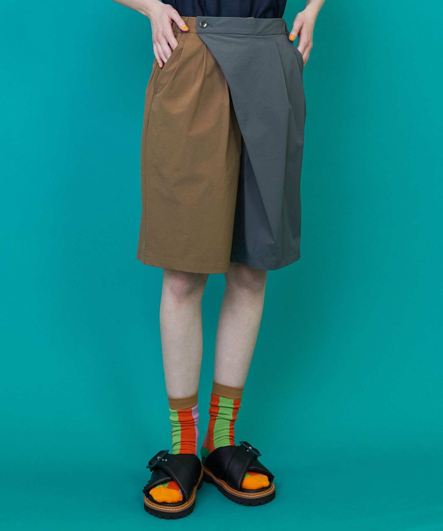 巻きパンツのようなデザインのショートパンツは、バイカラーと風になびく軽い素材が特徴。 トップスも薄手のサラッとしたブラウスを合わせて、見た目も涼し気なスタイルに。 Tシャツではなく、ブラウスをチョイスする事で大人カジュアルスタイルの完成。 今年の暑い夏にマストバイなアイテムです!