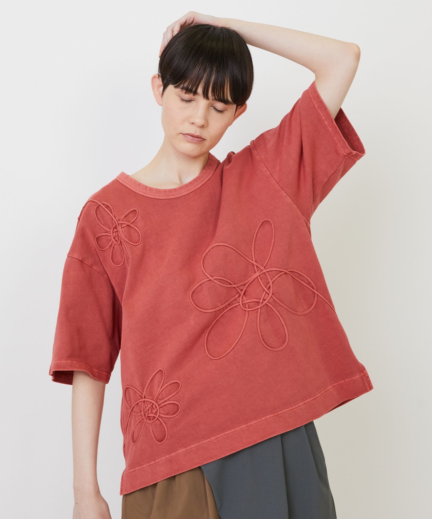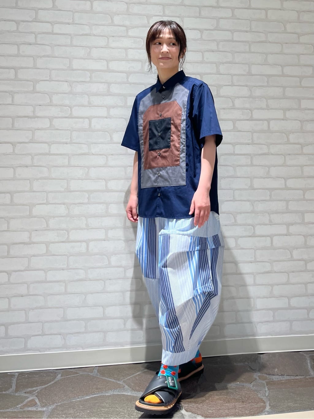 フラボアらしいカラーパネルの組み合わせで「ターゲット(=的)」を表現した半袖の綿シャツ。 ボトムもボリュームとシルエットにこだわったフラボアらしいアイテムを合わせました。 どちらもユニセックスサイズ展開なので、男性にもおすすめしたいフラボアの夏コーデです。